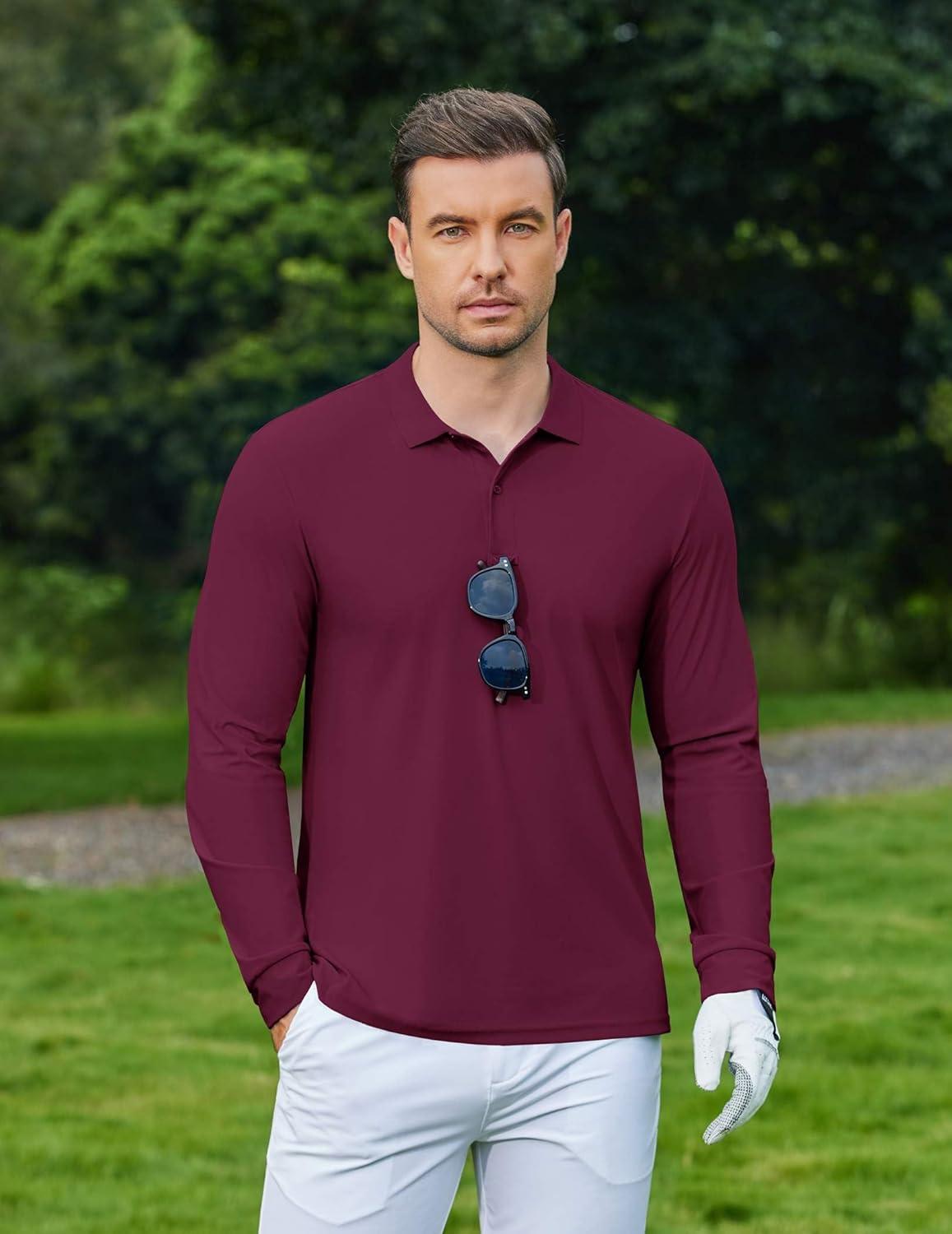 COOFANDY Men’s Long Sleeve Polo Shirts Moisture Wicking Golf Shirts Athletic Collared Shirt Lightweight Cooling Shirt(Wine Red)