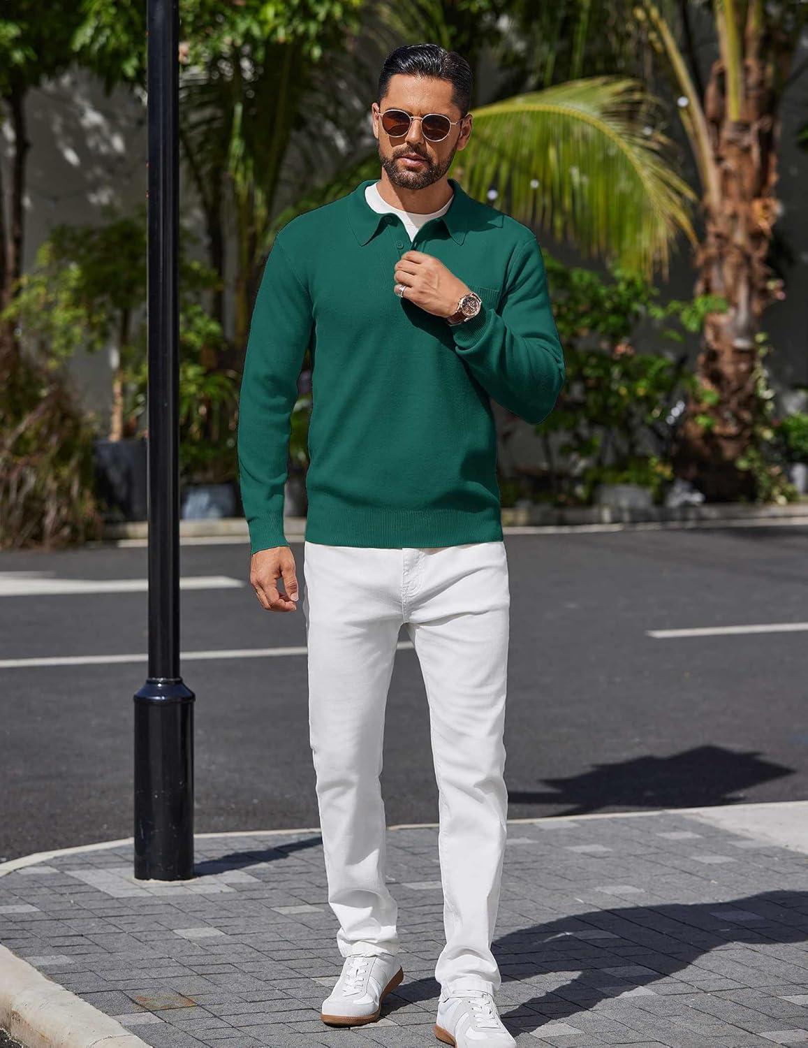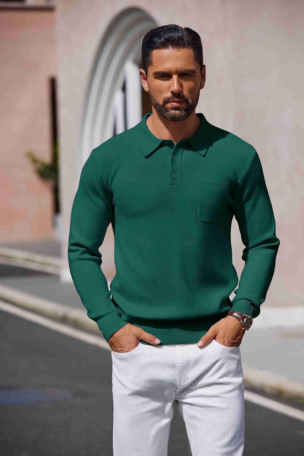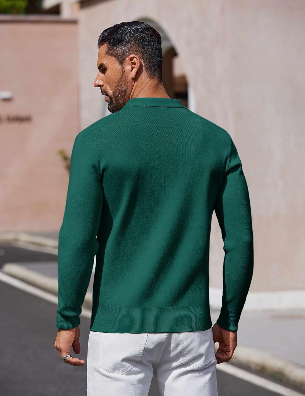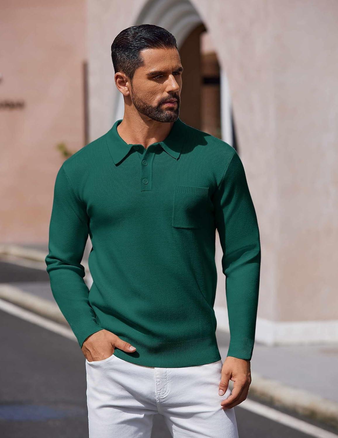 COOFANDY Mens Long Sleeve Polo Sweater Knit Polo Casual Heavyweight Thermal Pullover Sweater with Pocket(Green)