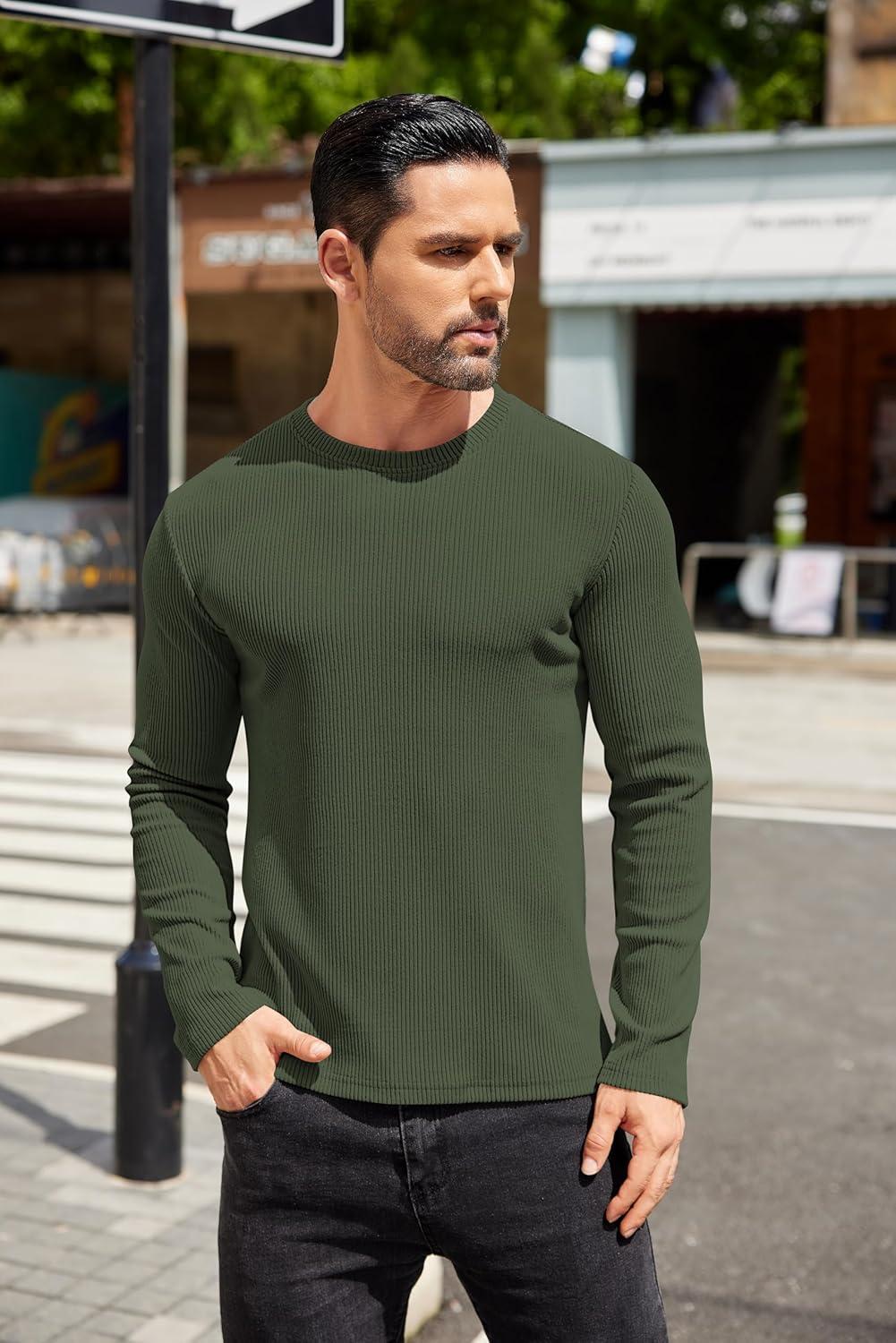 COOFANDY Mens Long Sleeve Shirts Thermal T-Shirt Slim Fit Crewneck Sweater Knitted Pullover Shirt(Army Green)