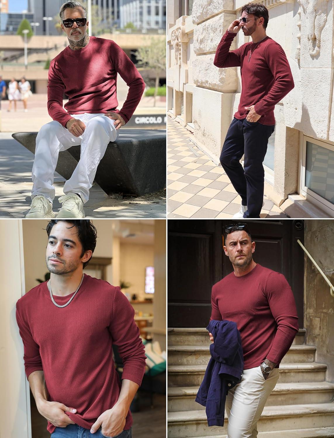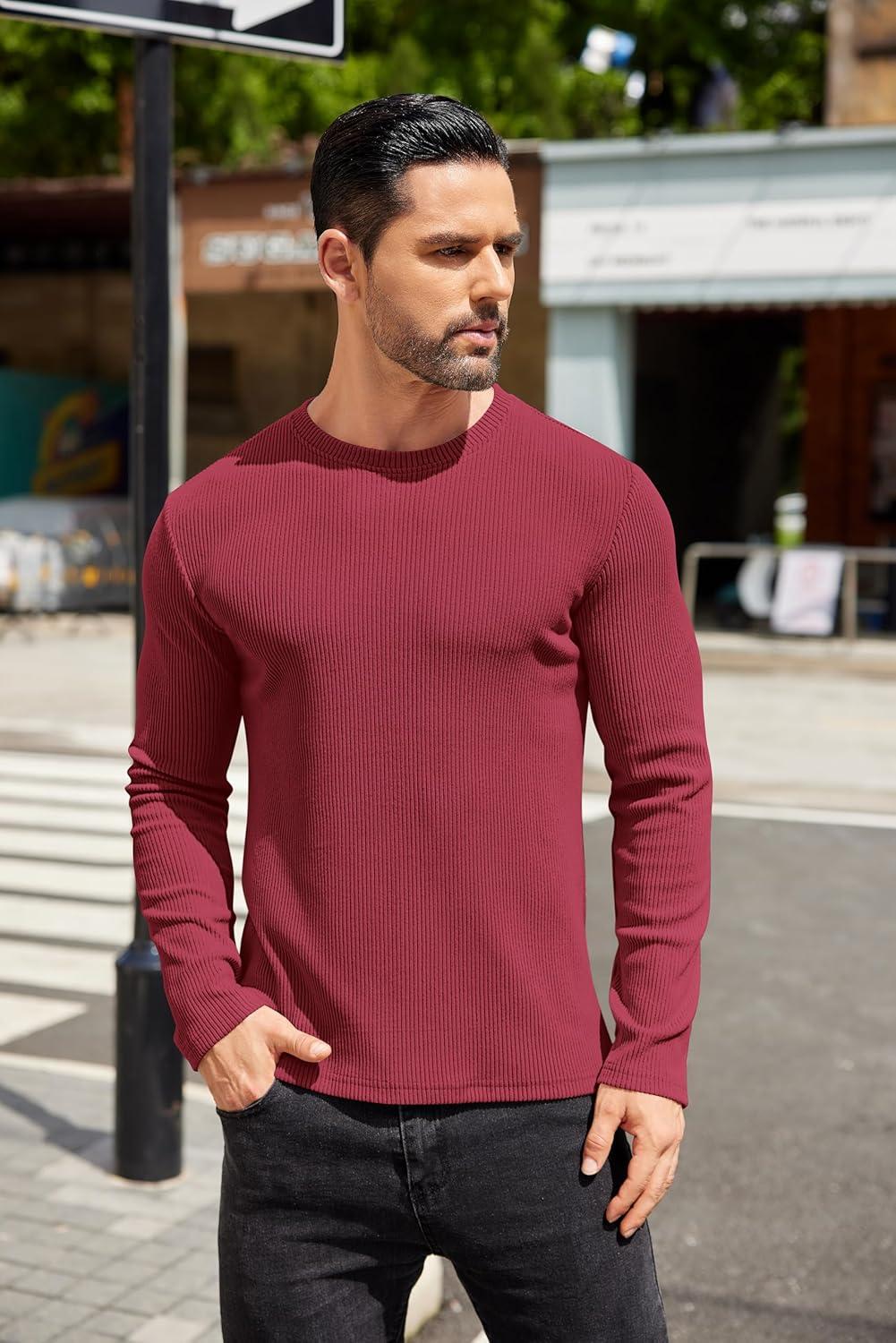 COOFANDY Mens Long Sleeve Shirts Thermal T-Shirt Slim Fit Crewneck Sweater Knitted Pullover Shirt(Wine Red)