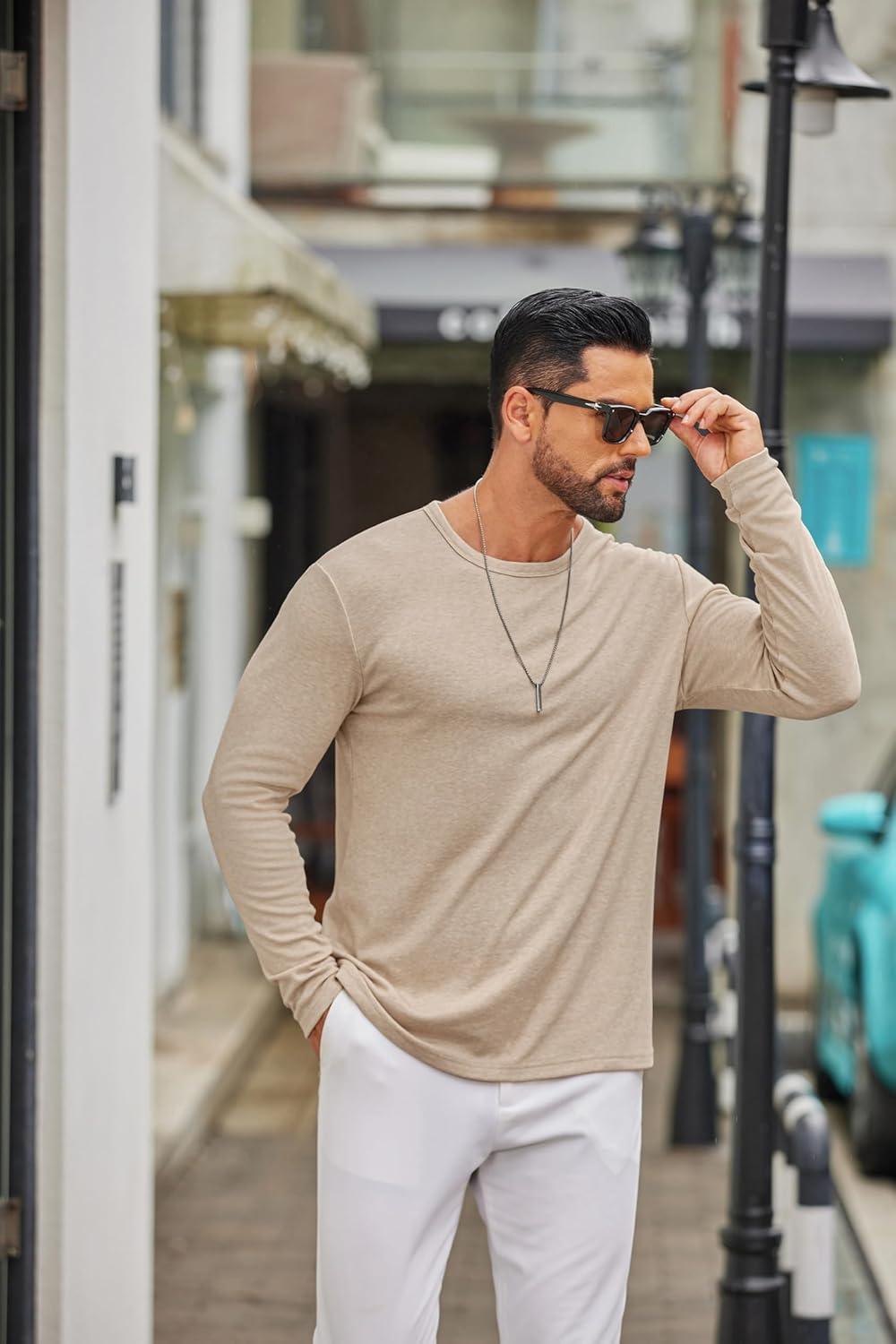 COOFANDY Men’s Long Sleeve Tee Shirts Crew Neck T Shirt Solid Casual Basic Tees Soft Stretch T-Shirts(Light Khaki)