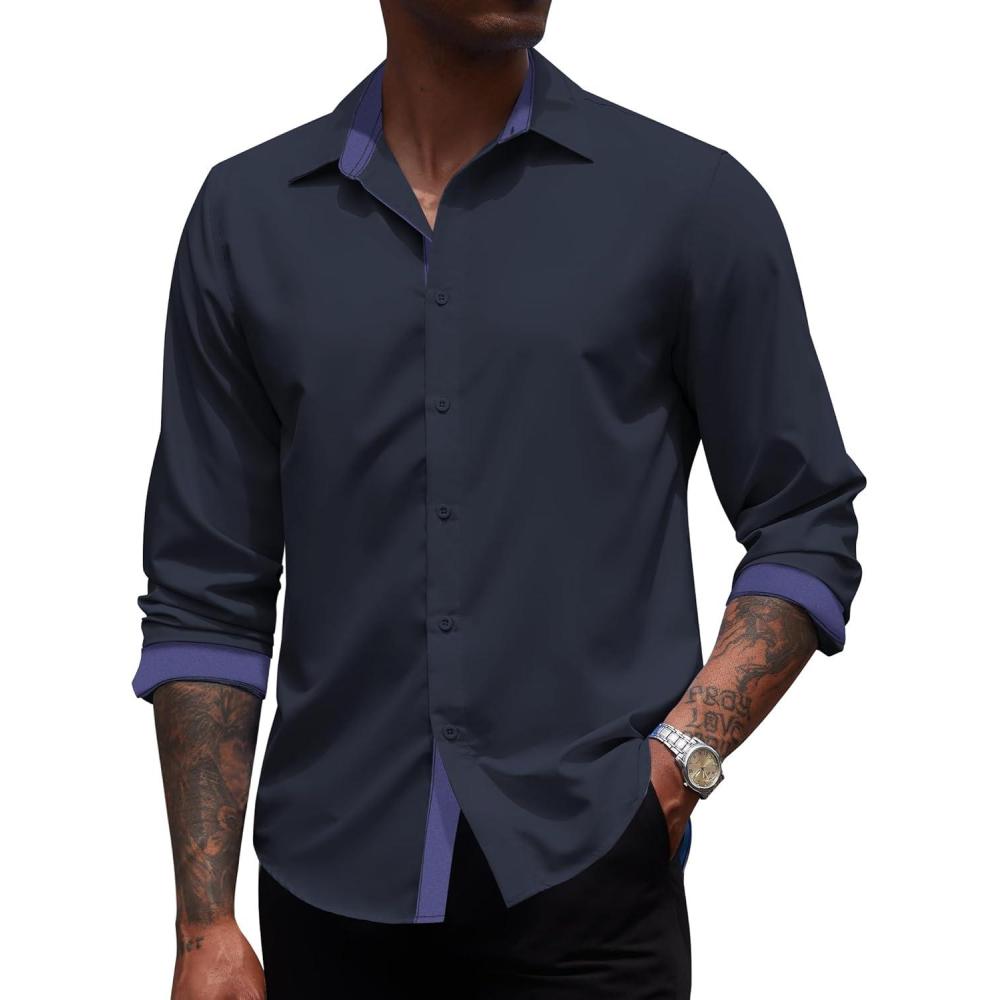 COOFANDY Men’s Long Sleeve Wrinkle Free Dress Shirts Inner Contrast Business Casual Button Down Shirt(Navy)