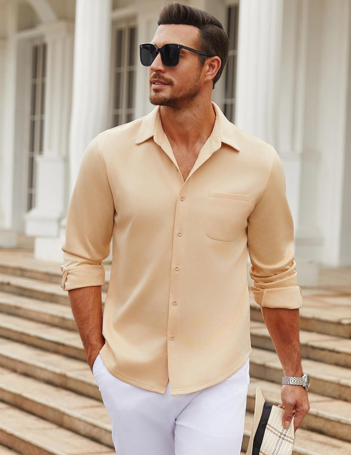 COOFANDY Men's Long Sleeve Wrinkle Free Shirt Casual Button Down Shirts Stretch Dress Shirt with Pocket(Khaki)