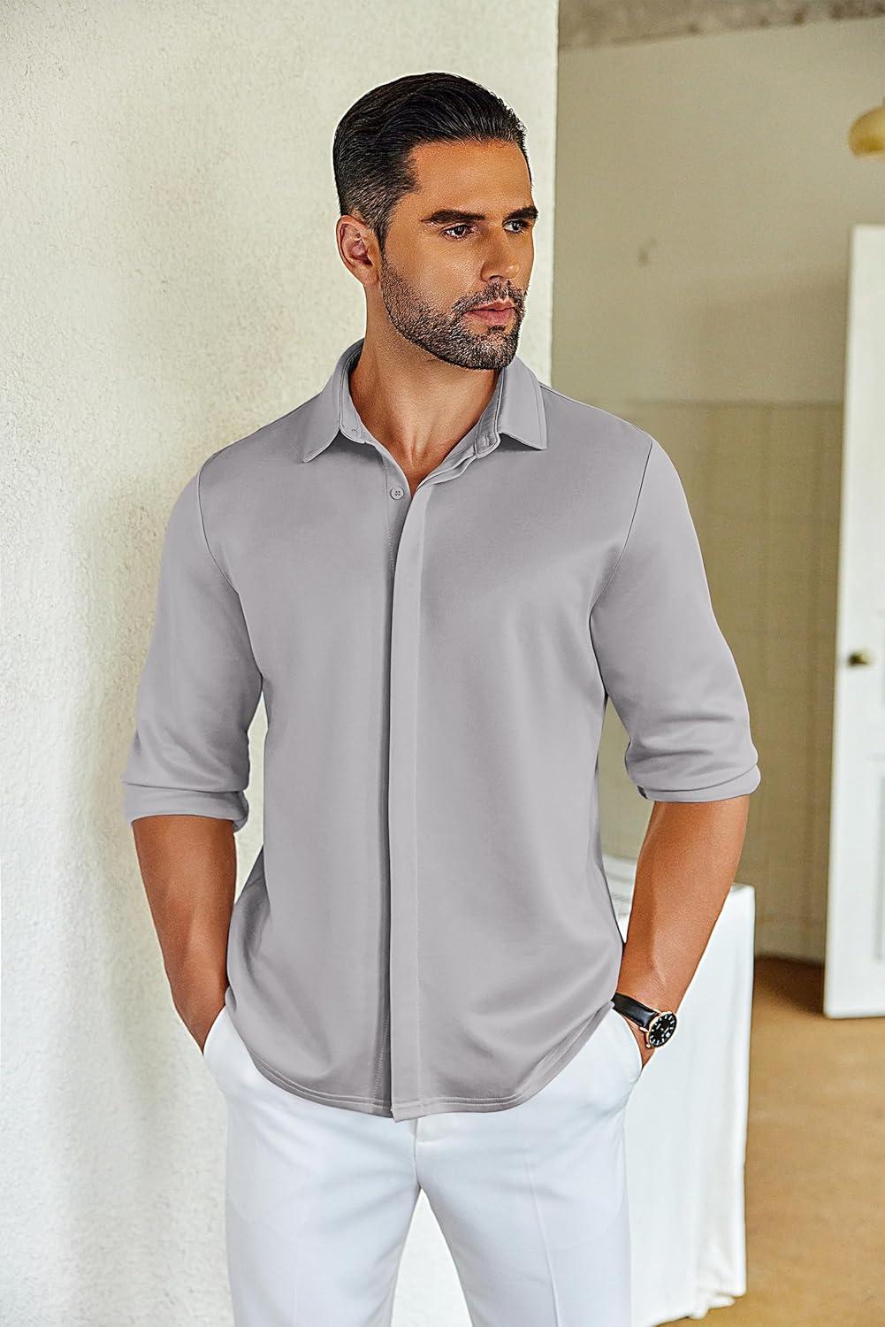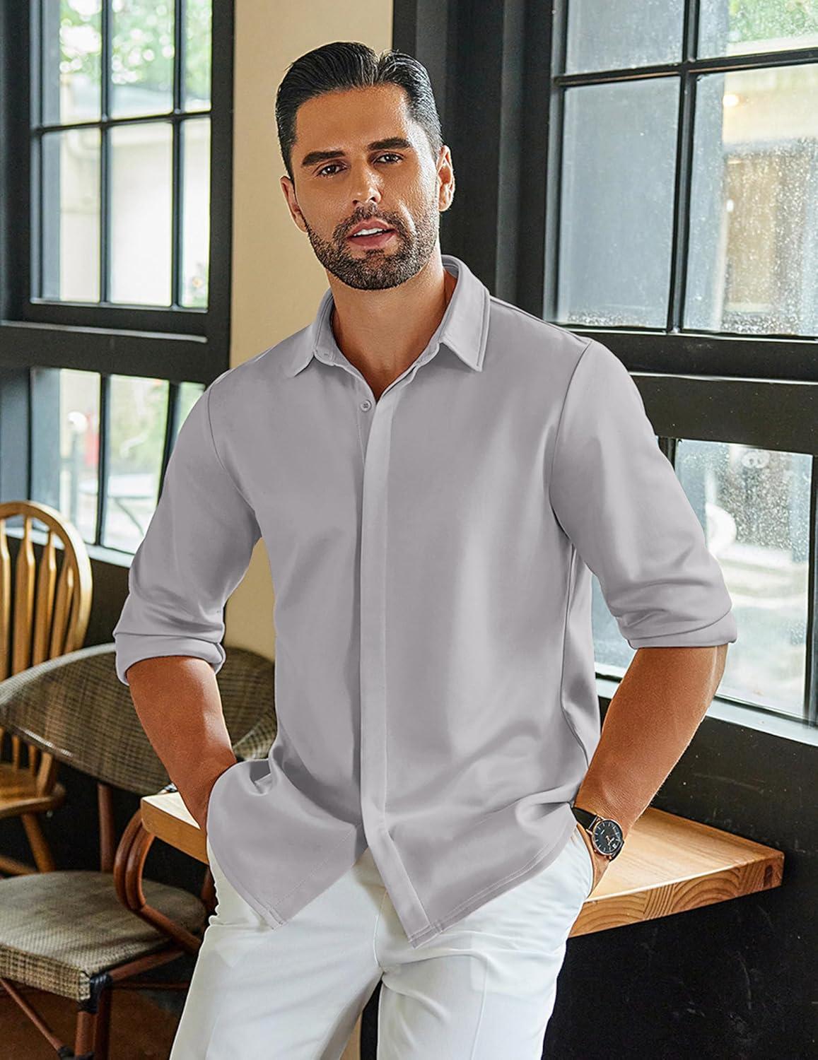 COOFANDY Mens Long Sleeve Wrinkle Free Shirts Casual Button Down Shirt Stretch Dress Shirt(Light Grey)