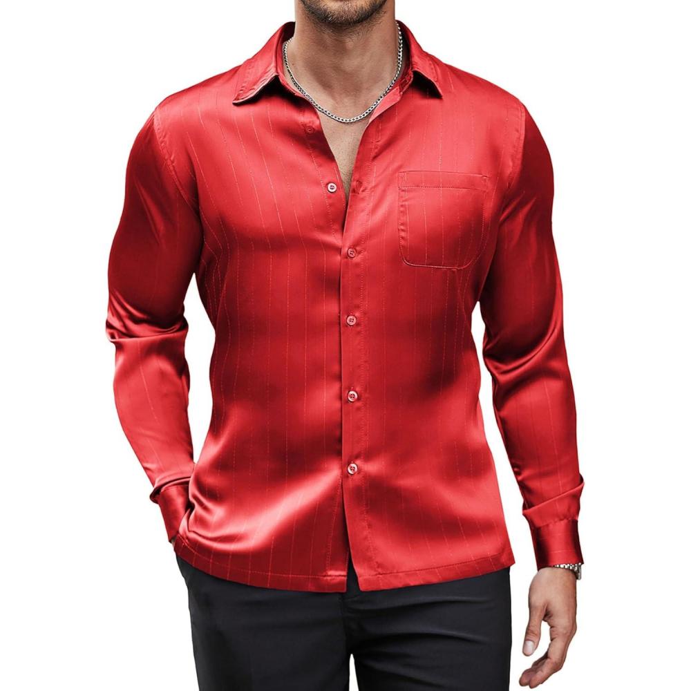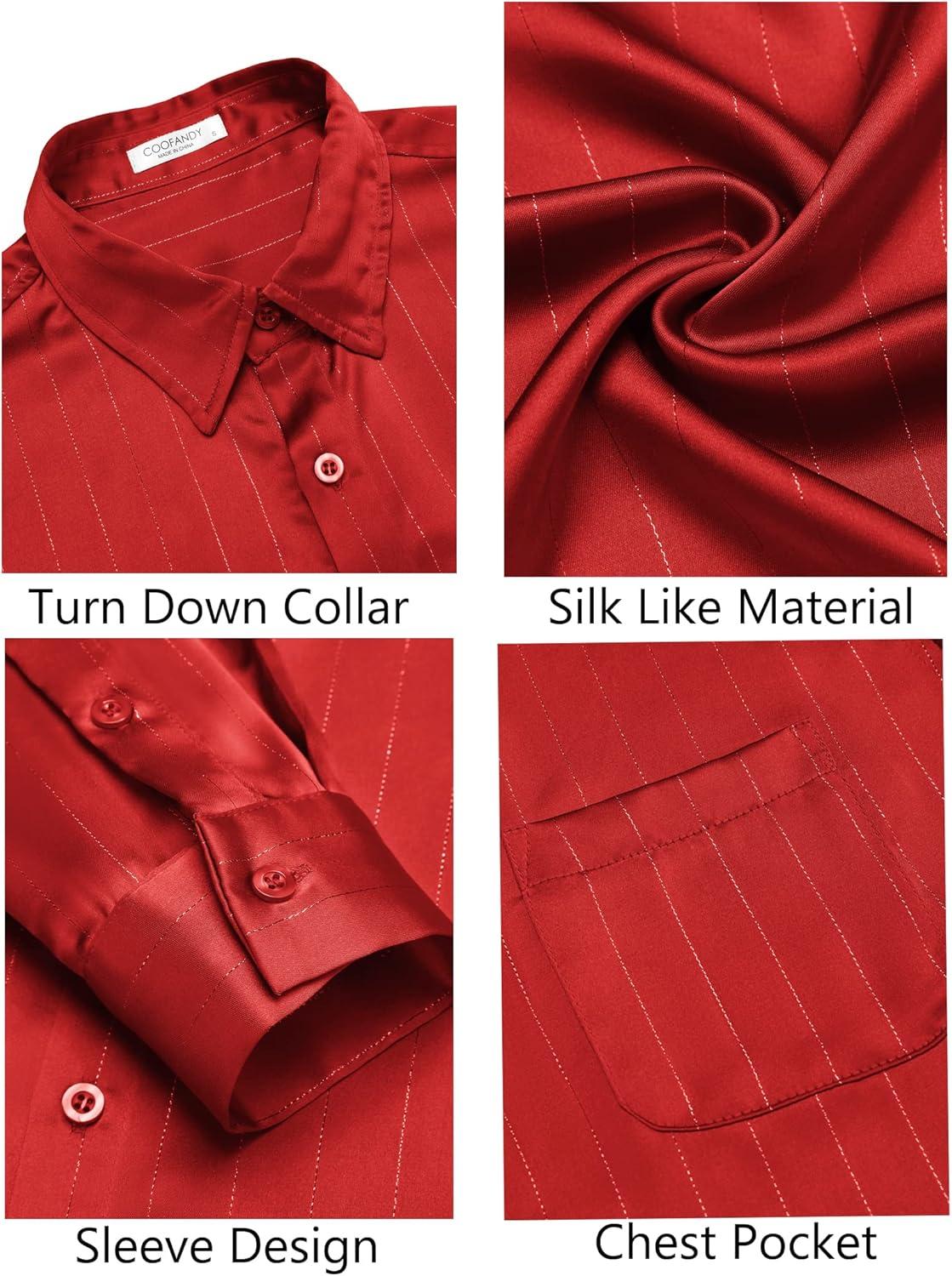 COOFANDY Mens Luxury Satin Dress Shirt Shiny Silk Long Sleeve Button Up Shirts Wedding Shirt Party Prom(Red)