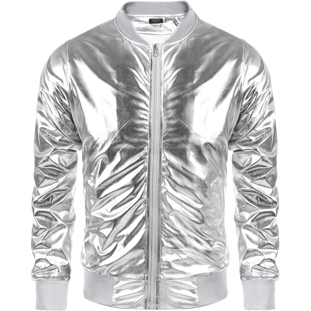 COOFANDY Men's Metallic Jacket 70s Disco Party Varsity Jacket Zip-up Baseball Bomber(02-silver)