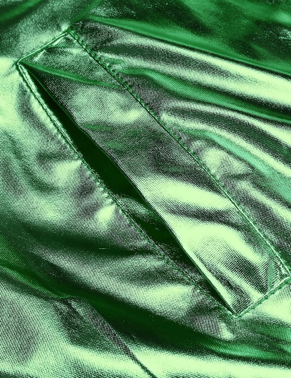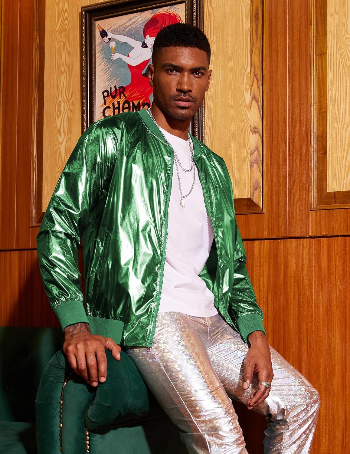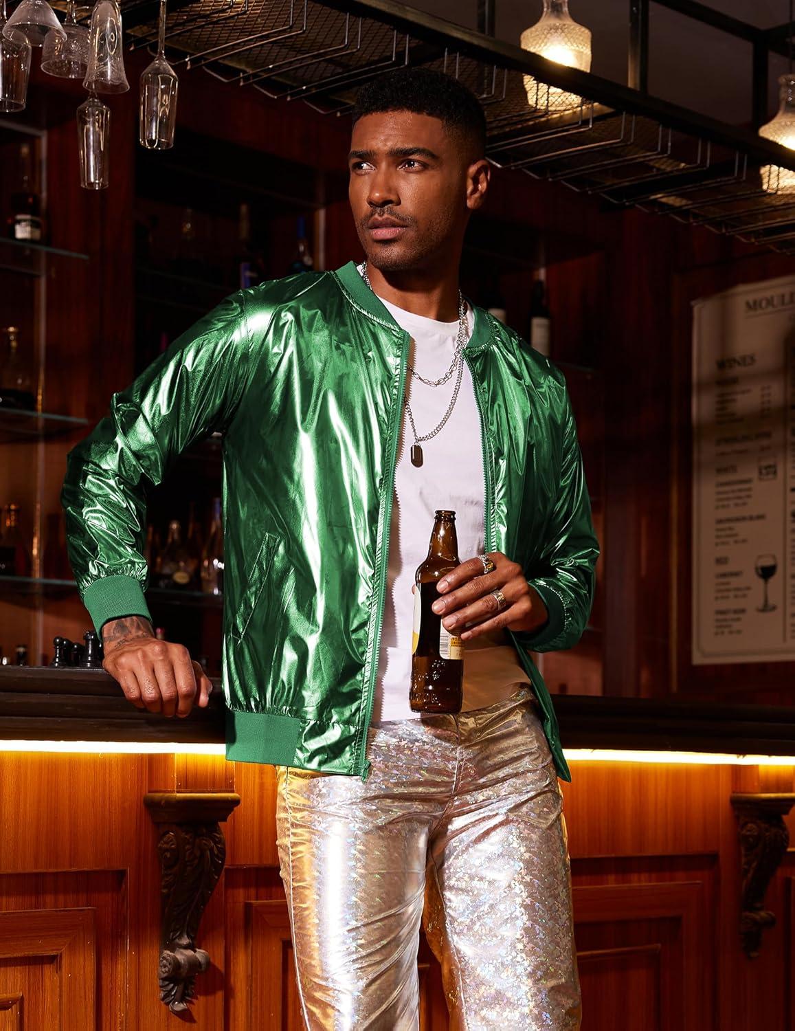 COOFANDY Men's Metallic Jacket 70s Disco Party Varsity Jacket Zip-up Baseball Bomber(Green)