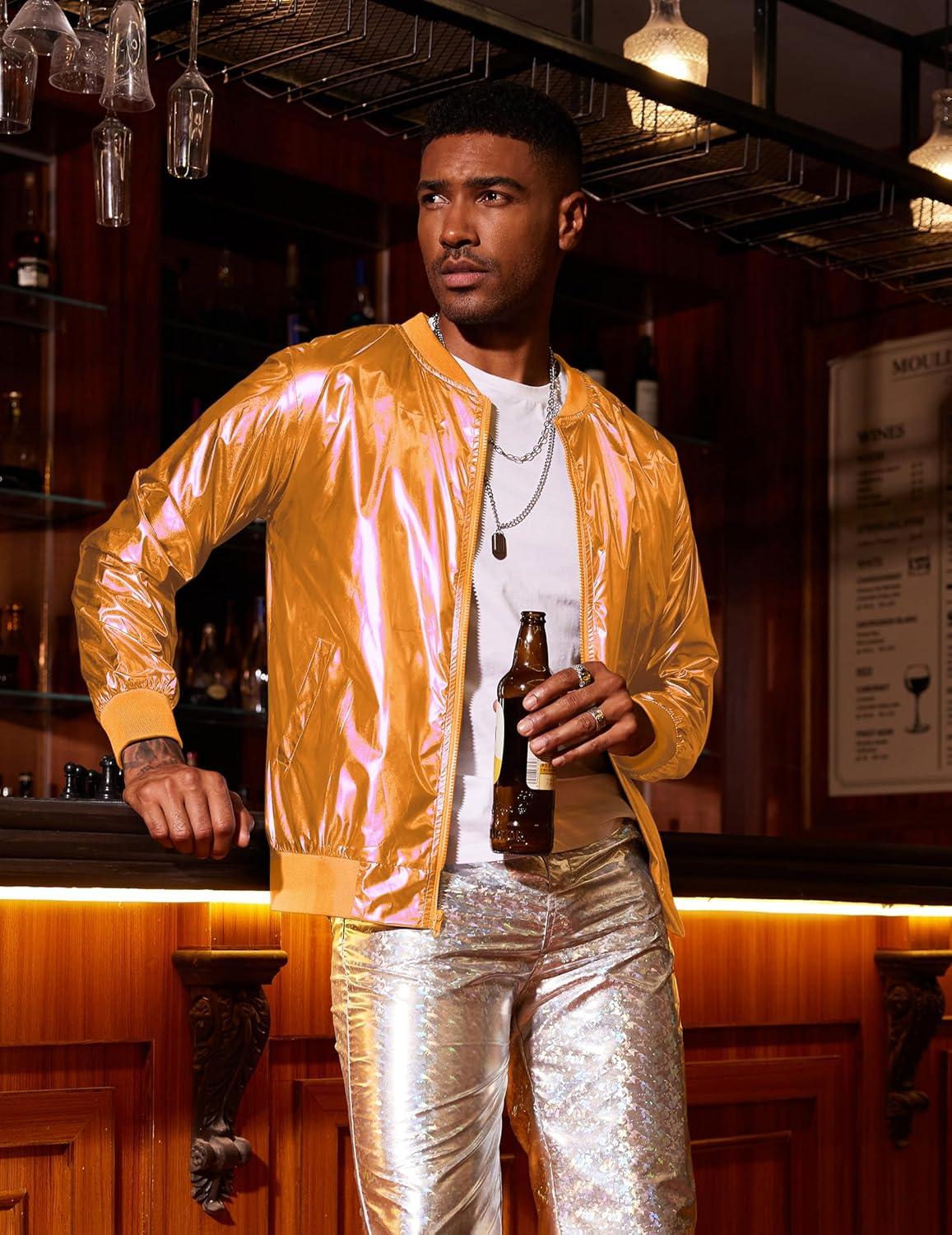 imageCOOFANDY Mens Metallic Jacket 70s Disco Party Varsity Jacket Zipup Baseball BomberOrange