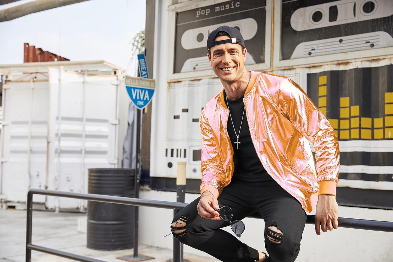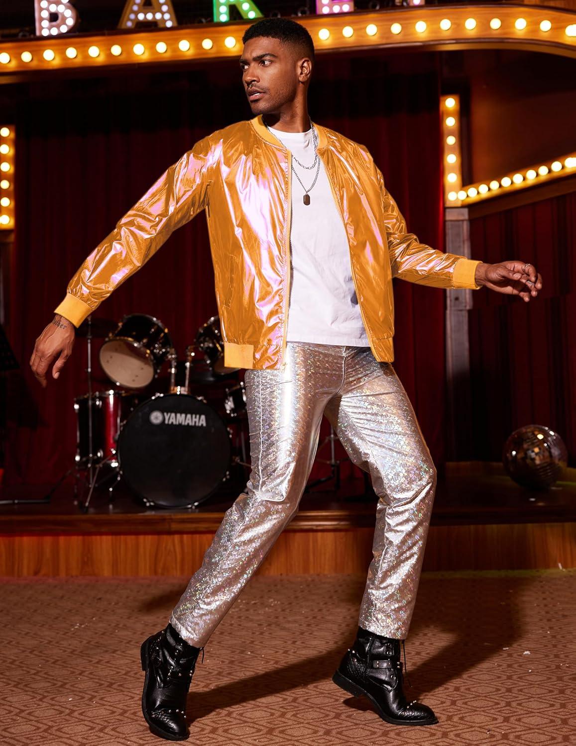 COOFANDY Men’s Metallic Jacket 70s Disco Party Varsity Jacket Zip-up Baseball Bomber(Multicolored)
