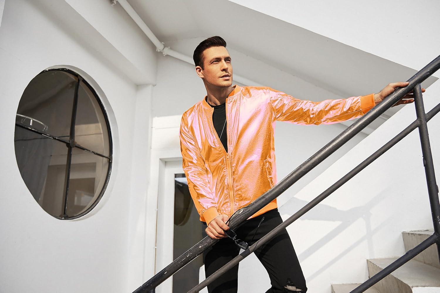 COOFANDY Men's Metallic Jacket 70s Disco Party Varsity Jacket Zip-up Baseball Bomber(Orange)