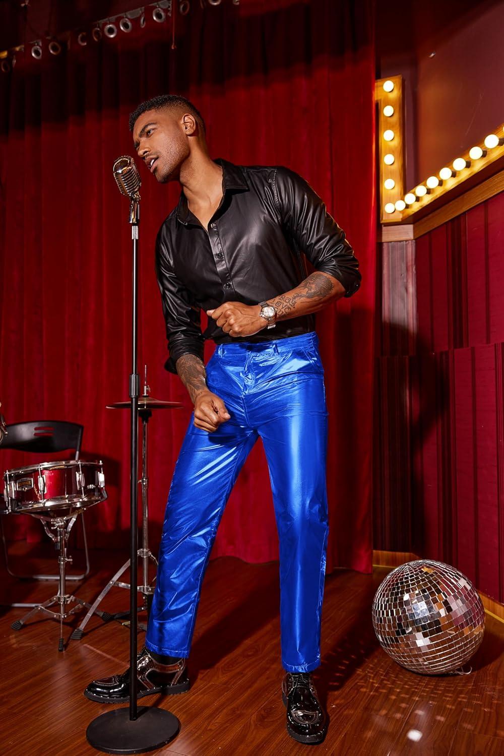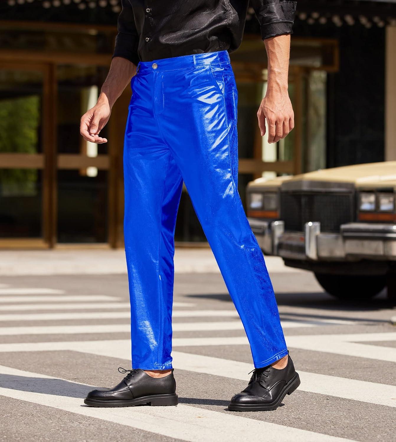 COOFANDY Men’s Metallic Shiny Pants Night Club Pants 70s 80s 90s Disco Pant Party Dance Straight Leg Trousers(Luxurious Blue)