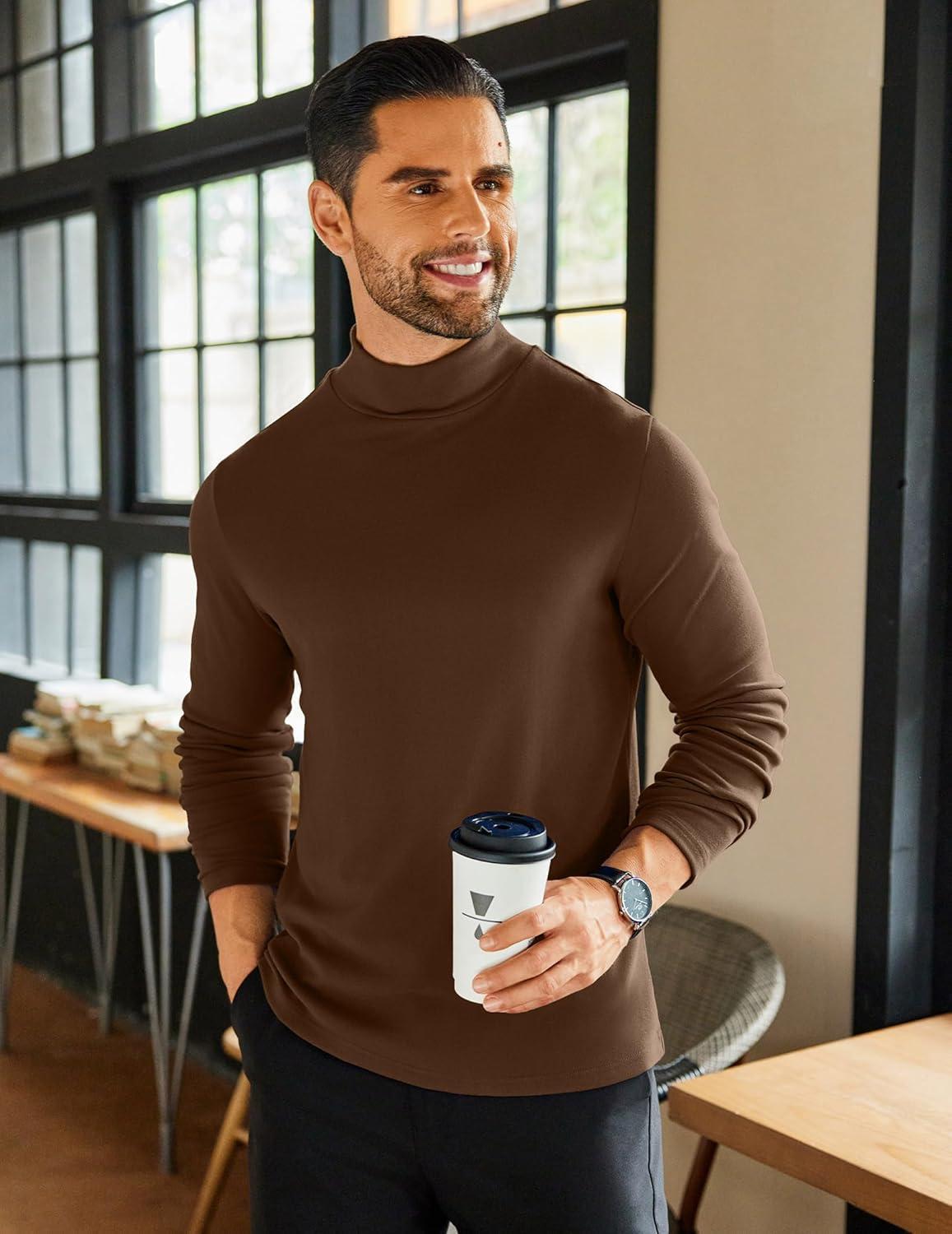 COOFANDY Mens Mock Neck Shirts Fleece Long Sleeve Tops Basic Pullover T-Shirts(Brown)