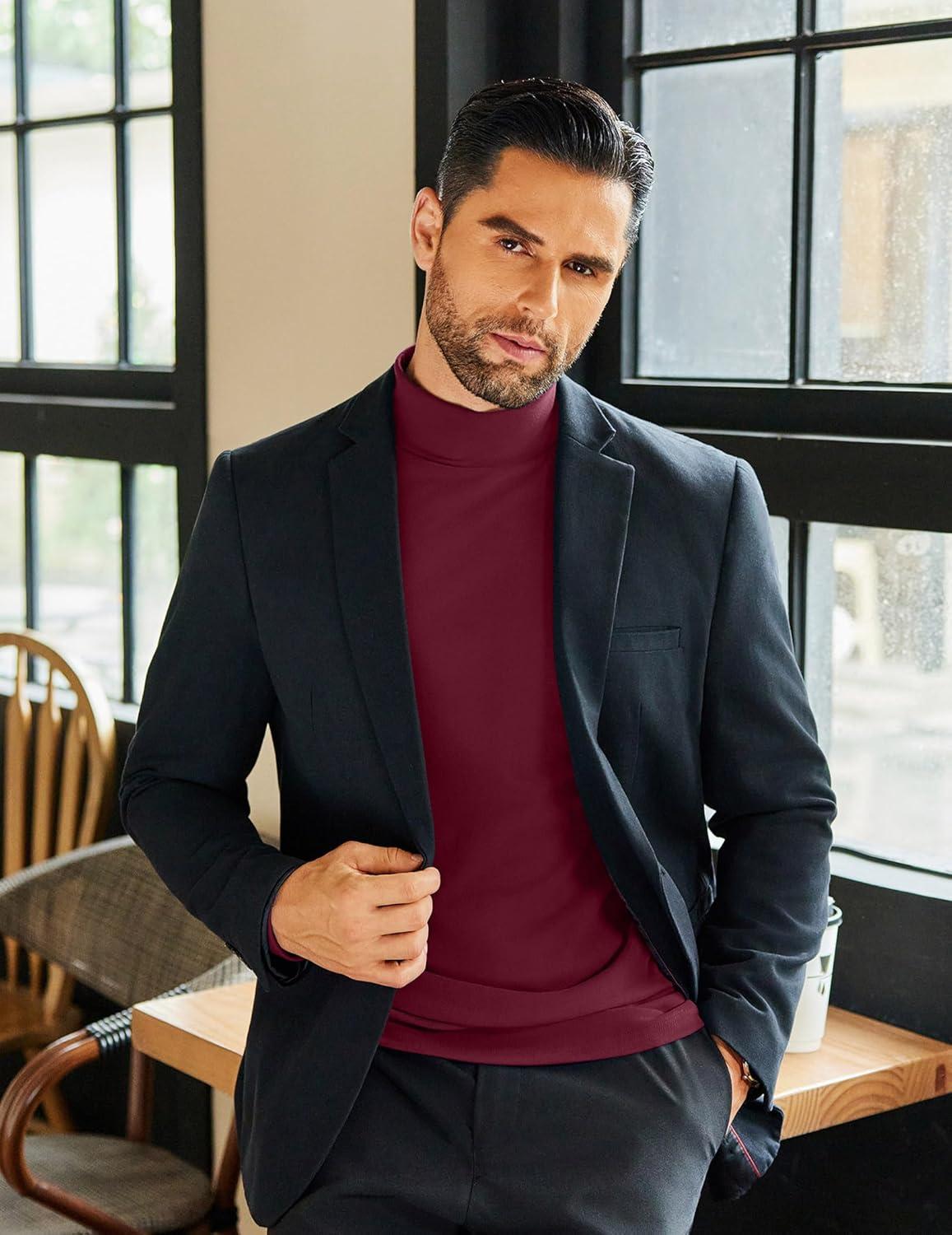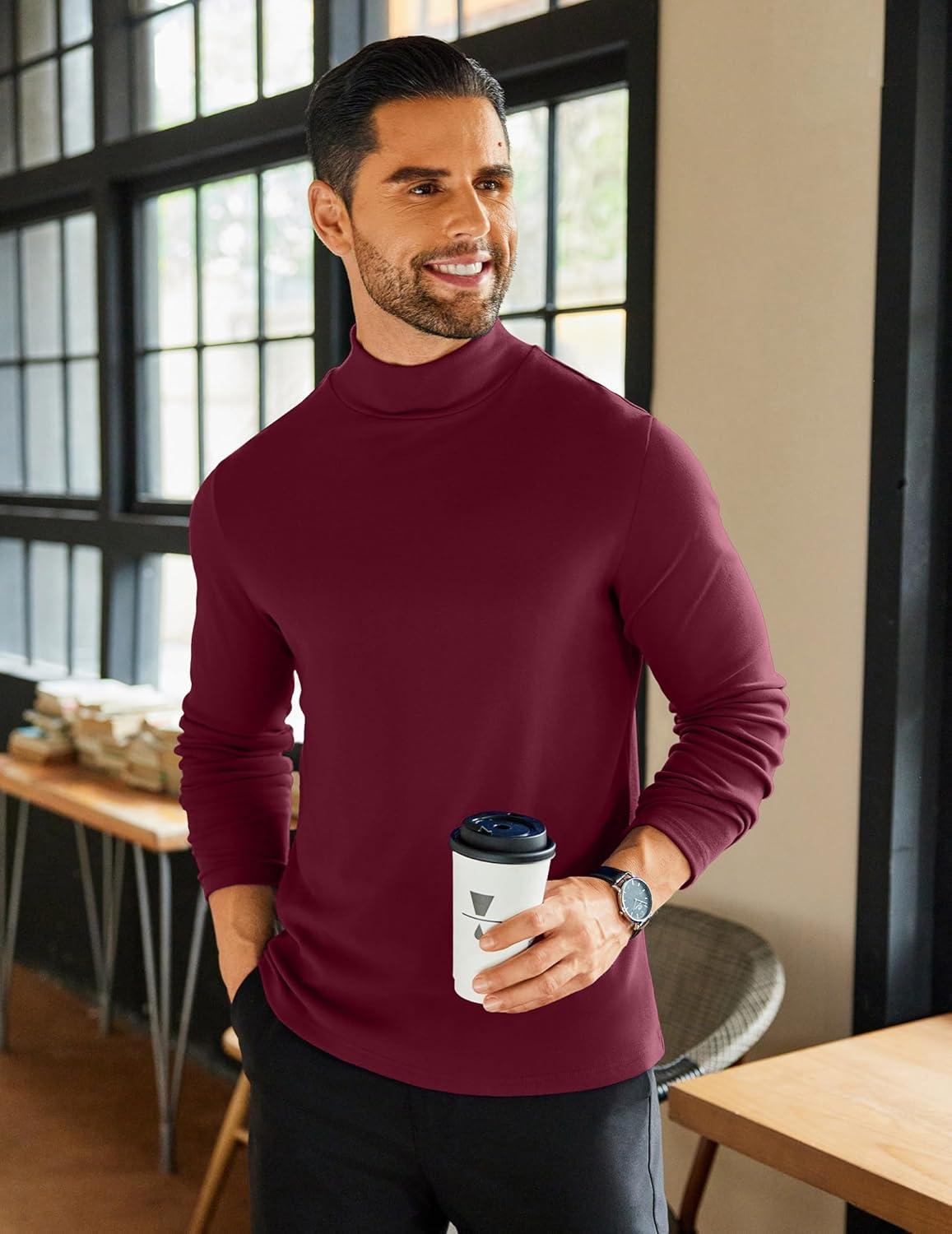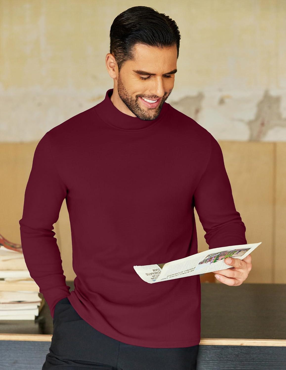COOFANDY Mens Mock Neck Shirts Fleece Long Sleeve Tops Basic Pullover T-Shirts(Purple Red)
