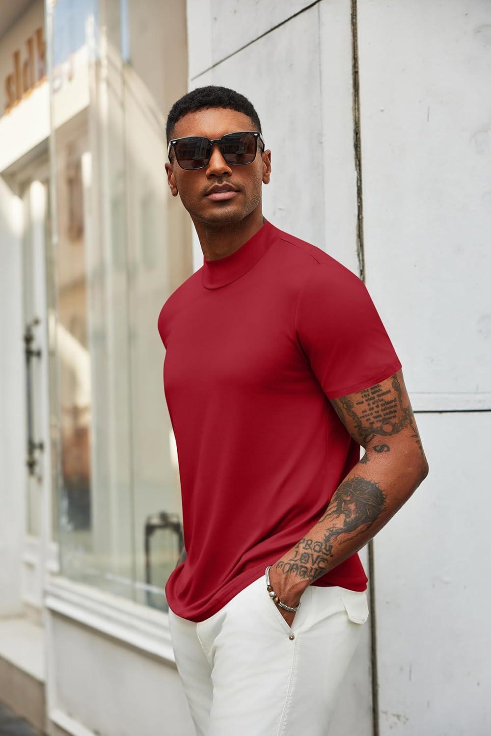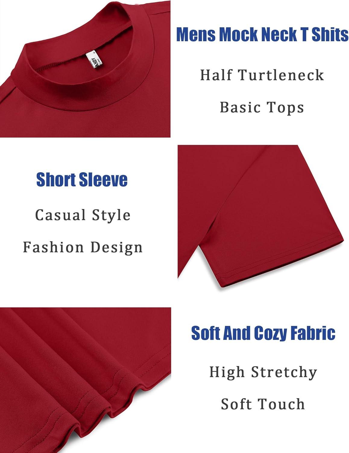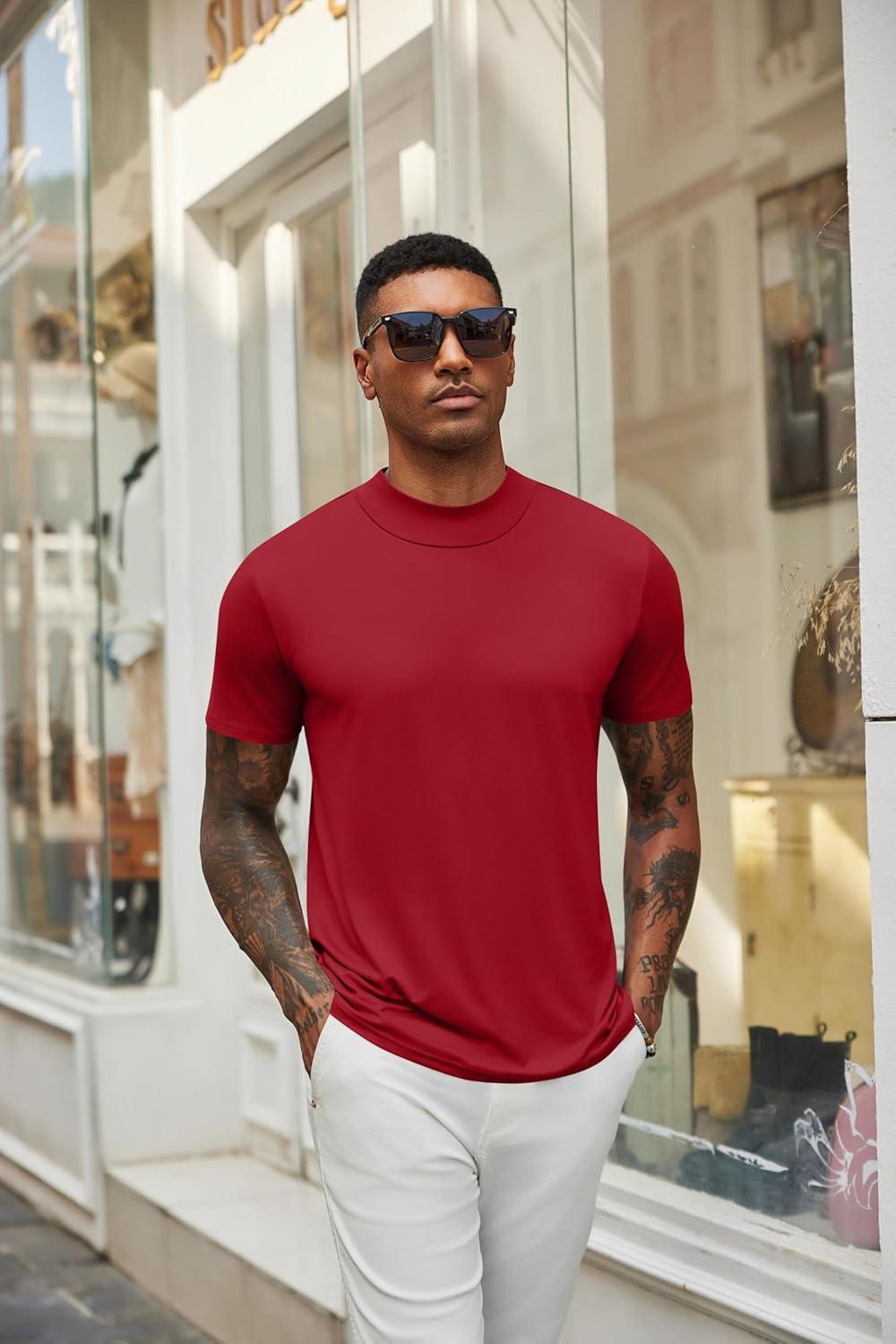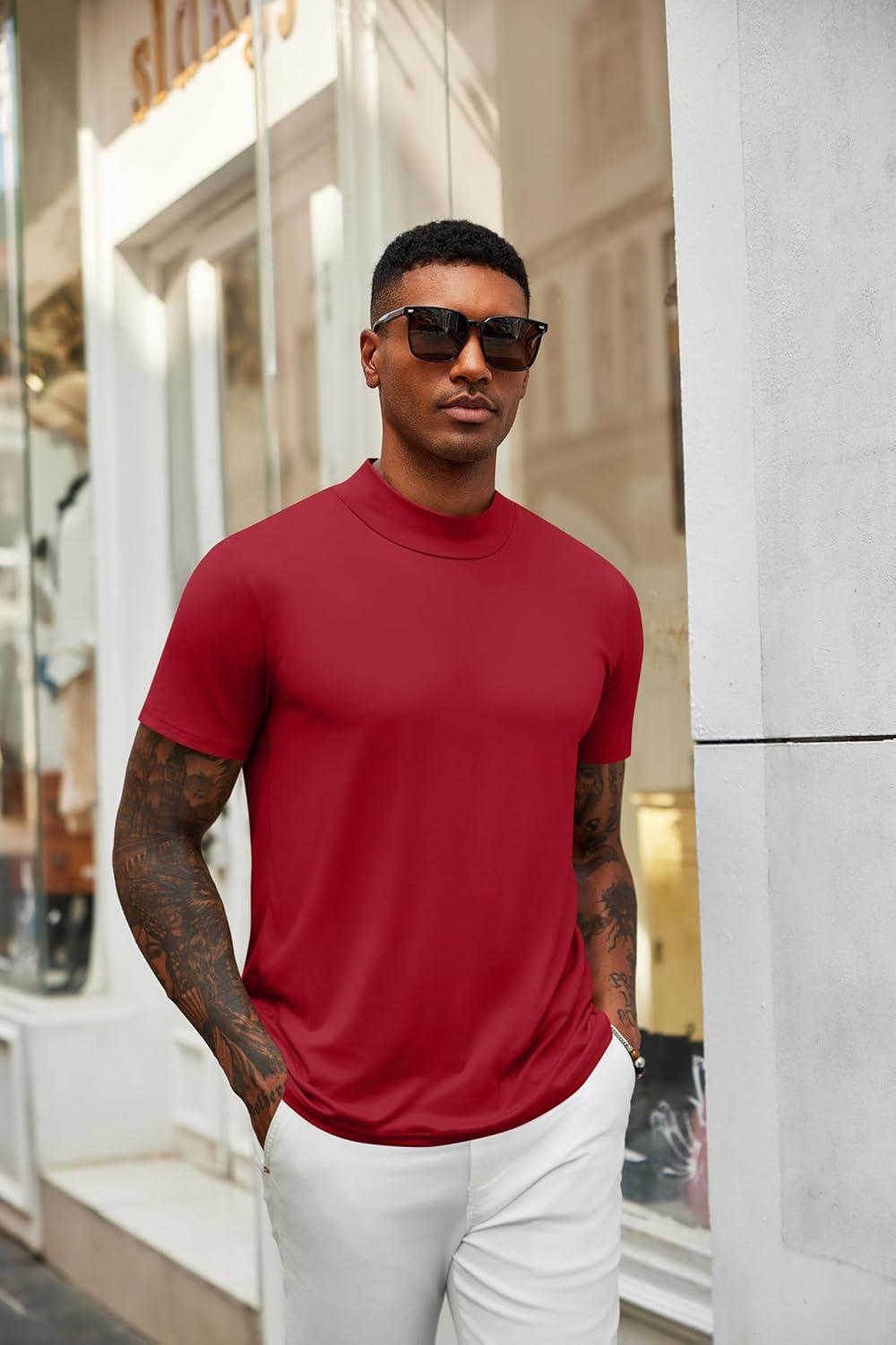 imageCOOFANDY Mens Mock Neck T Shirt Short Sleeve Slim Fit Basic Casual TShirts Solid Color Pullover TeeAwine Red