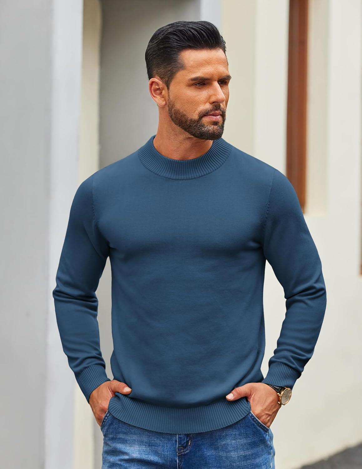 COOFANDY Men's Mock Turtleneck Ribbed Knit Pullover Sweater Casual Lightweight Slim fit Dress Sweater(Blue)