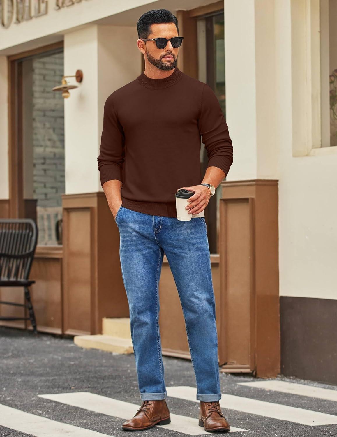 COOFANDY Men’s Mock Turtleneck Ribbed Knit Pullover Sweater Casual Lightweight Slim fit Dress Sweater(Brown)