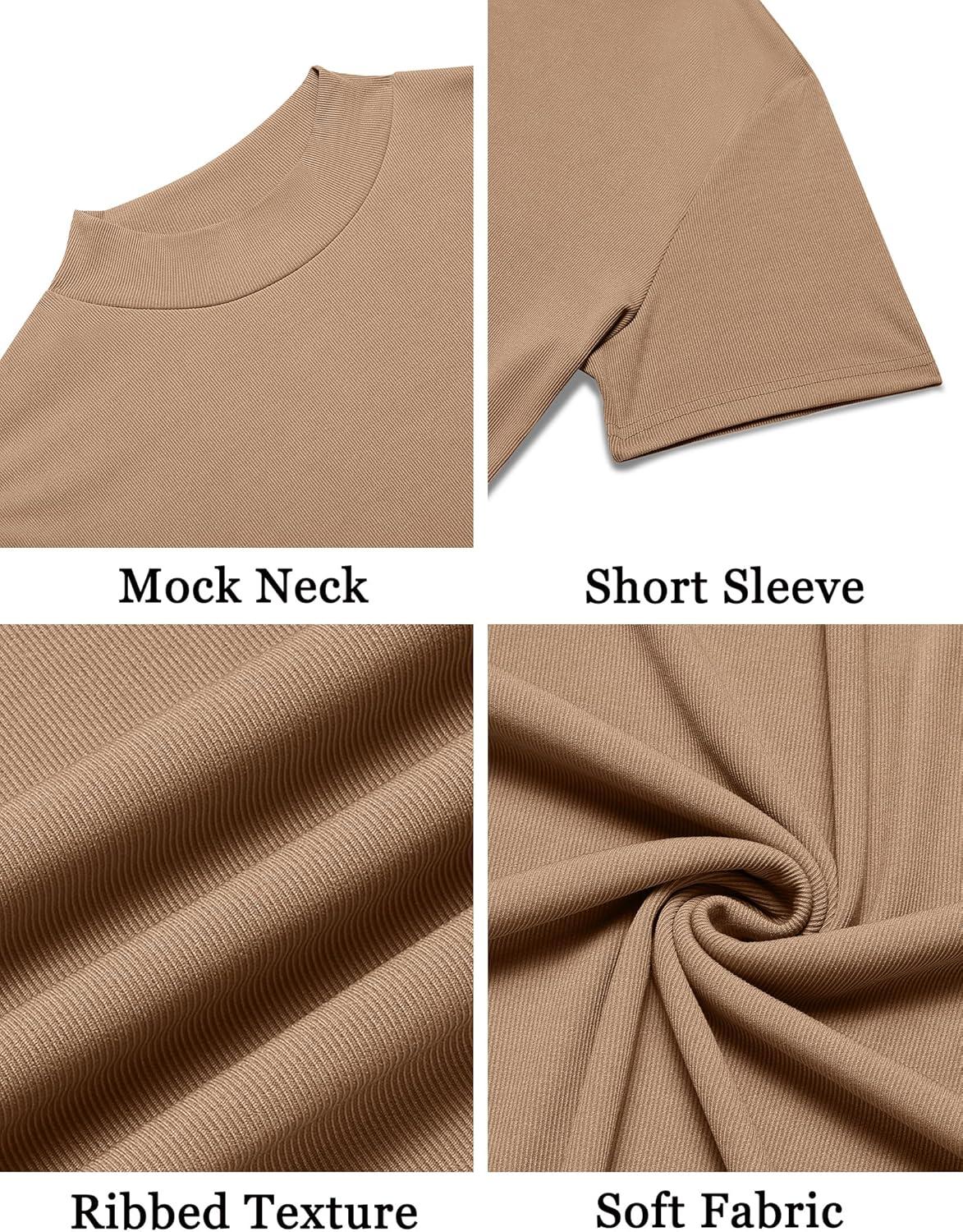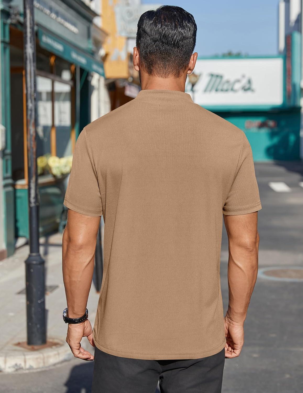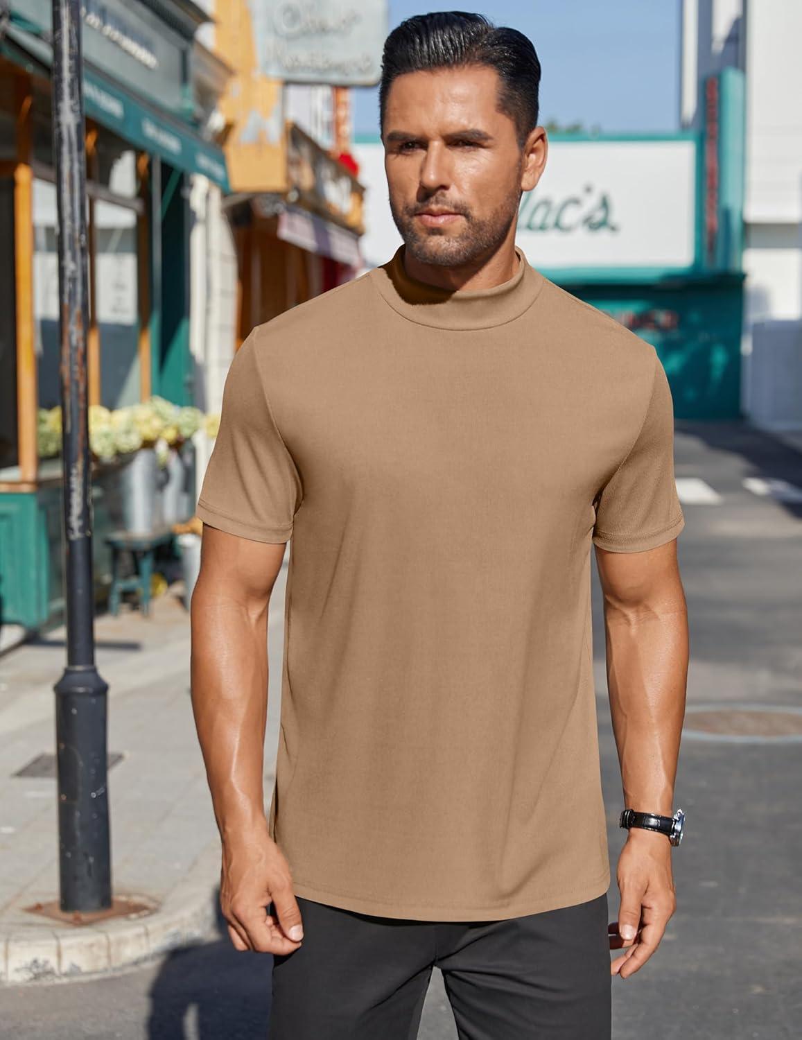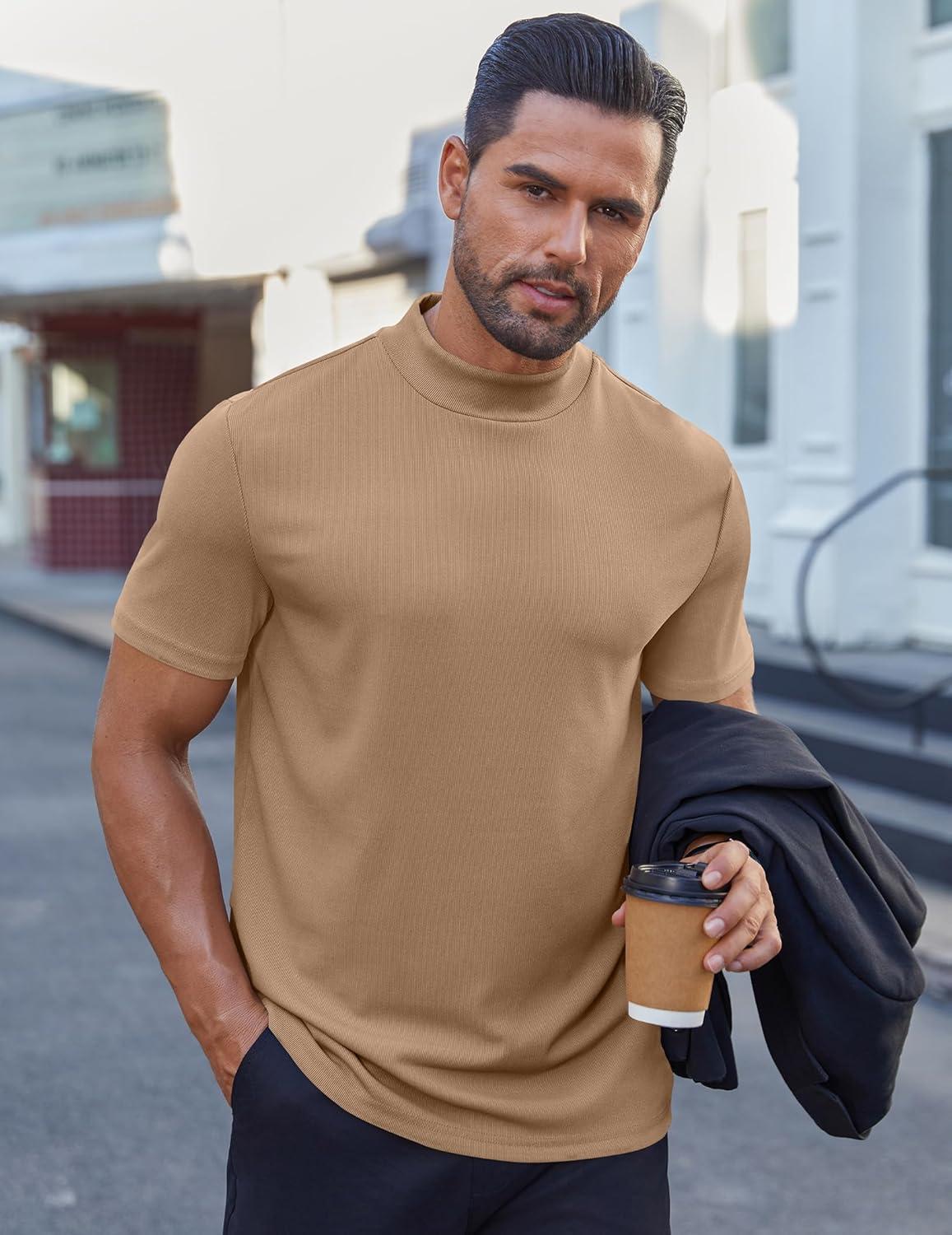COOFANDY Mens Mock Turtleneck Shirts Short Sleeve Casual Basic T-Shirts Ribbed Solid Pullover Tops(Khaki)