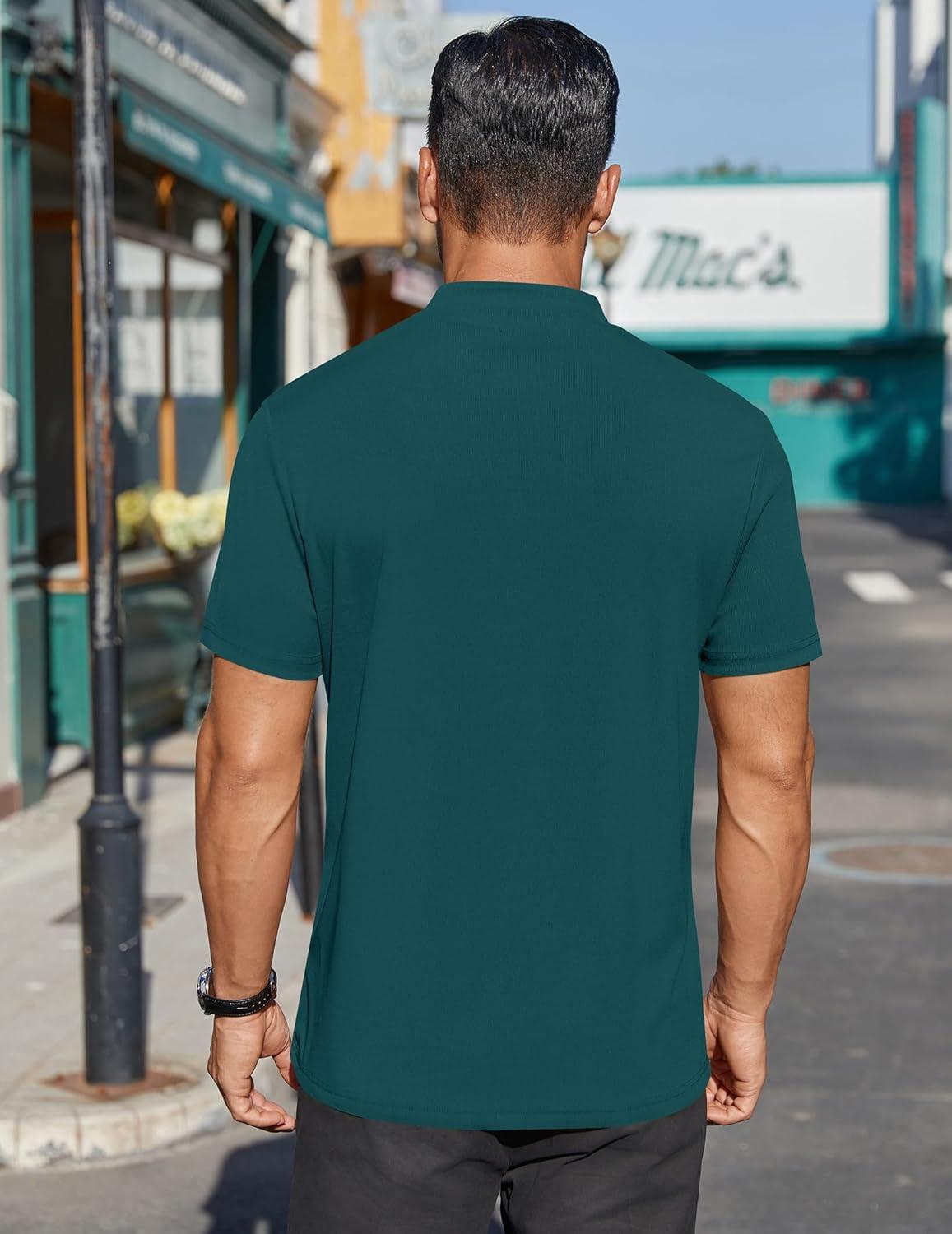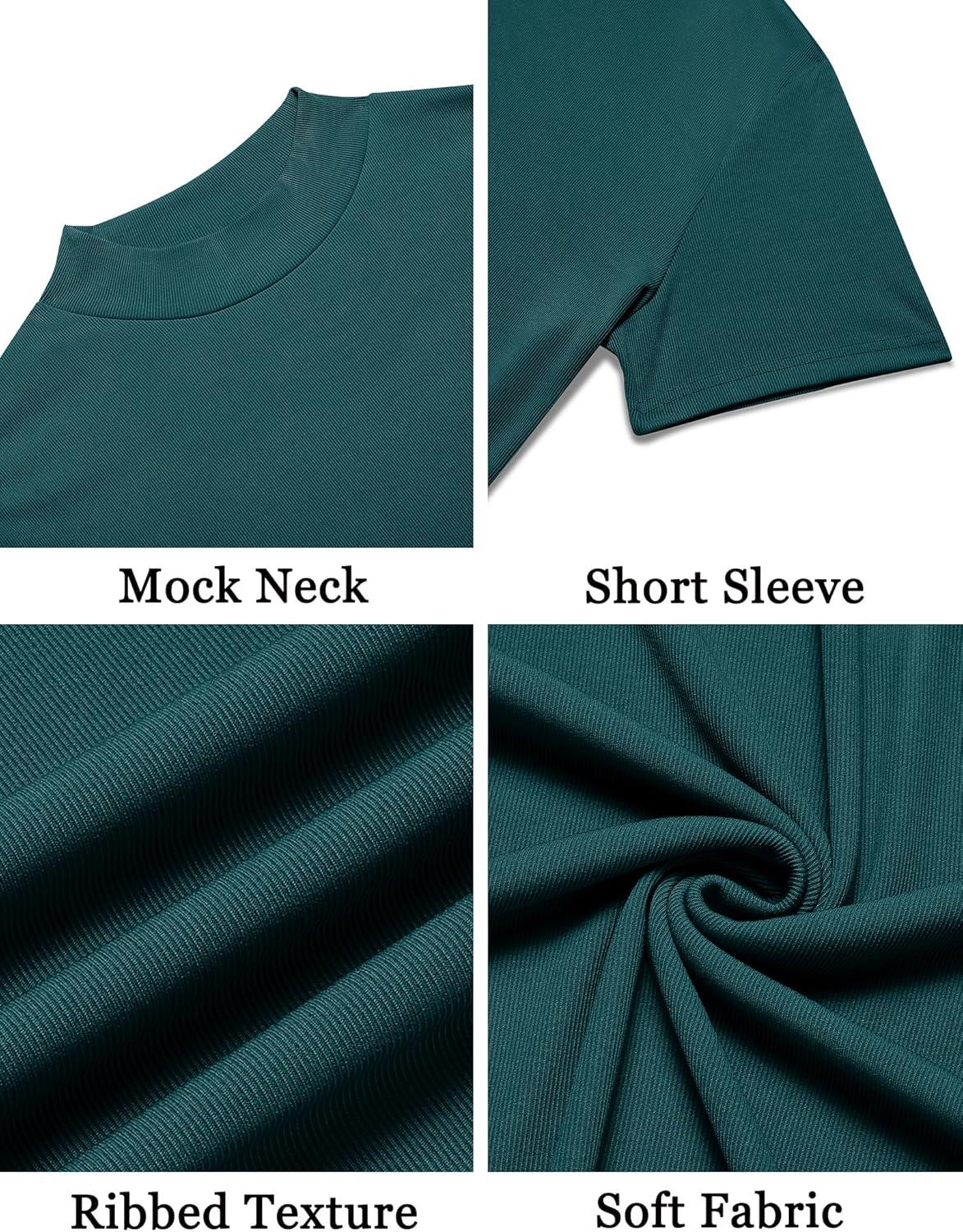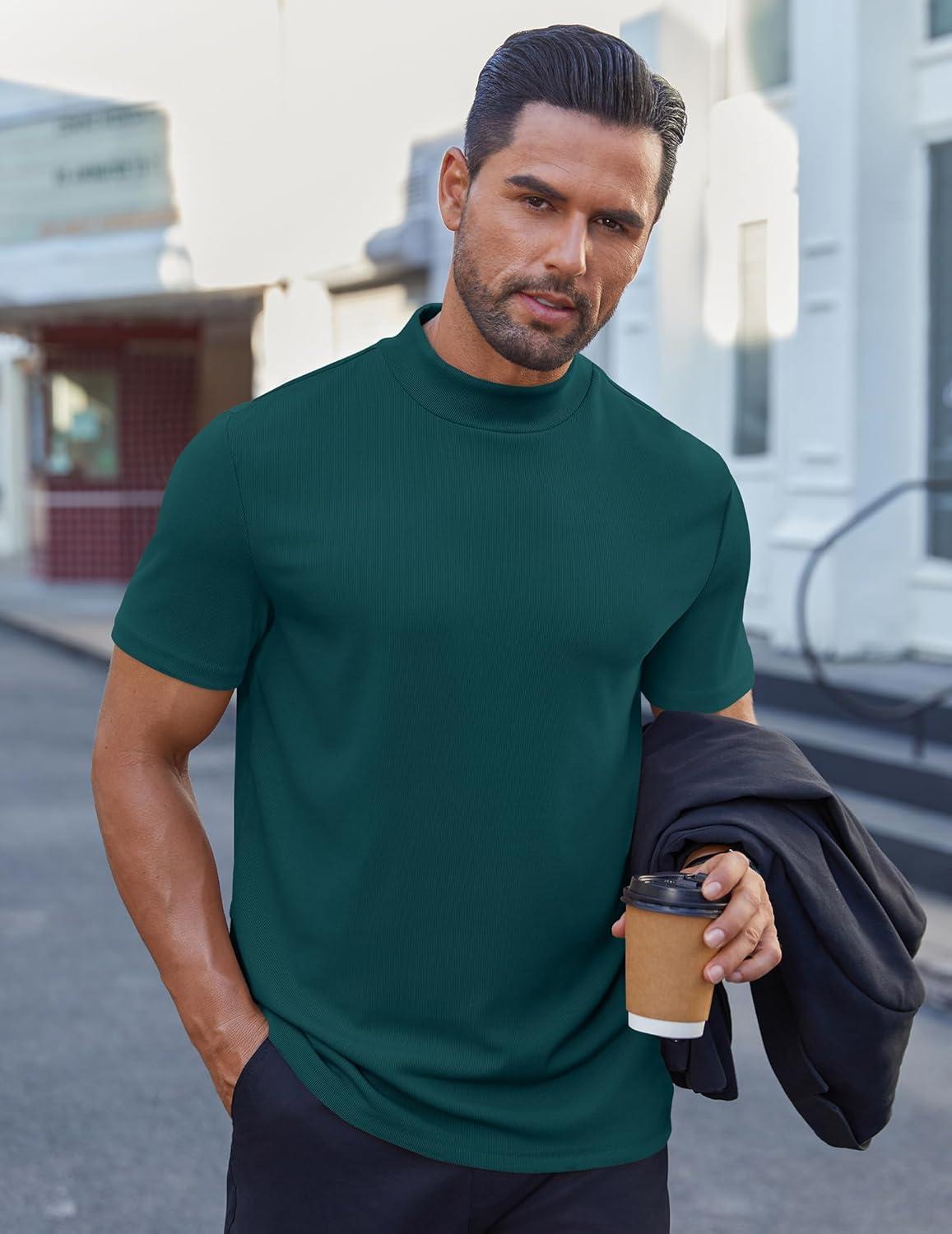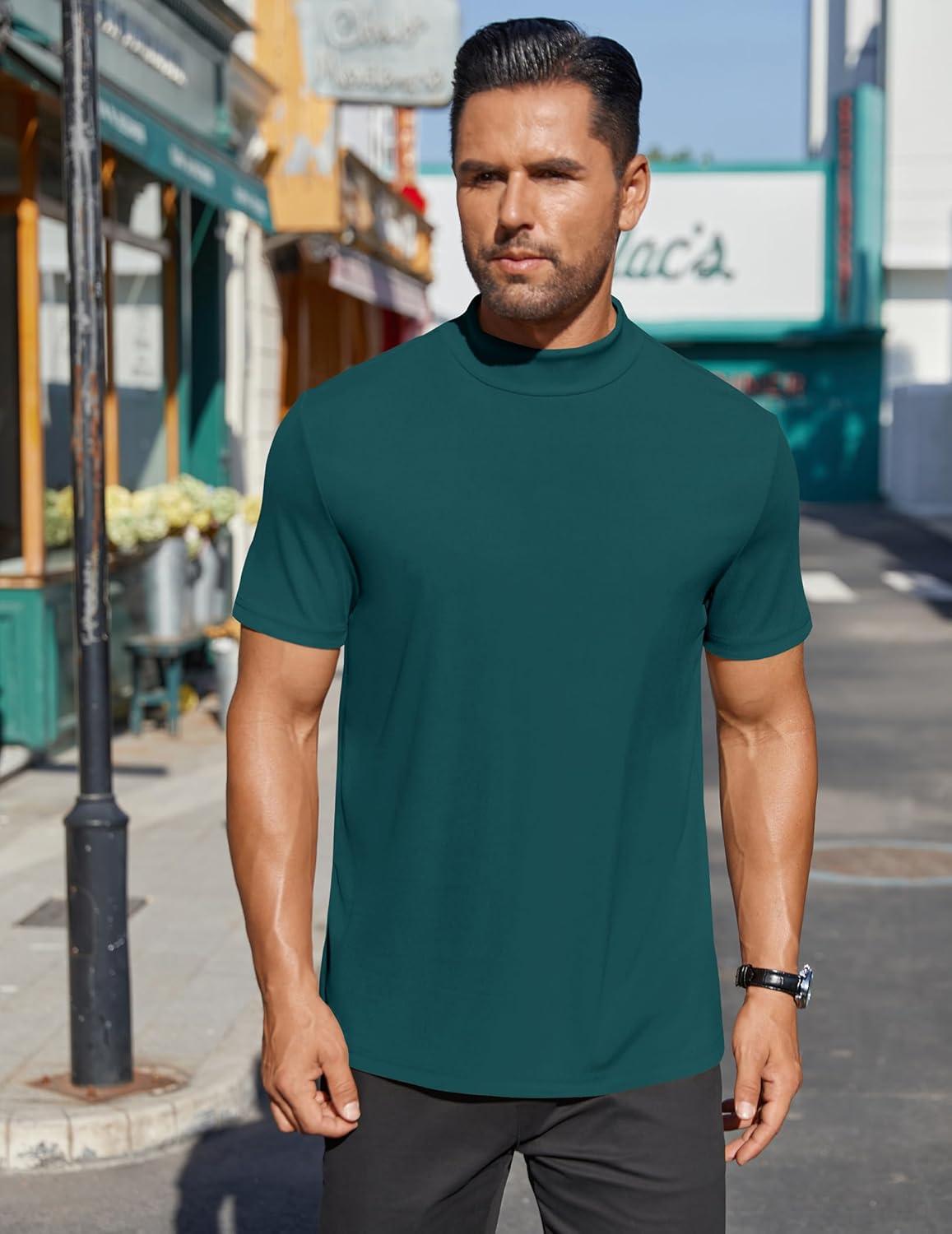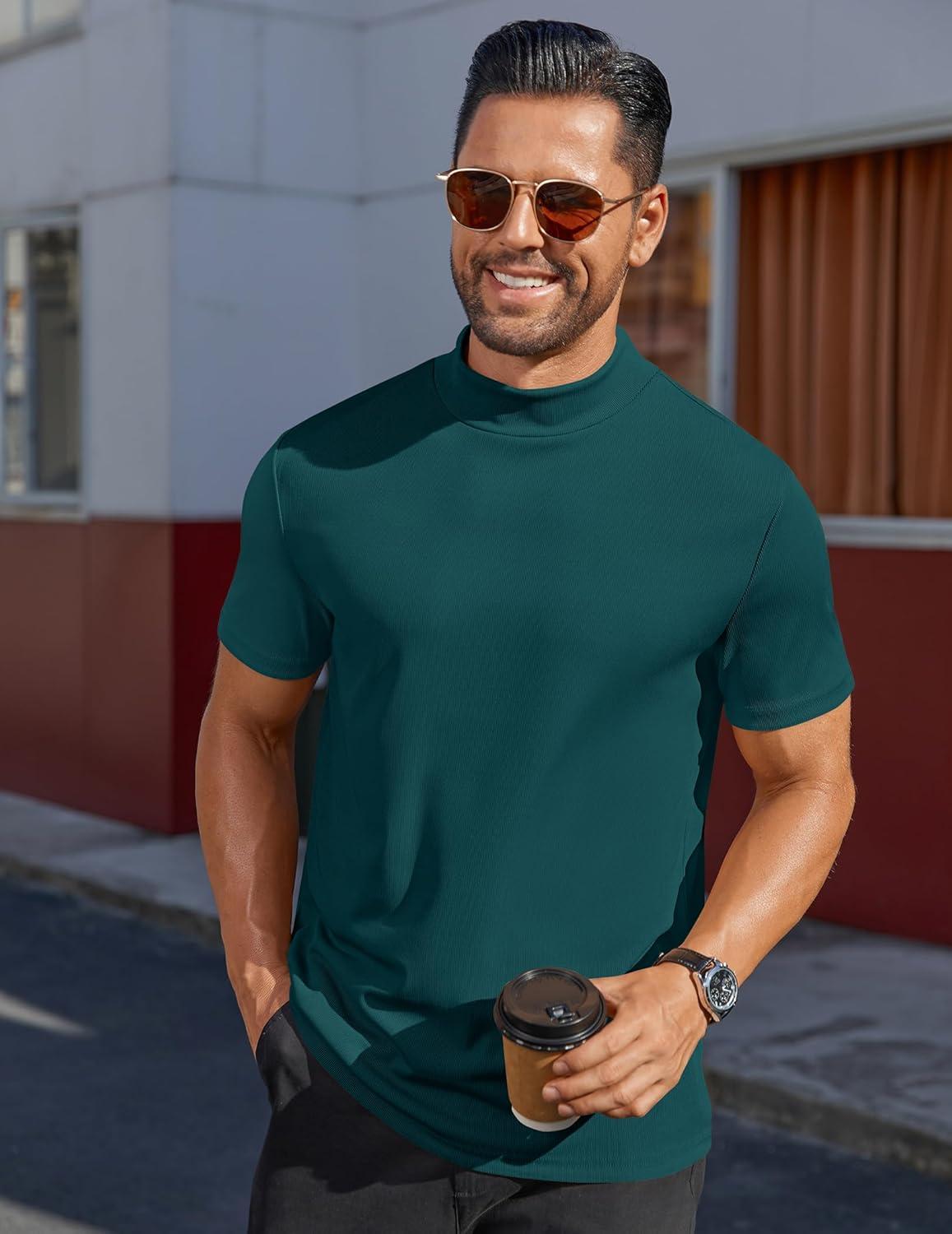 COOFANDY Mens Mock Turtleneck Shirts Short Sleeve Casual Basic T-Shirts Ribbed Solid Pullover Tops(Lake Green)