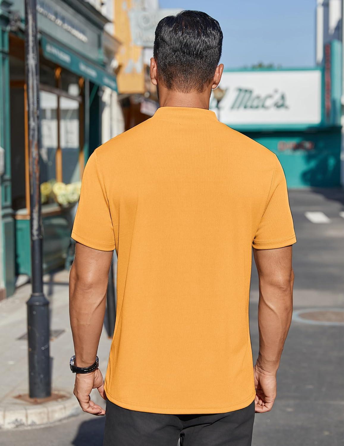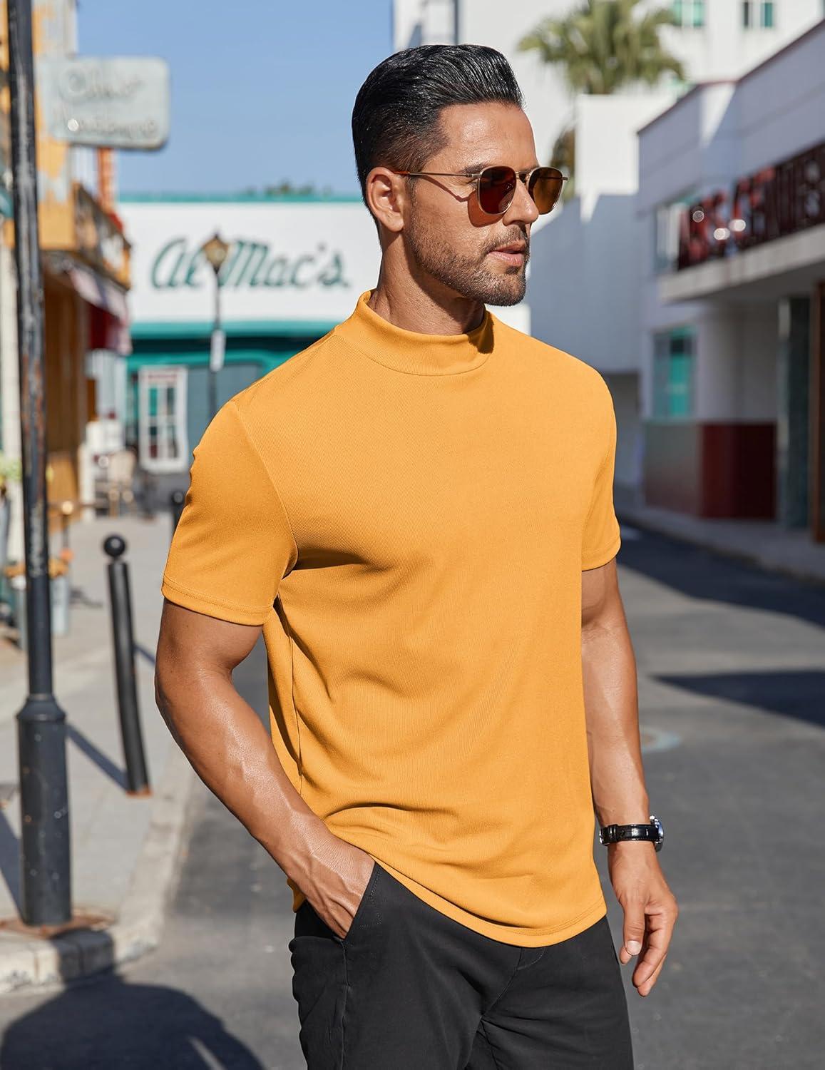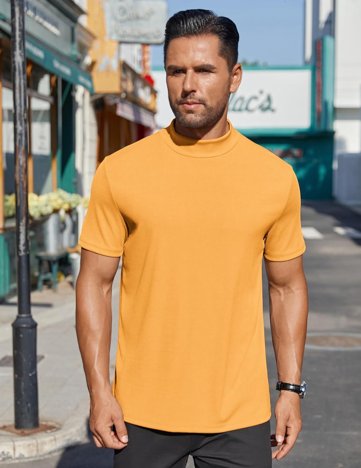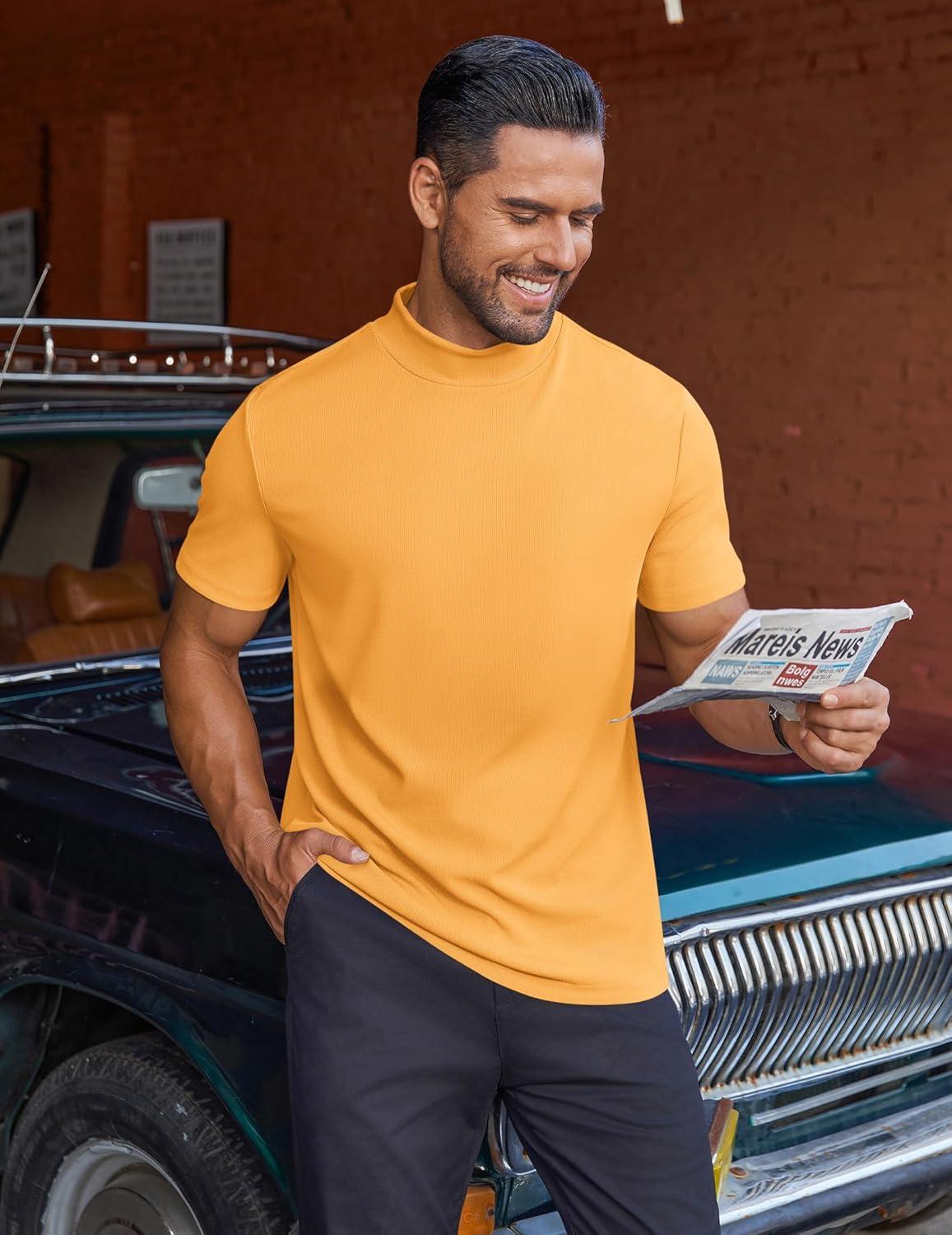 COOFANDY Mens Mock Turtleneck Shirts Short Sleeve Casual Basic T-Shirts Ribbed Solid Pullover Tops(Yellow)