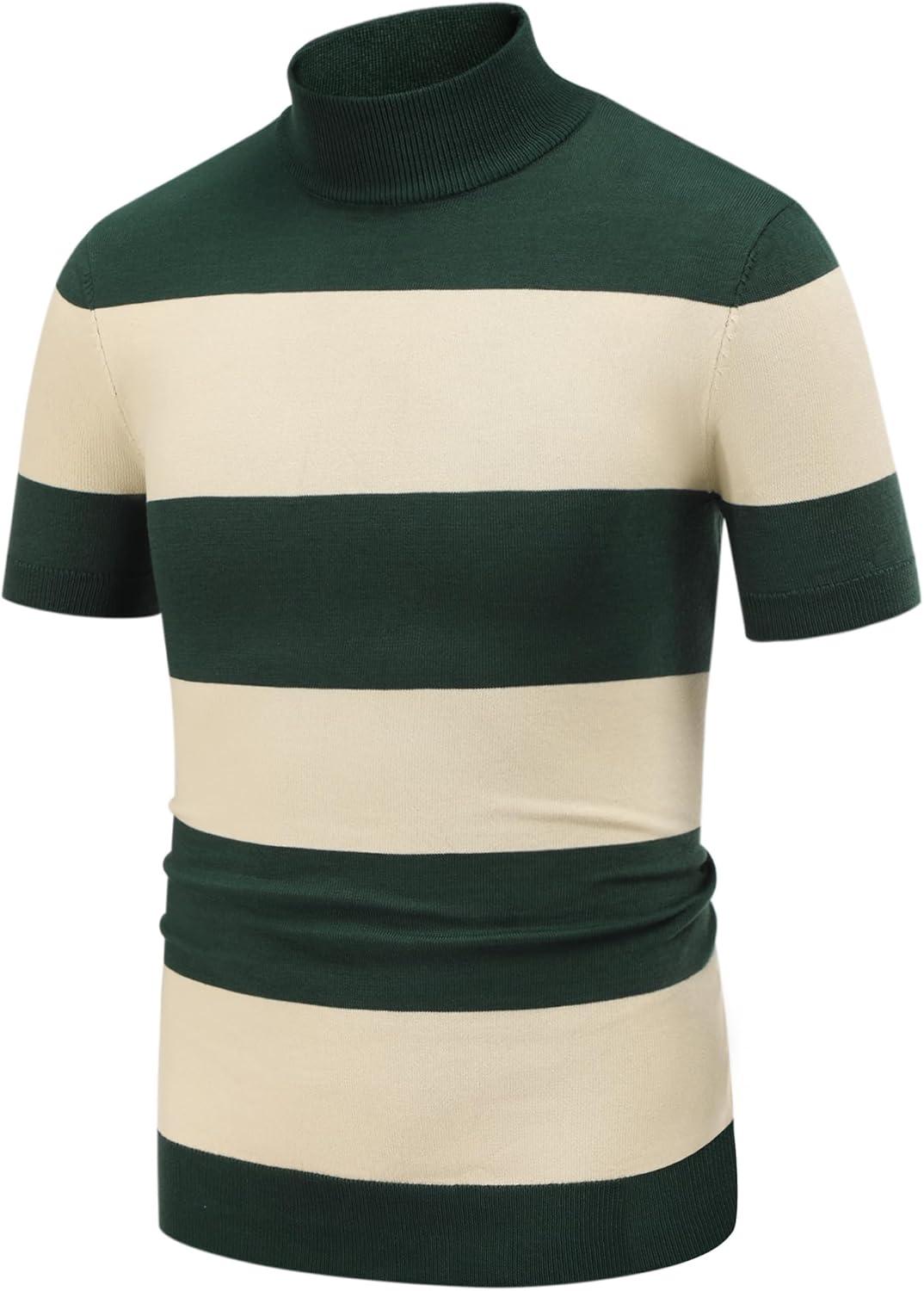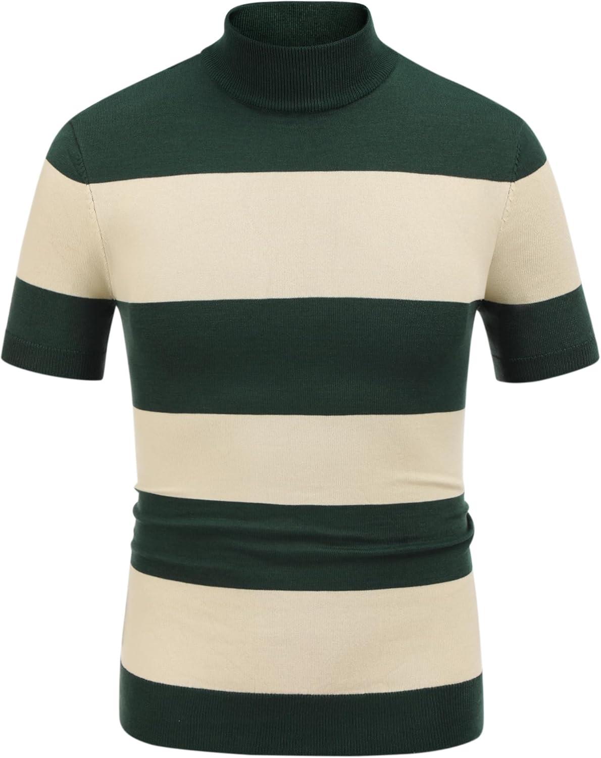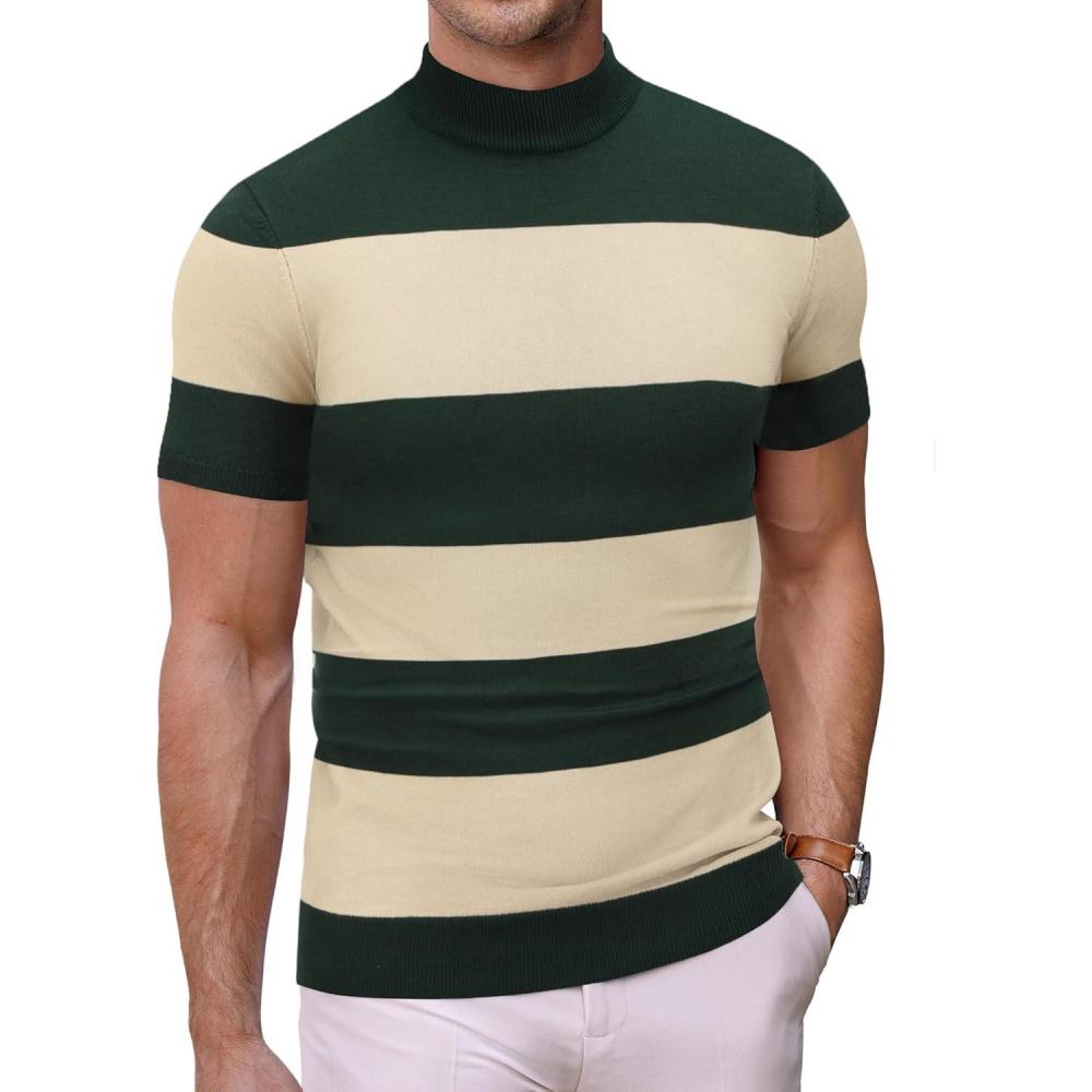 COOFANDY Mens Mock Turtleneck Sweater Short Sleeve Casual Dress Sweater Slim Fit Pullover Basic Knit Tee(Green Stripe)