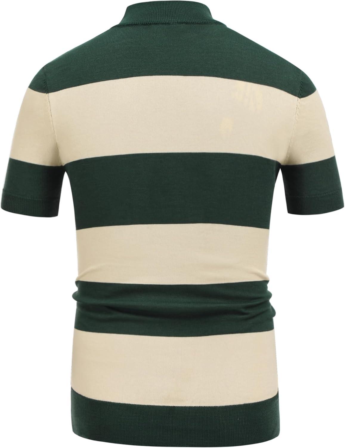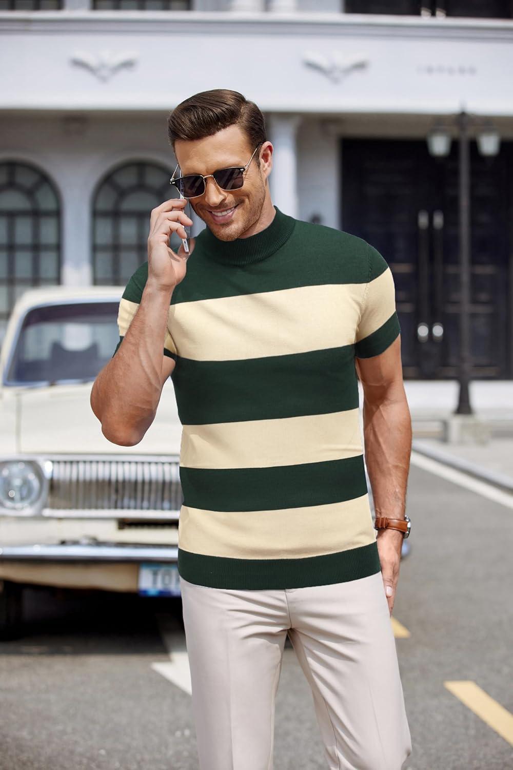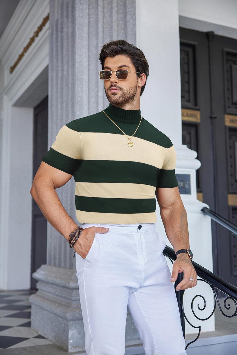 COOFANDY Mens Mock Turtleneck Sweater Short Sleeve Casual Dress Sweater Slim Fit Pullover Basic Knit Tee(Green Stripe)
