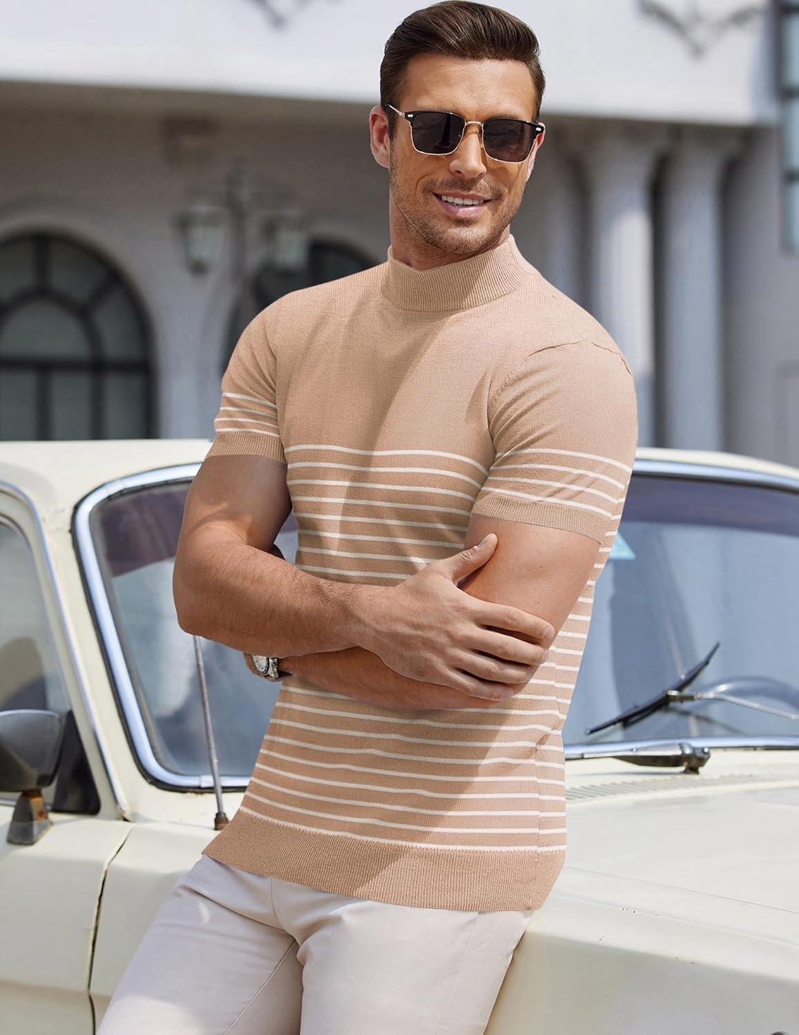 Save big on COOFANDY Mens Mock Turtleneck Sweater Short Sleeve Casual Dress Sweater Slim Fit Pullover Basic Knit Tee(Striped Khaki) and accessories during our BOGO sale. Buy one, get one 50% off!
