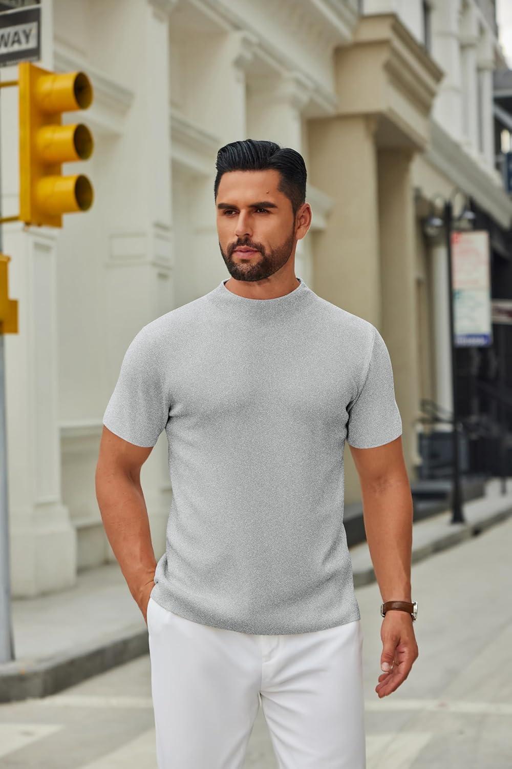 COOFANDY Men’s Mock Turtleneck Sweater Short Sleeve Casual Knitted T-Shirts Thermal Tops Solid Basic Tee(Light Grey)