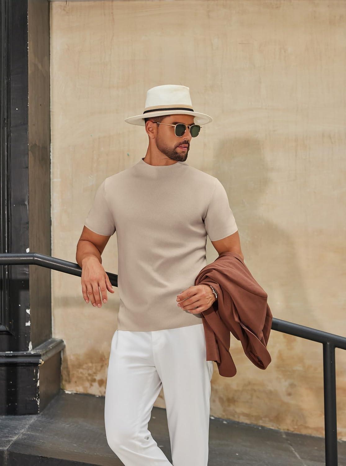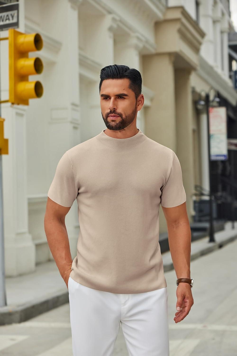 COOFANDY Men’s Mock Turtleneck Sweater Short Sleeve Casual Knitted T-Shirts Thermal Tops Solid Basic Tee(Light Khaki)