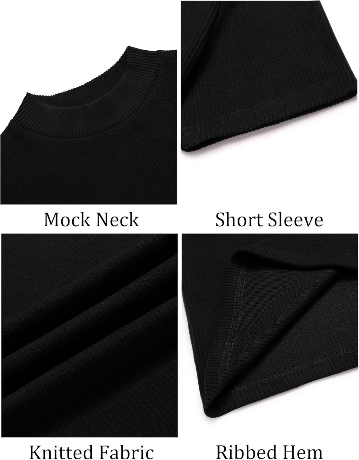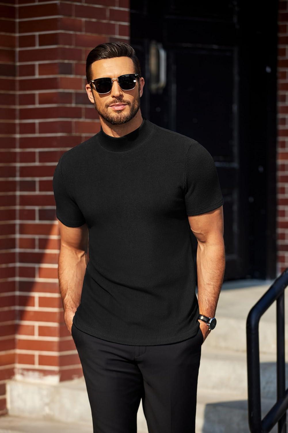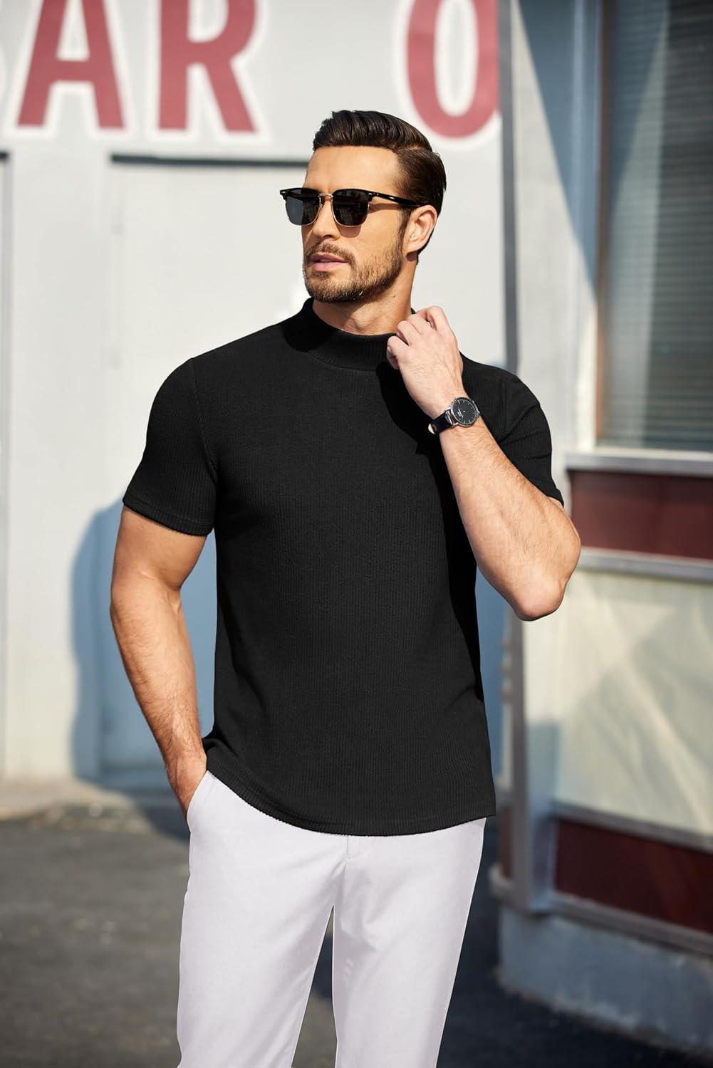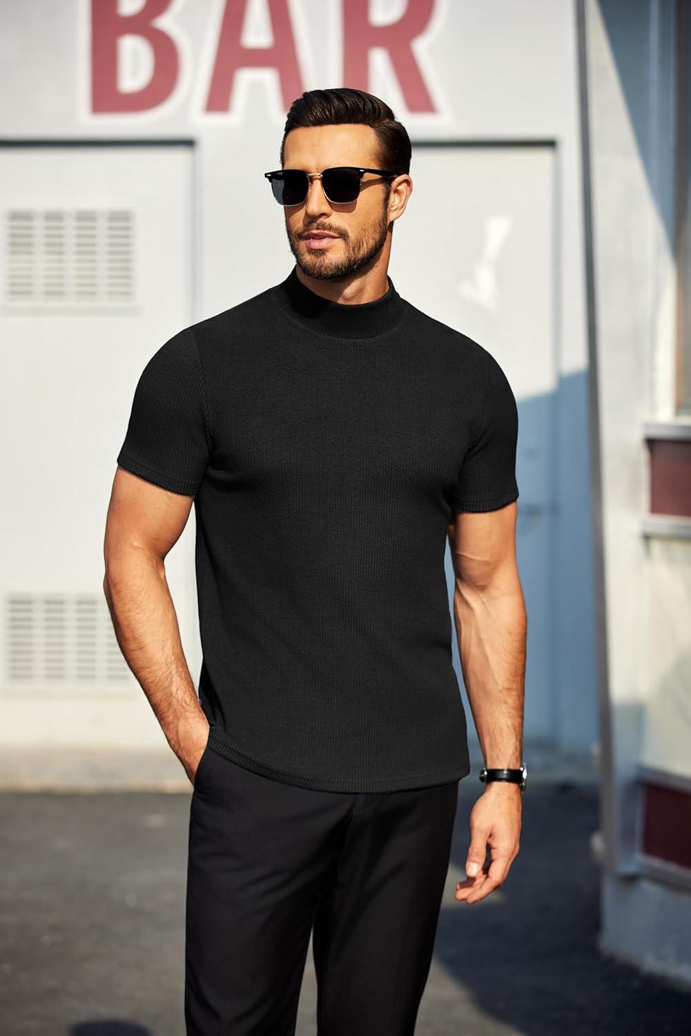 COOFANDY Mens Mock Turtleneck Sweater Short Sleeve Turtle Neck Sweaters Casual Ribbed Knitted Pullover Tops Solid Basic Tee(A-black)