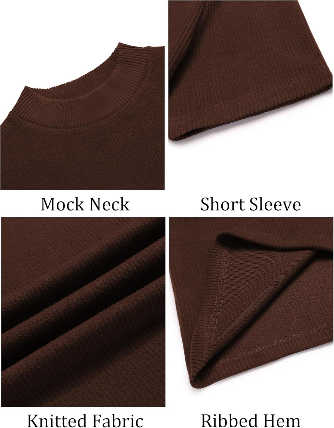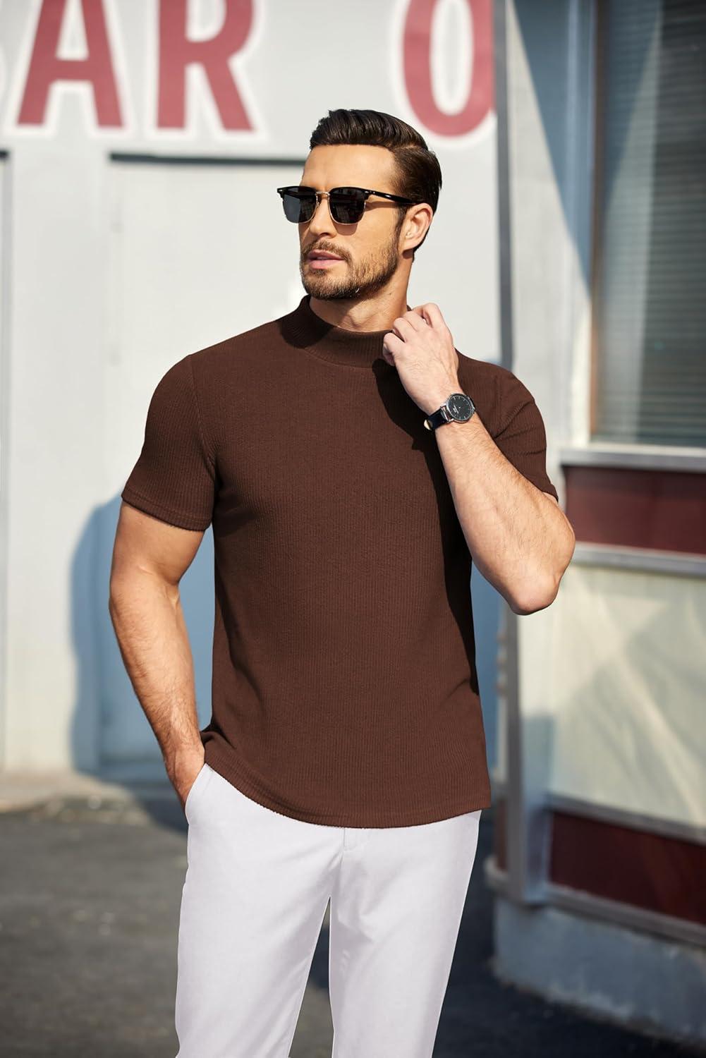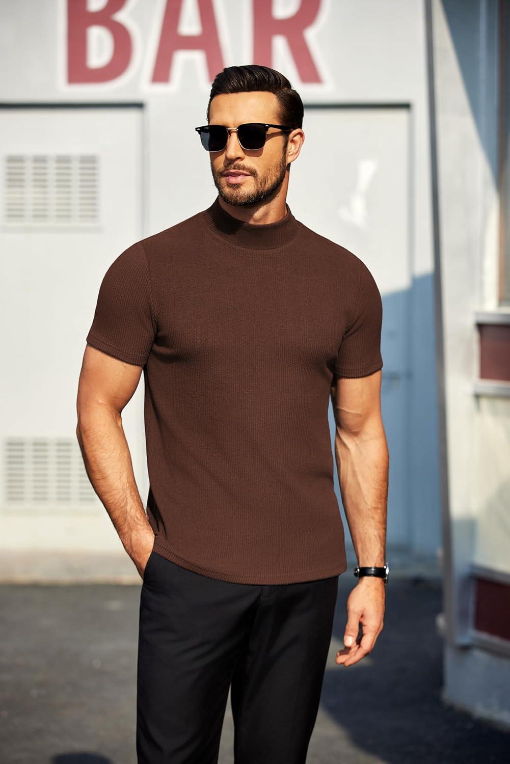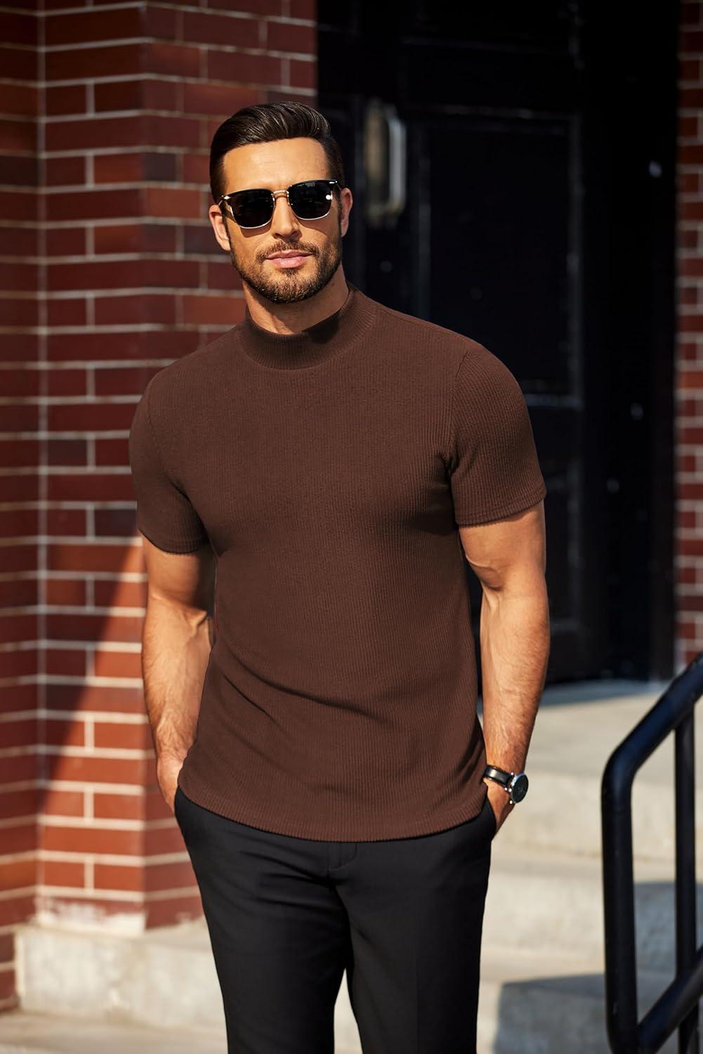COOFANDY Mens Mock Turtleneck Sweater Short Sleeve Turtle Neck Sweaters Casual Ribbed Knitted Pullover Tops Solid Basic Tee(Brown)