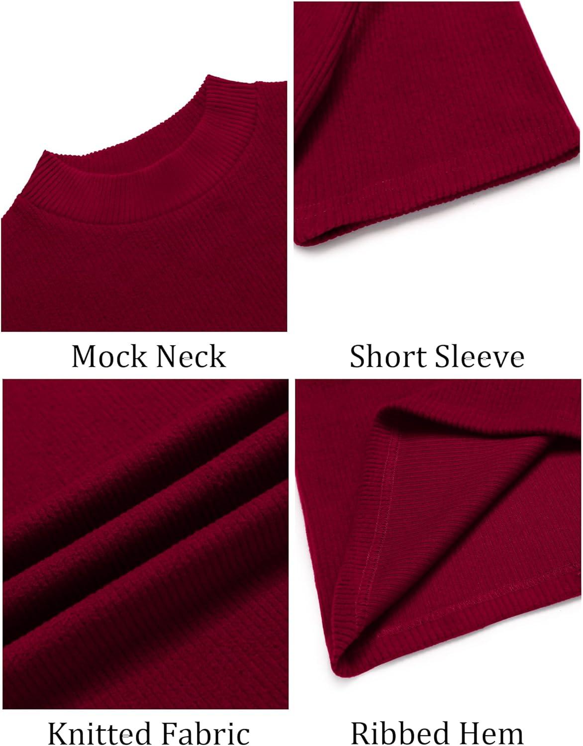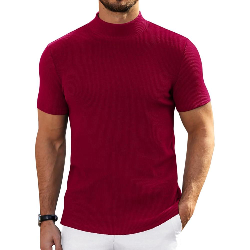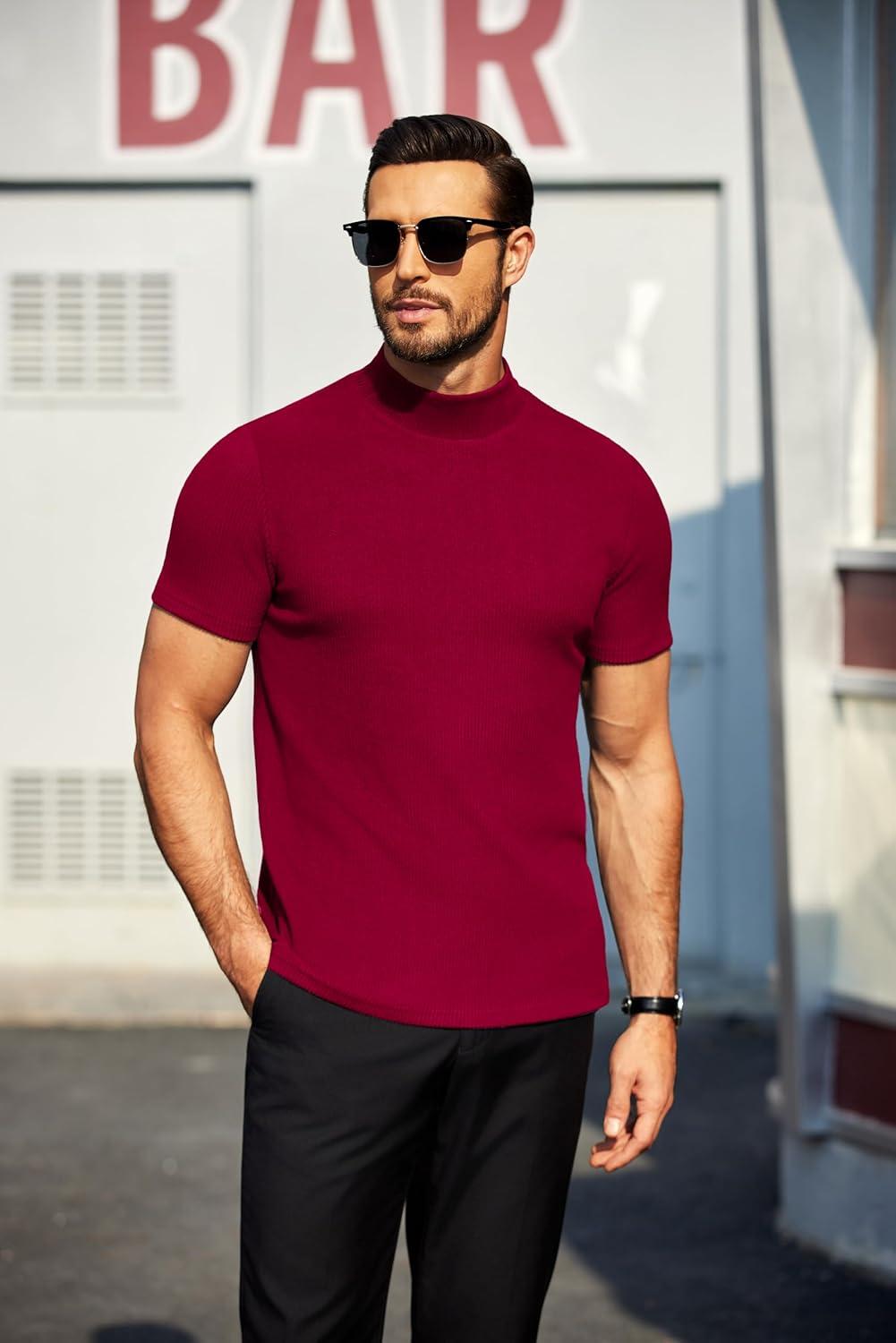COOFANDY Mens Mock Turtleneck Sweater Short Sleeve Turtle Neck Sweaters Casual Ribbed Knitted Pullover Tops Solid Basic Tee(Dark Red)