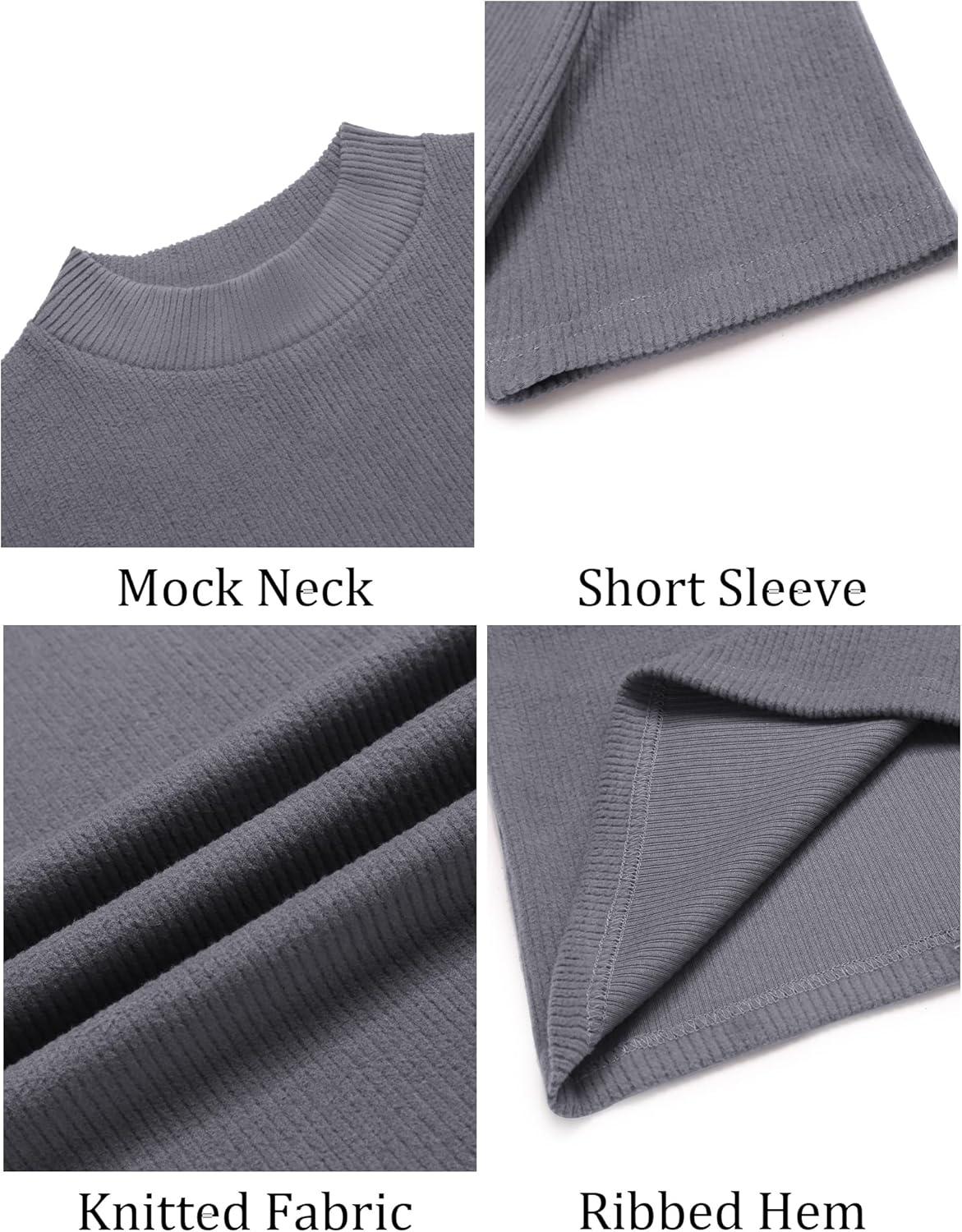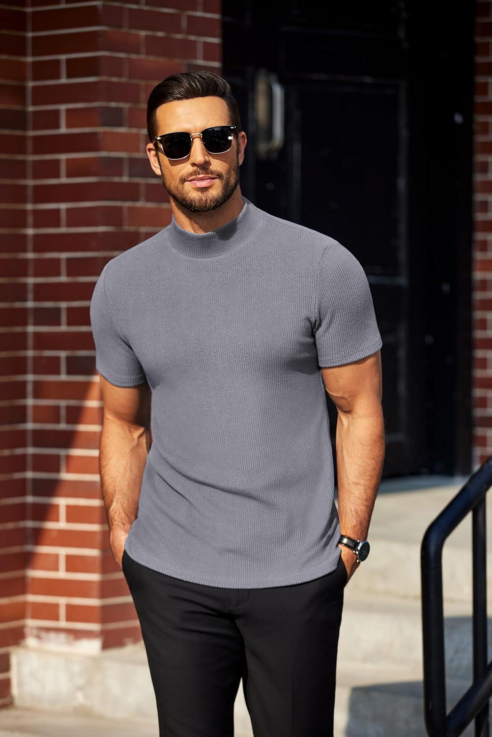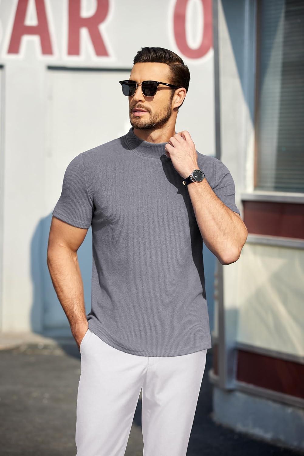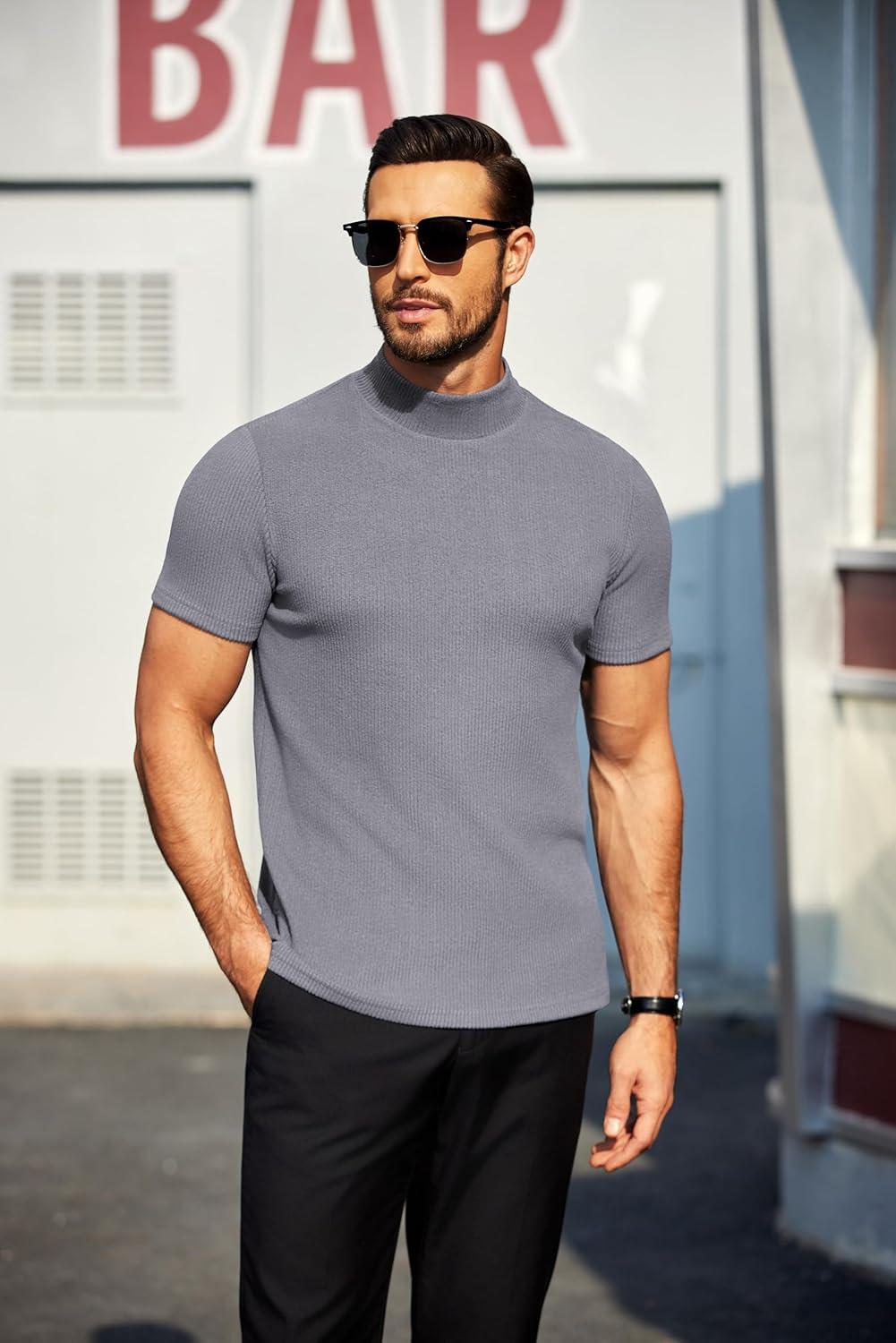 COOFANDY Mens Mock Turtleneck Sweater Short Sleeve Turtle Neck Sweaters Casual Ribbed Knitted Pullover Tops Solid Basic Tee(Grey)