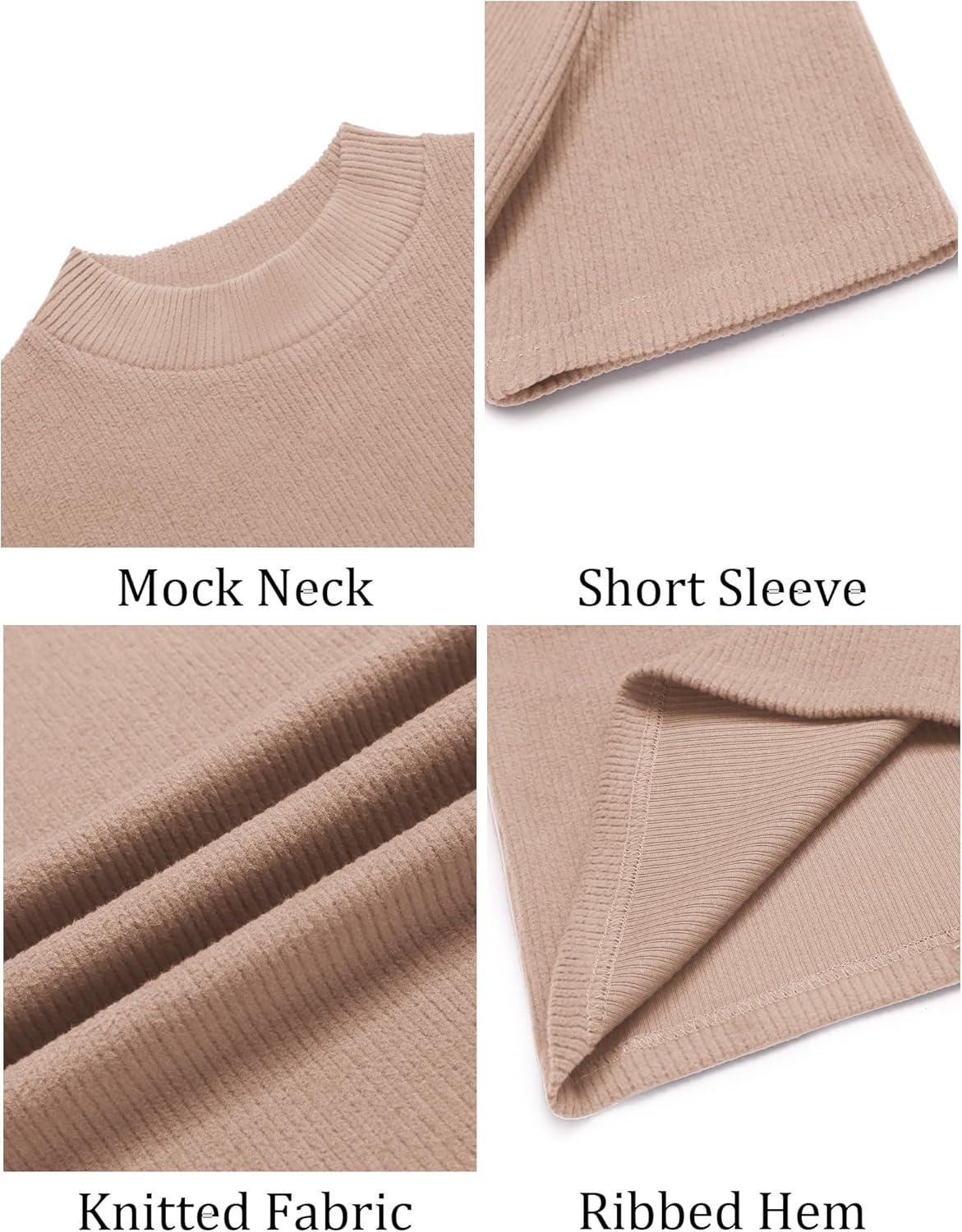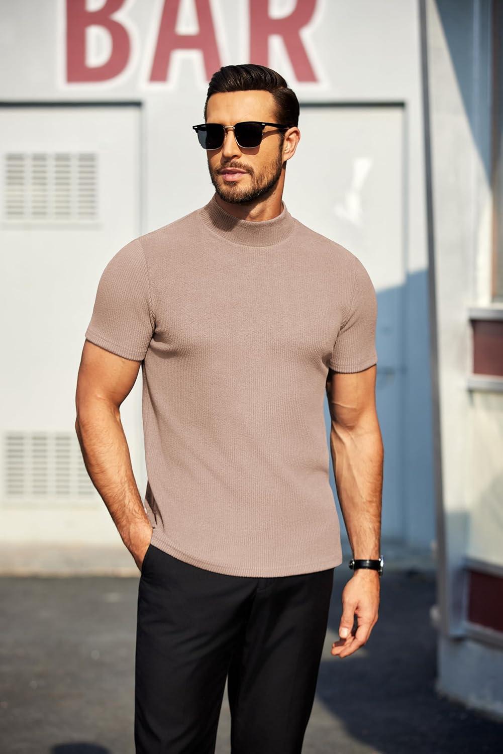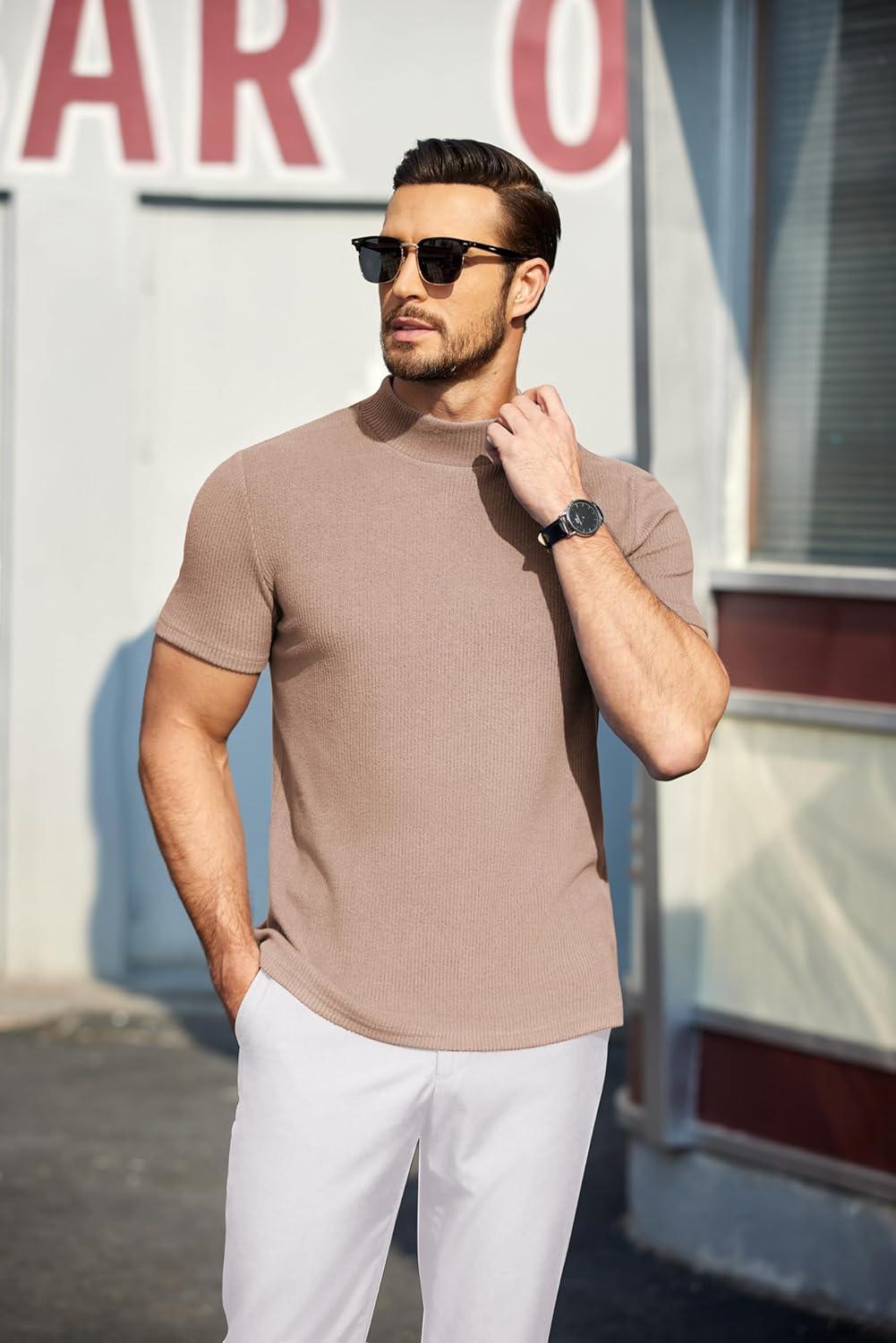 COOFANDY Mens Mock Turtleneck Sweater Short Sleeve Turtle Neck Sweaters Casual Ribbed Knitted Pullover Tops Solid Basic Tee(Light Khaki)