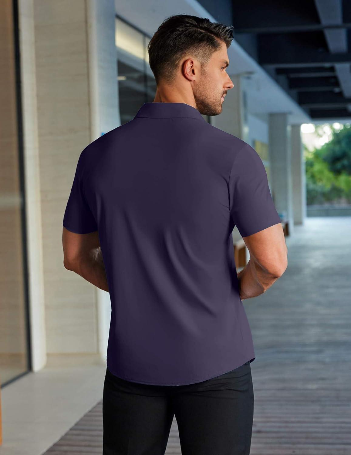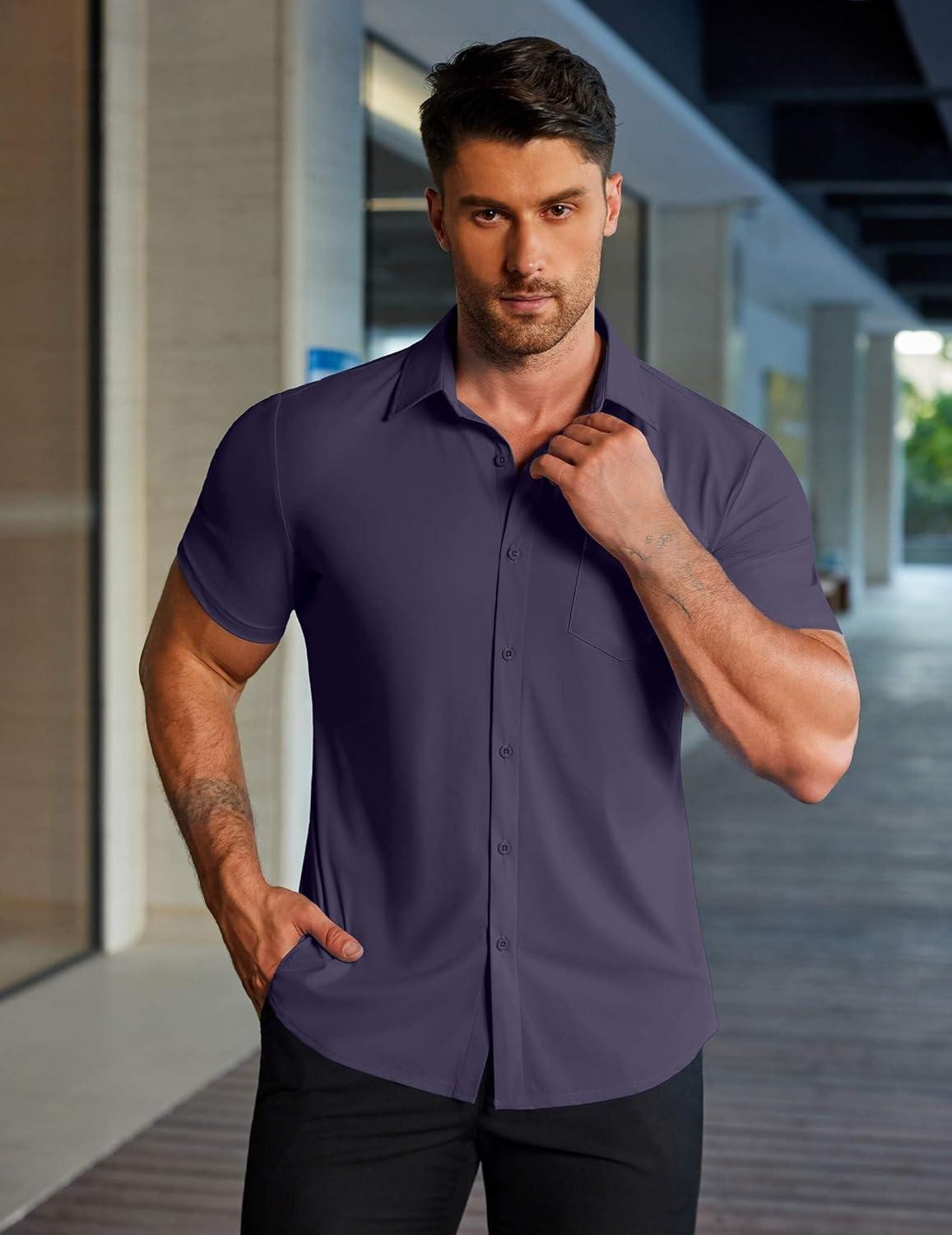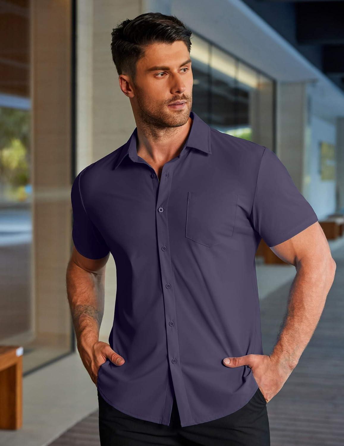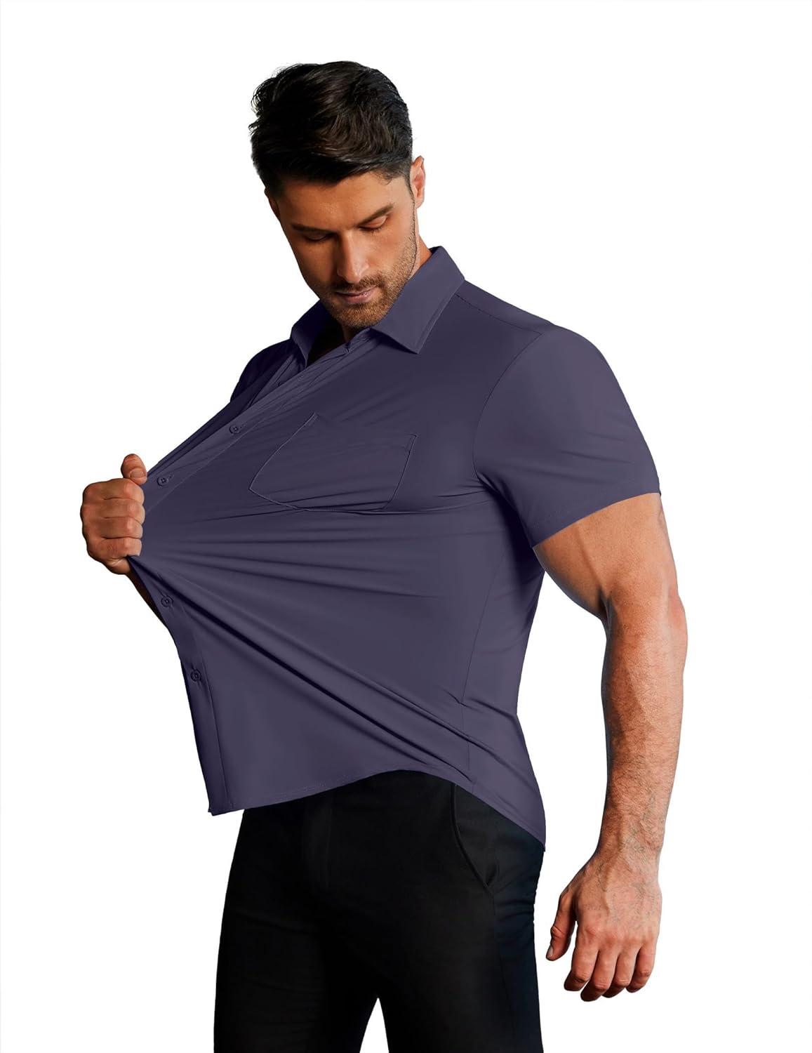 COOFANDY Men’s Muscle Fit Dress Shirts Stretch Wrinkle-Free Short Sleeve Casual Button Down Shirts(Indigo)