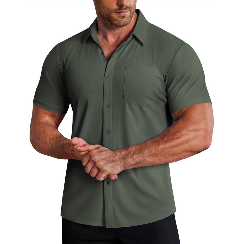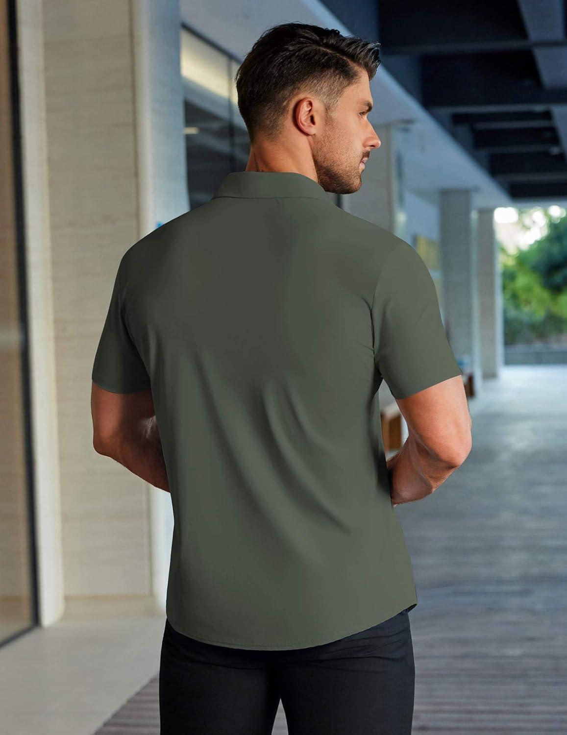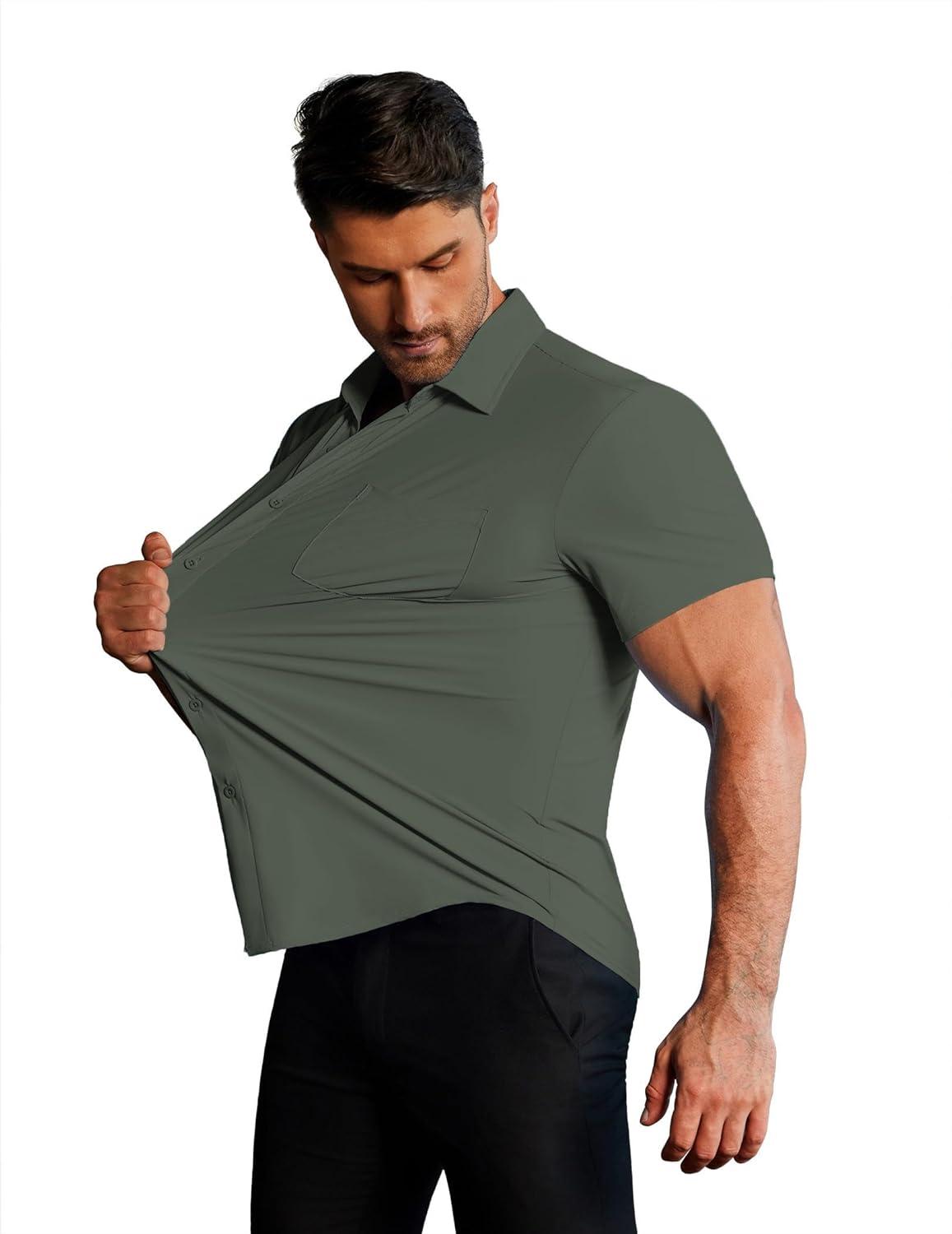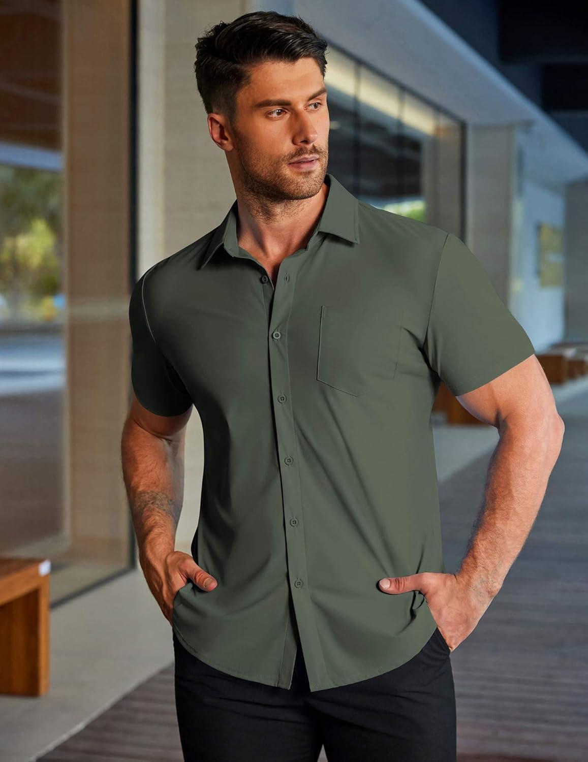COOFANDY Men’s Muscle Fit Dress Shirts Stretch Wrinkle-Free Short Sleeve Casual Button Down Shirts(Olive Green)