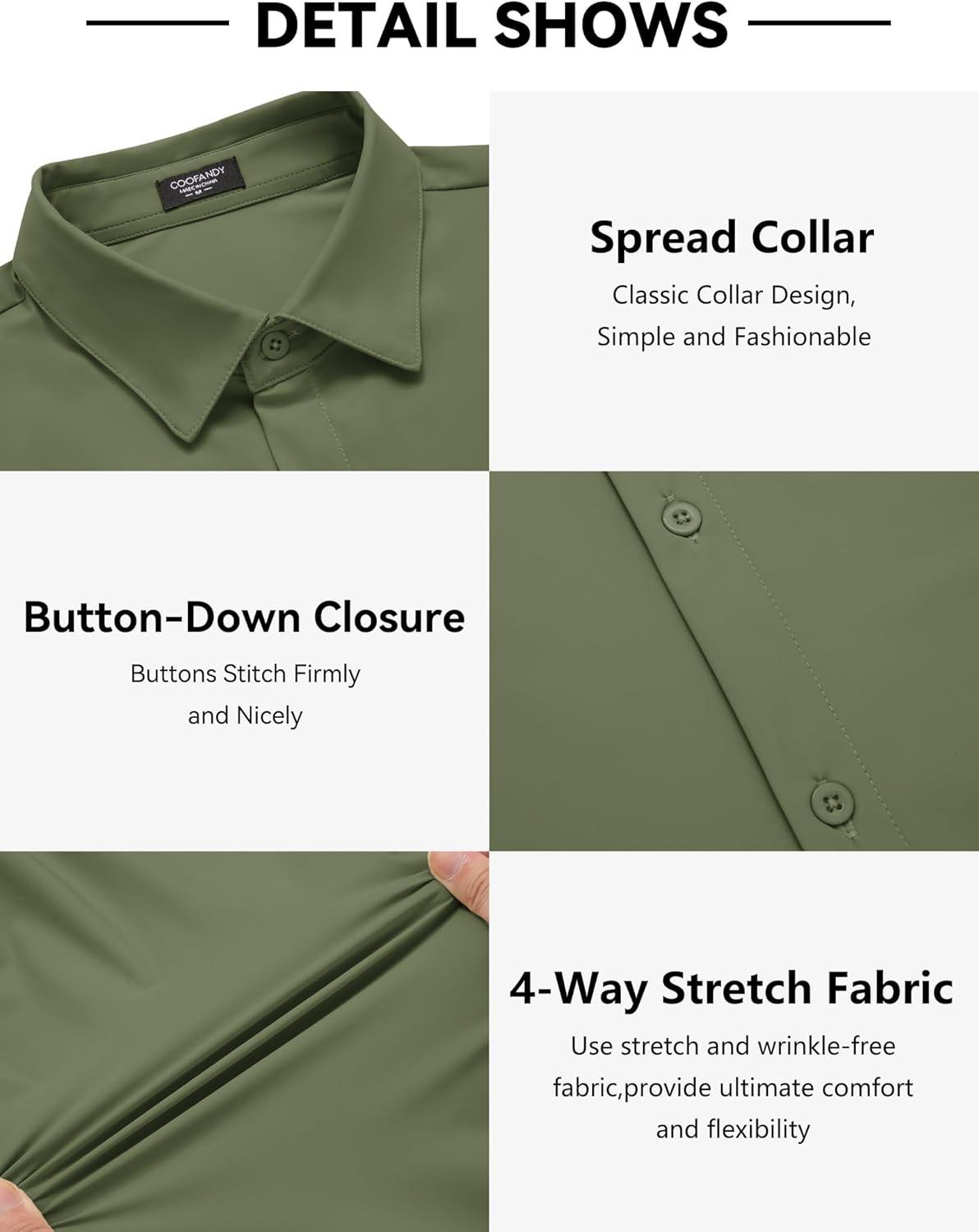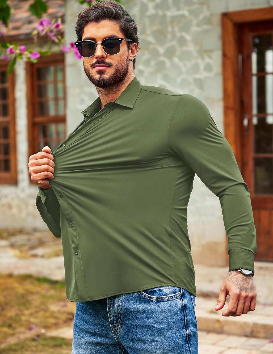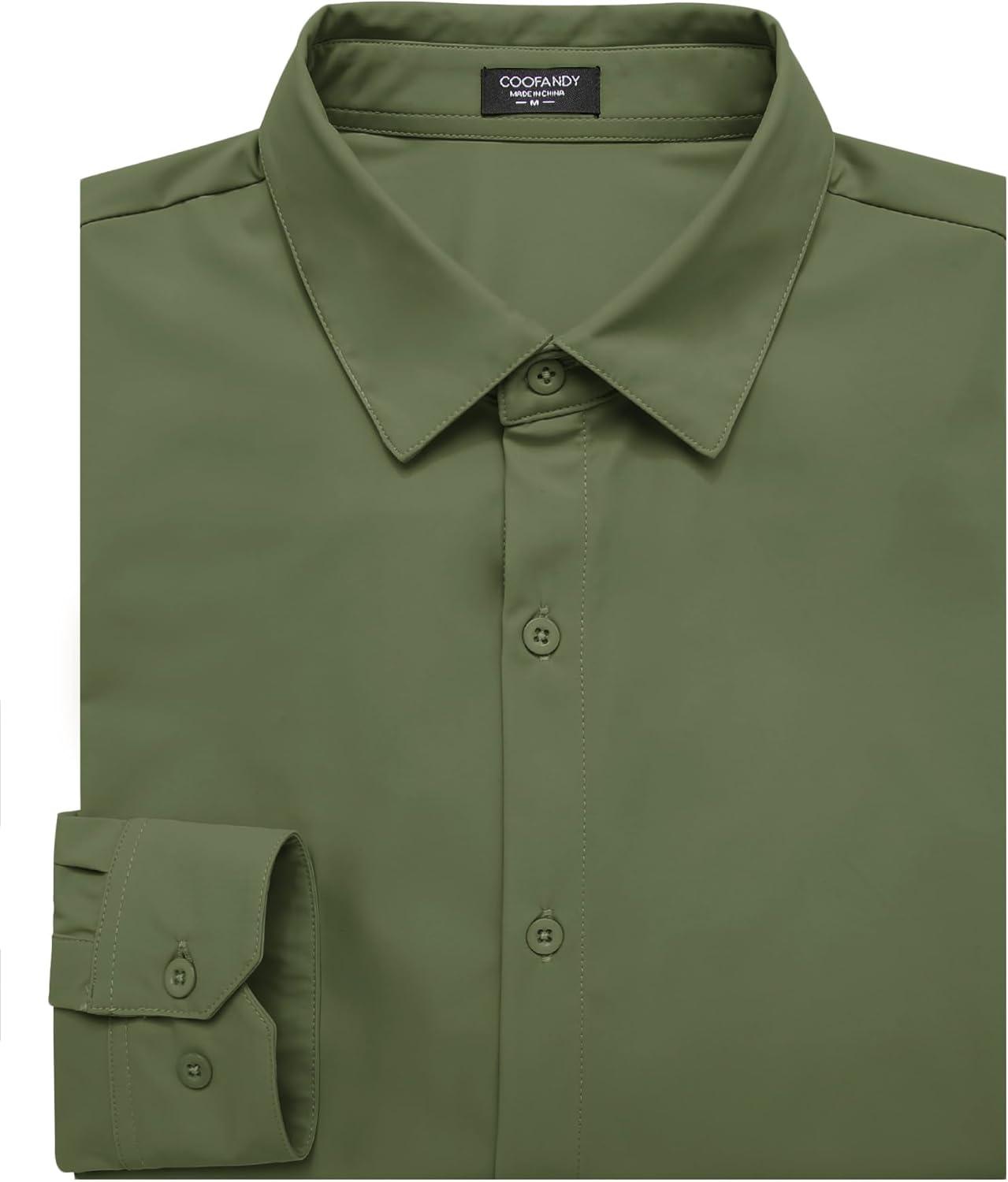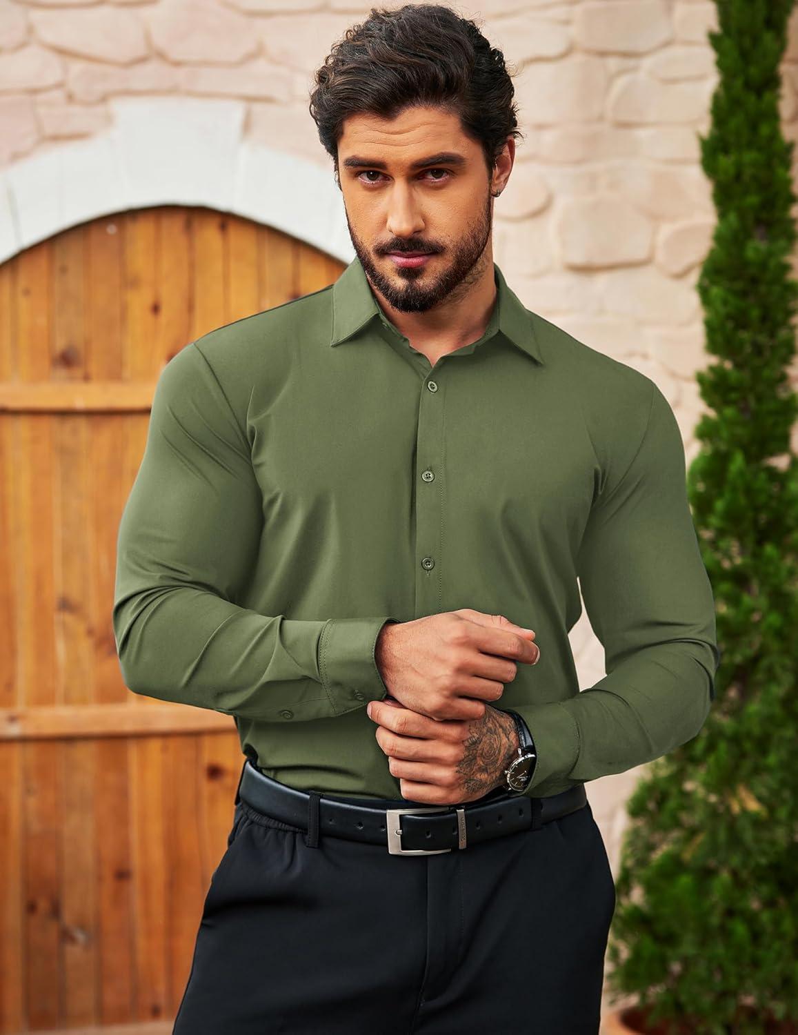 COOFANDY Men's Muscle Fit Dress Shirts Wrinkle Free Long Sleeve Button Down Shirt Stretch Business Shirt(Army Green)
