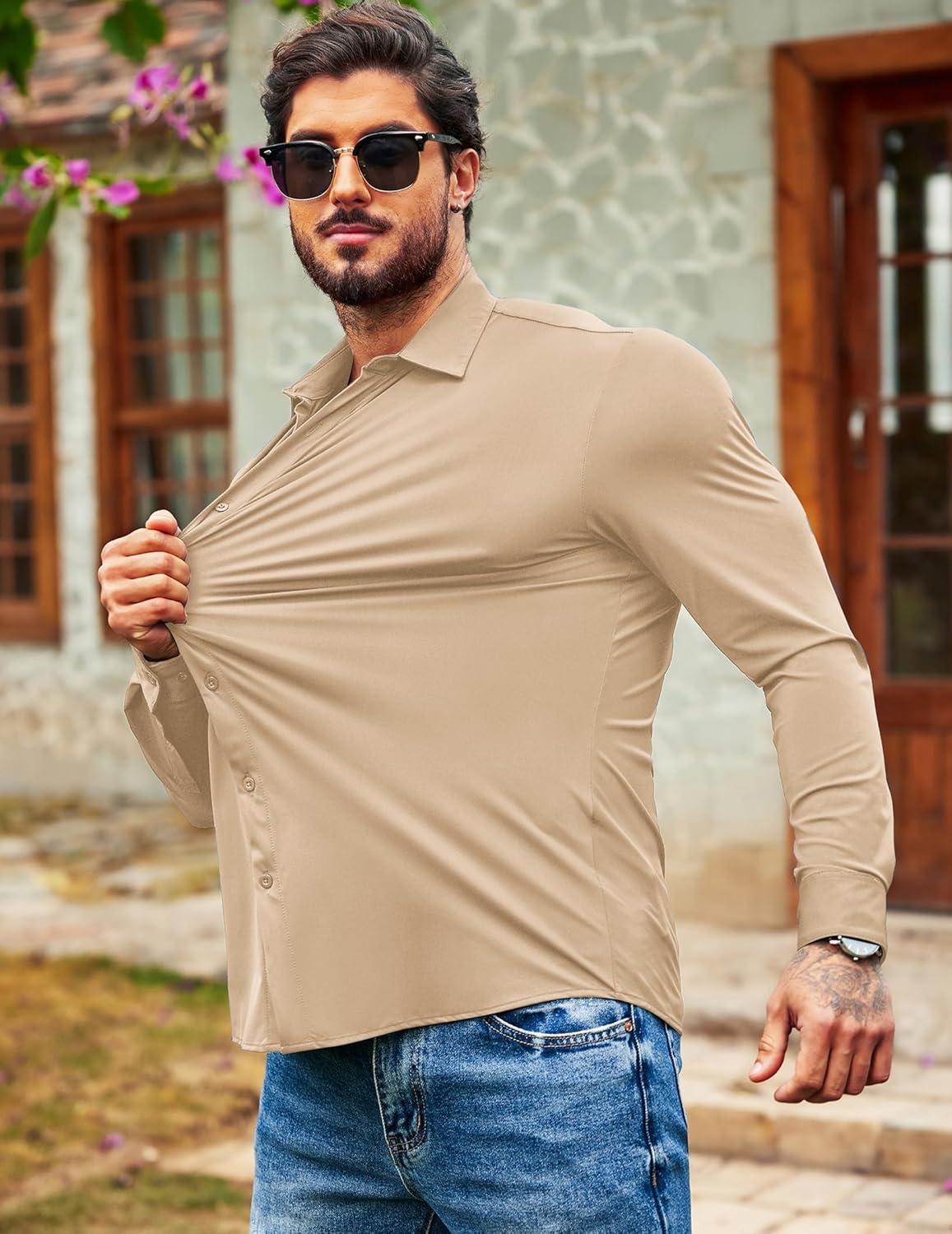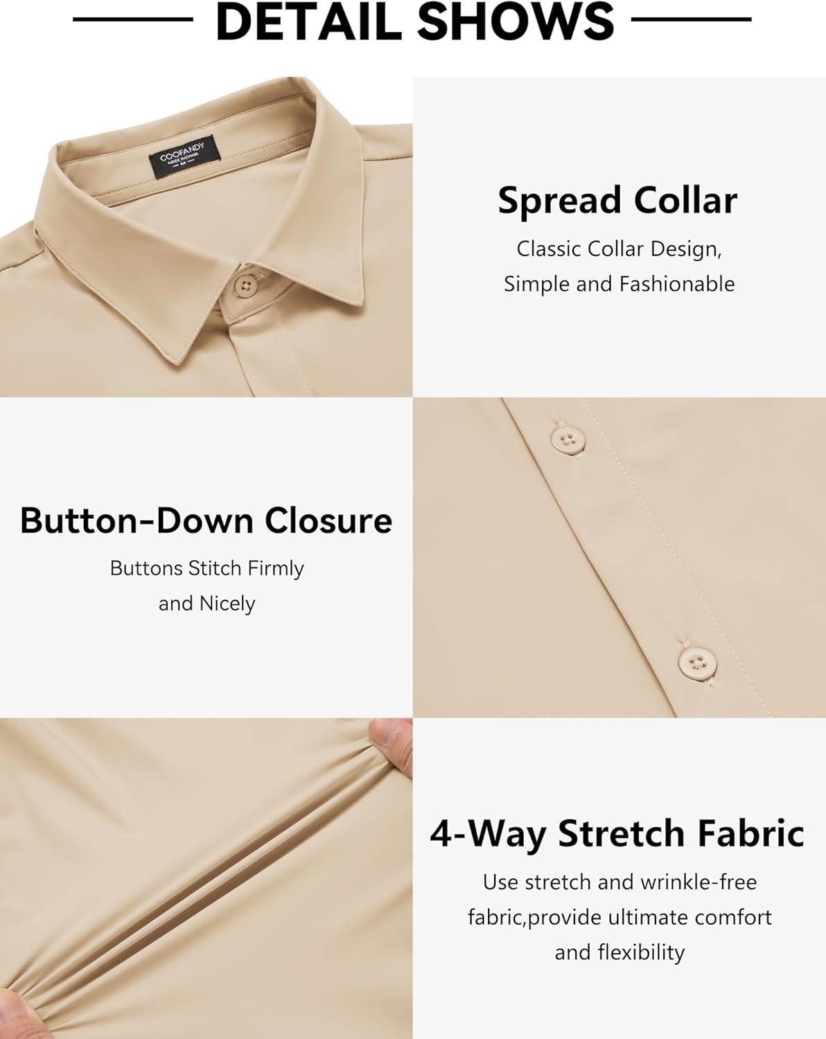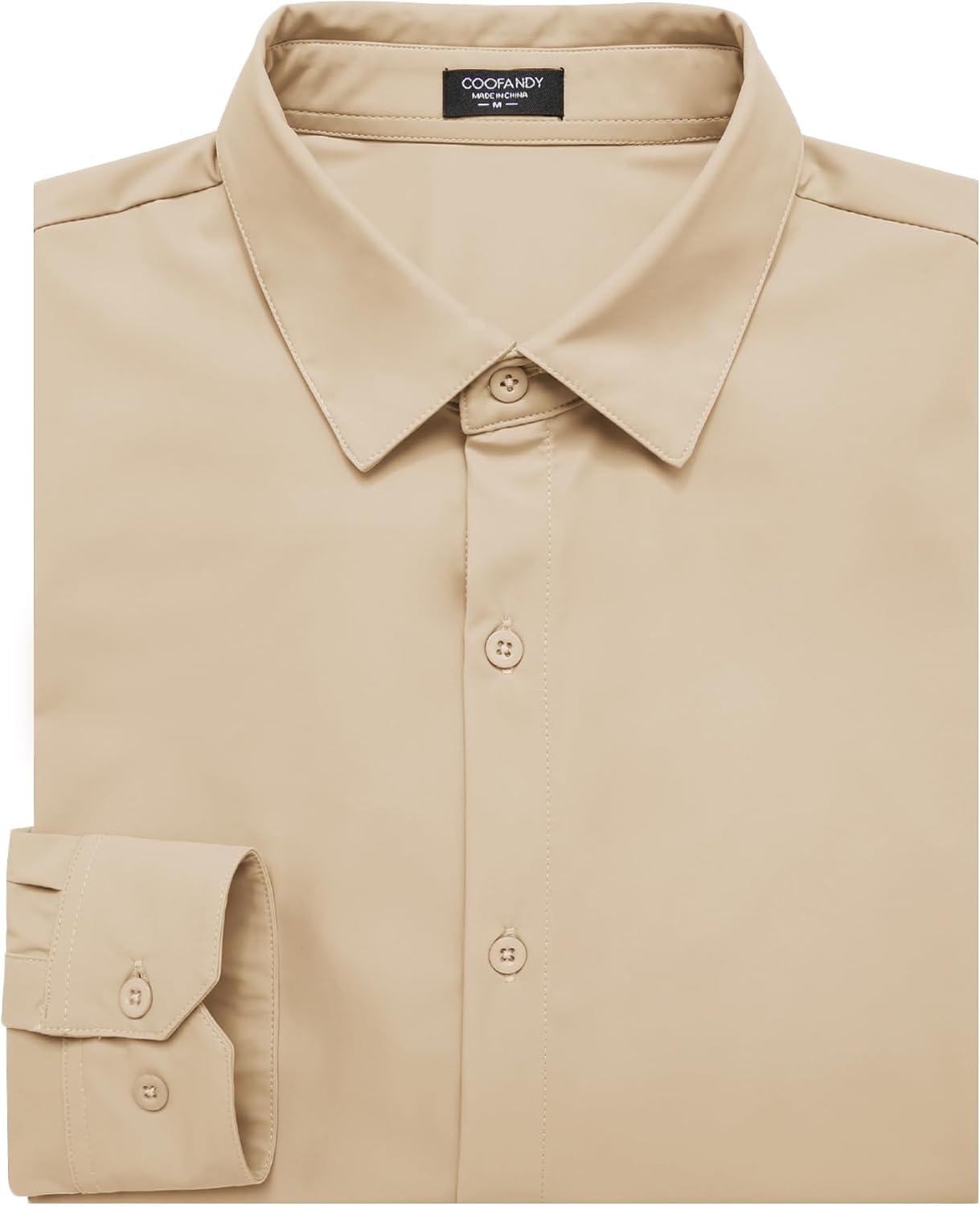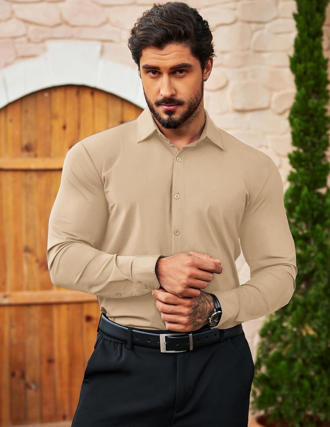 COOFANDY Men's Muscle Fit Dress Shirts Wrinkle Free Long Sleeve Button Down Shirt Stretch Business Shirt(Light Khaki)