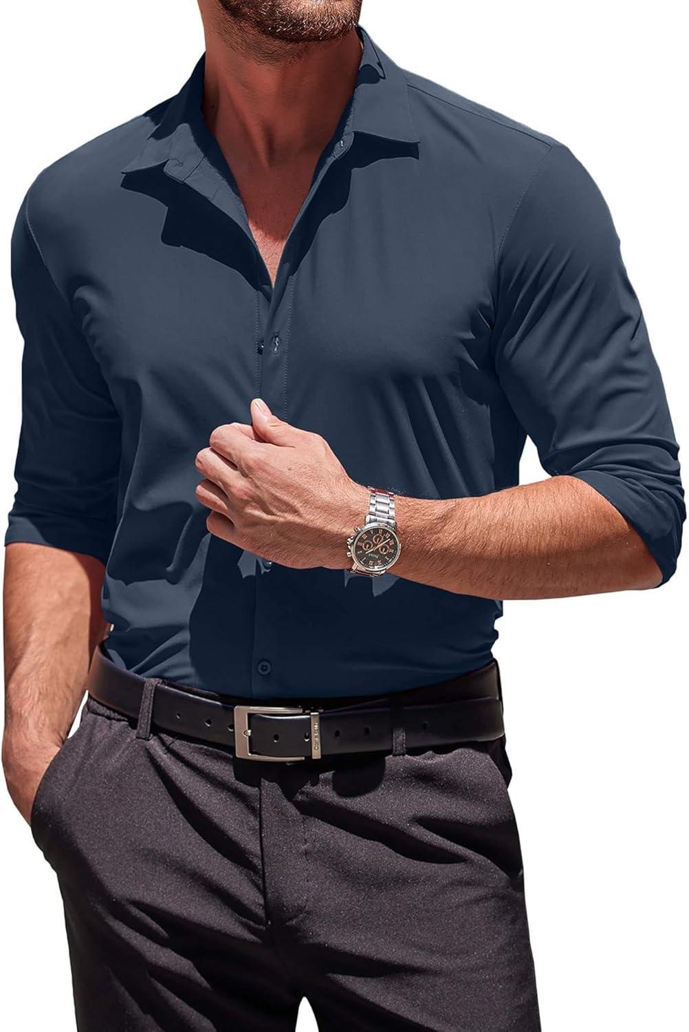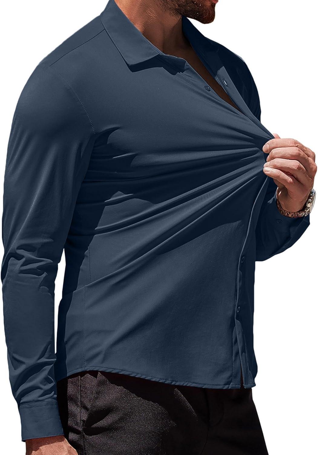 COOFANDY Men's Muscle Fit Dress Shirts Wrinkle-Free Long Sleeve Casual Button Down Shirts(Dark Blue)