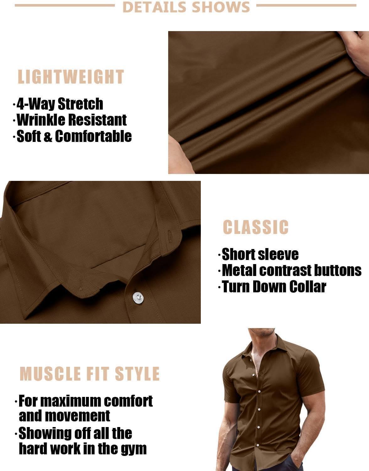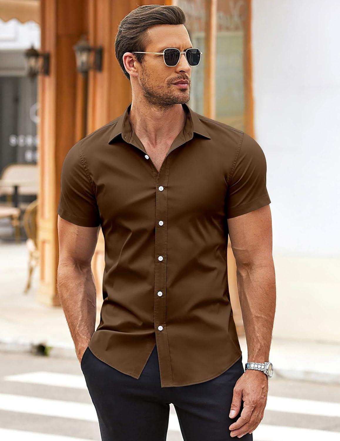 COOFANDY Men's Muscle Fit Dress Shirts Wrinkle-Free Short Sleeve Casual Button Down Shirt(Brown)