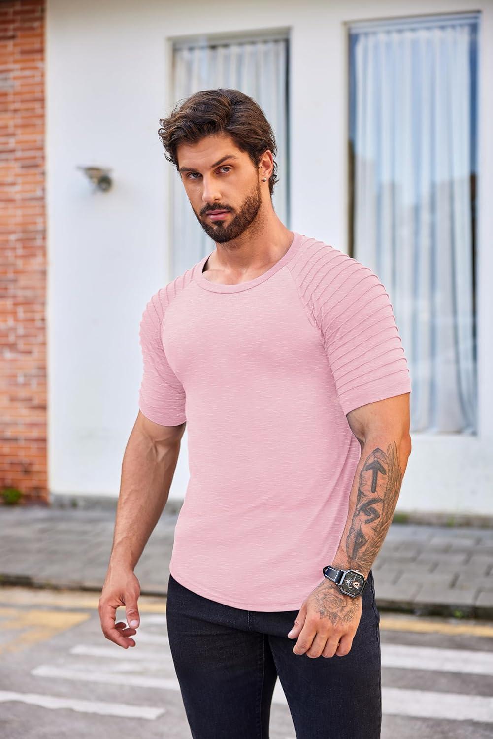 COOFANDY Men's Muscle T-Shirt Pleated Raglan Sleeve Bodybuilding Gym Tee Short Sleeve Fashion Workout Shirts Hipster Shirt(Pink)