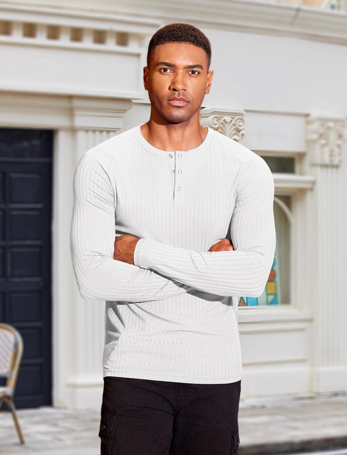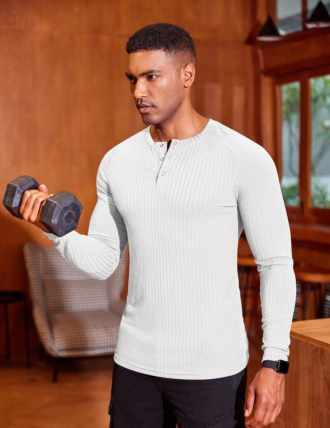 COOFANDY Men's Muscle T-Shirt Slim Fit Long Sleeve Henley Shirts Casual Gym Workout Athletic Tee Shirts(White)