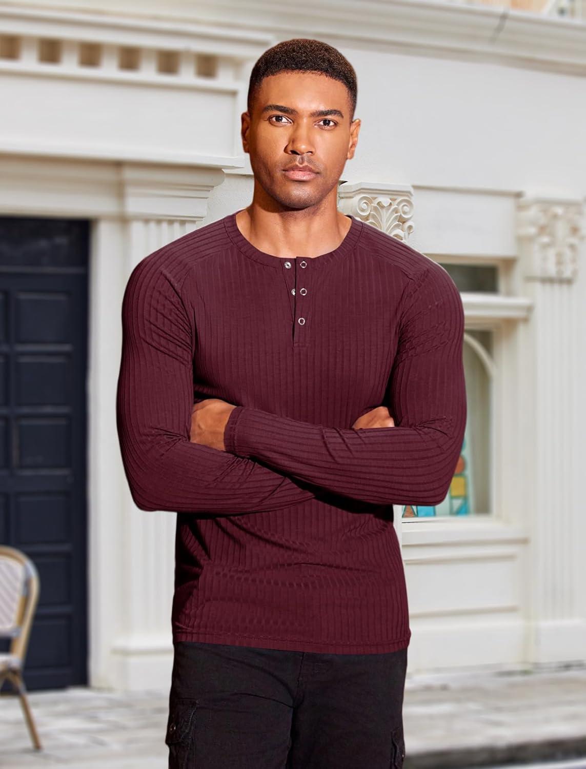 COOFANDY Men's Muscle T-Shirt Slim Fit Long Sleeve Henley Shirts Casual Gym Workout Athletic Tee Shirts(Wine Red)