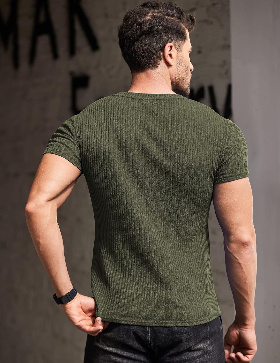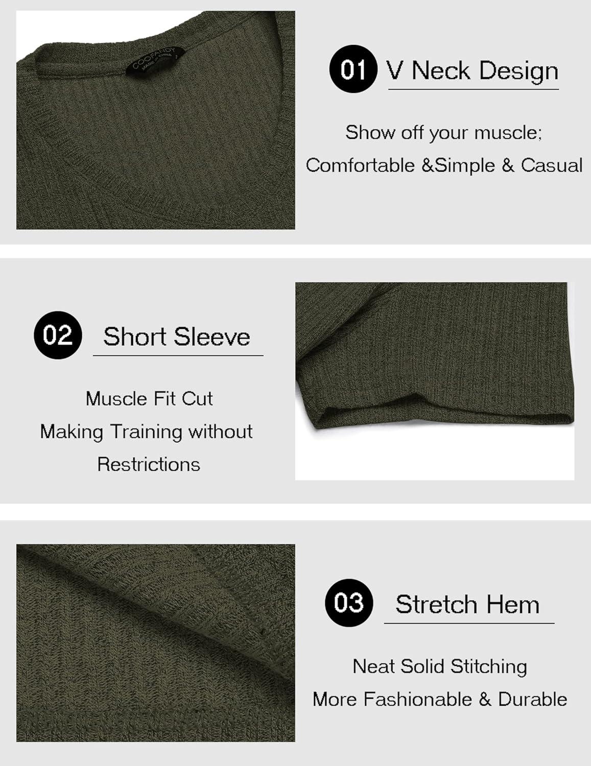 COOFANDY Men's Muscle T Shirts Stretch Short Sleeve V Neck Bodybuilding Workout Tee Shirts Ribbed Knit Shirt(Army Green)