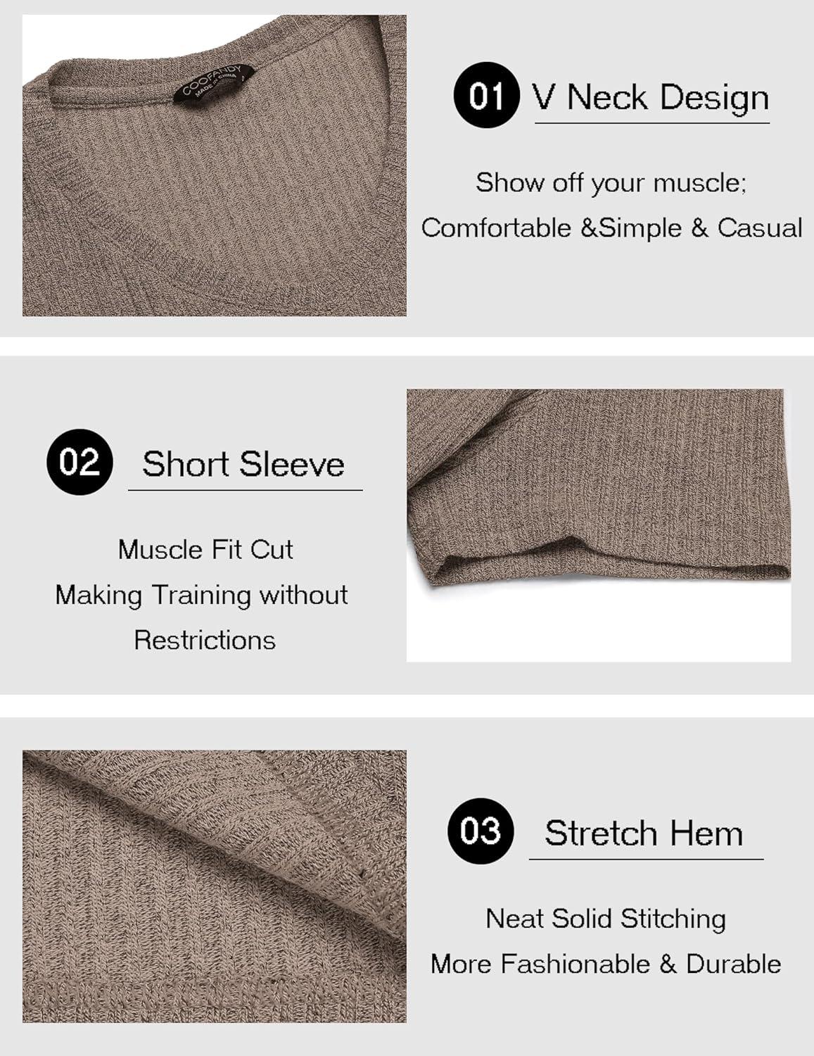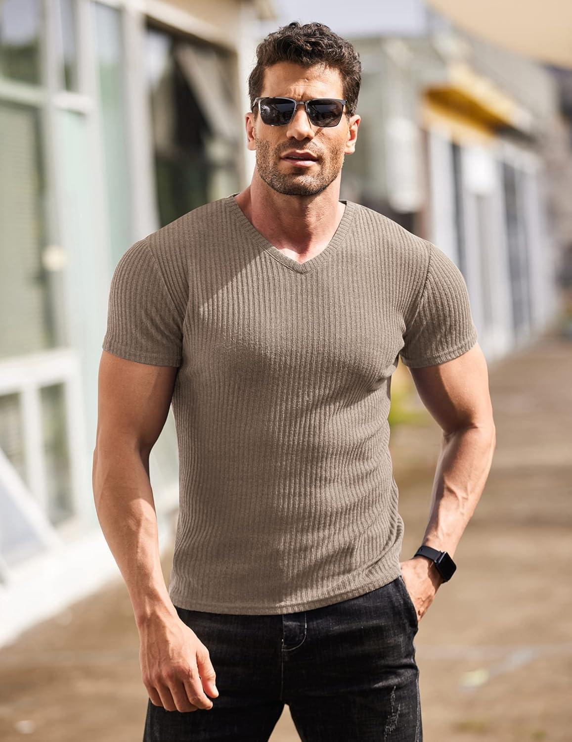 Don’t wait, get up to 50% off on COOFANDY Men’s Muscle T Shirts Stretch Short Sleeve V Neck Bodybuilding Workout Tee Shirts Ribbed Knit Shirt(Dark Khaki) during our end-of-season sale event.