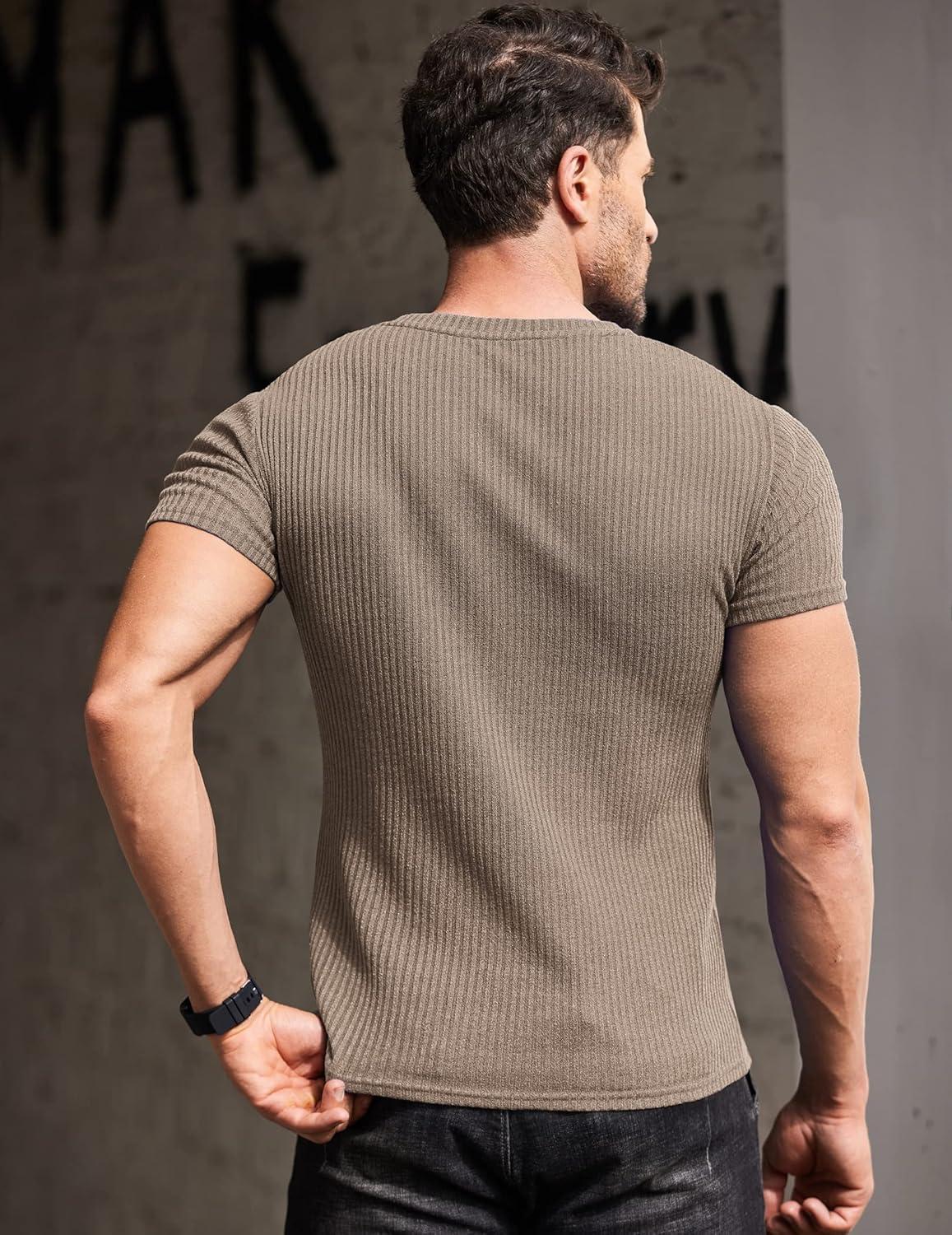 COOFANDY Men’s Muscle T Shirts Stretch Short Sleeve V Neck Bodybuilding Workout Tee Shirts Ribbed Knit Shirt(Dark Khaki)