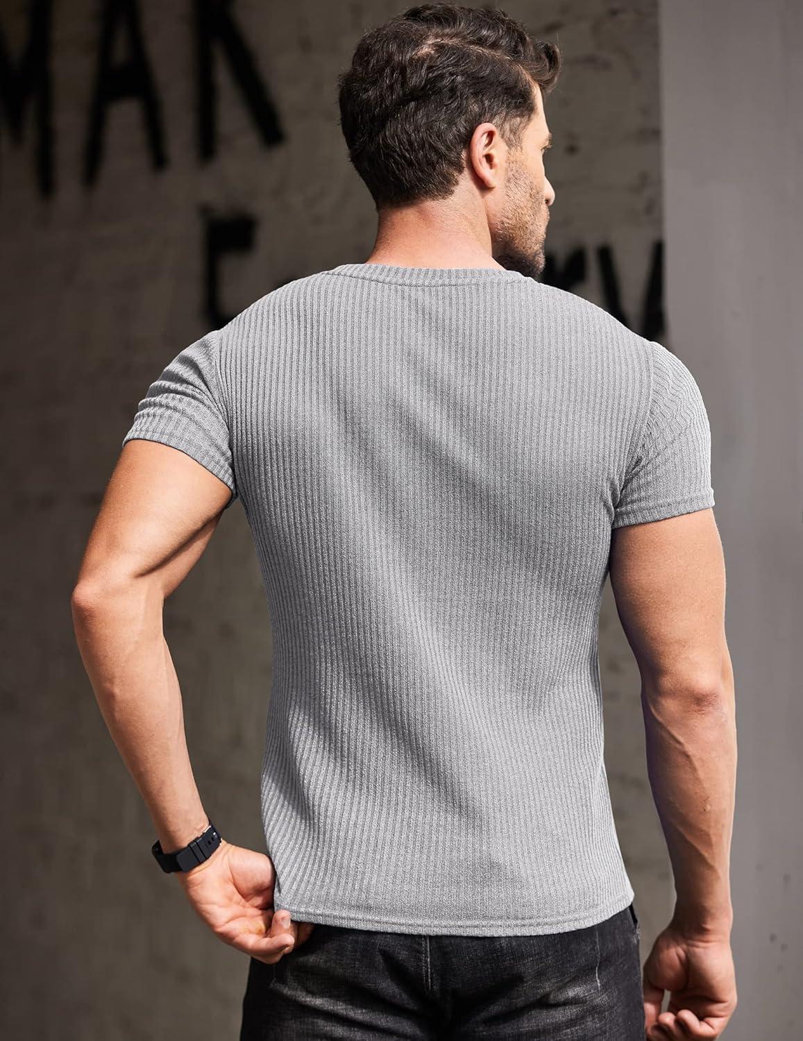 COOFANDY Men's Muscle T Shirts Stretch Short Sleeve V Neck Bodybuilding Workout Tee Shirts Ribbed Knit Shirt(Grey)
