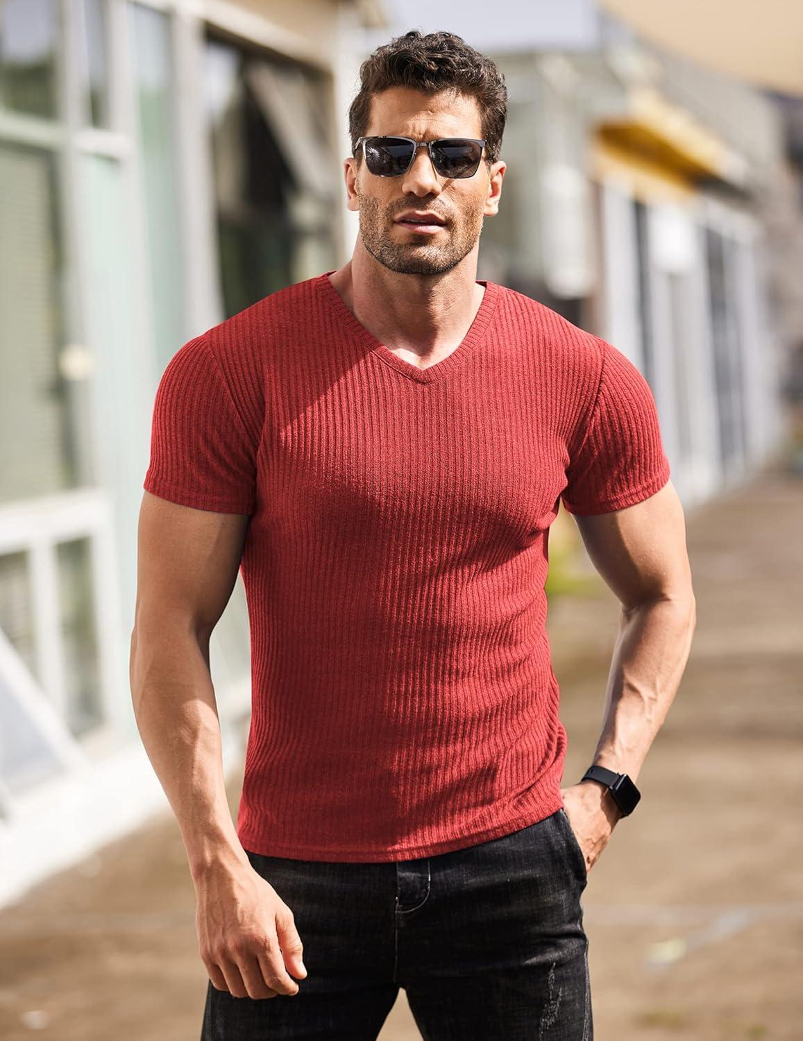COOFANDY Men’s Muscle T Shirts Stretch Short Sleeve V Neck Bodybuilding Workout Tee Shirts Ribbed Knit Shirt(Red)