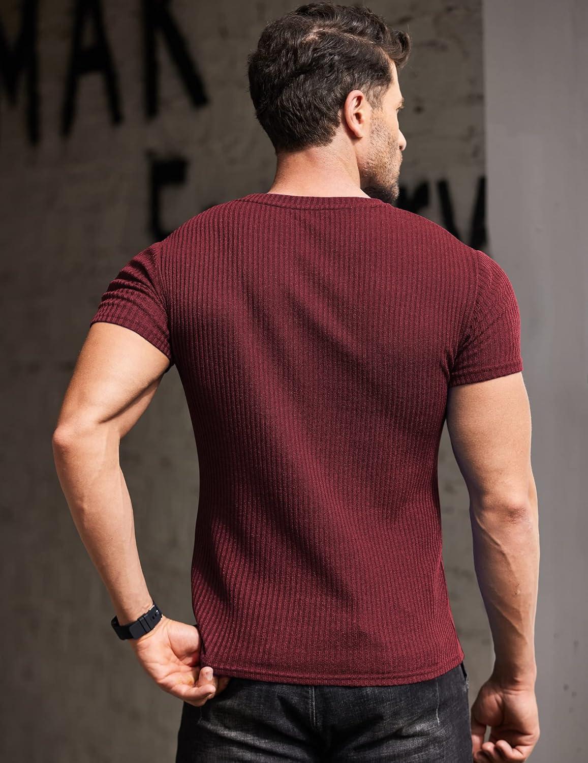 COOFANDY Men’s Muscle T Shirts Stretch Short Sleeve V Neck Bodybuilding Workout Tee Shirts Ribbed Knit Shirt(Wine Red/Dark Grey-2 Pack)