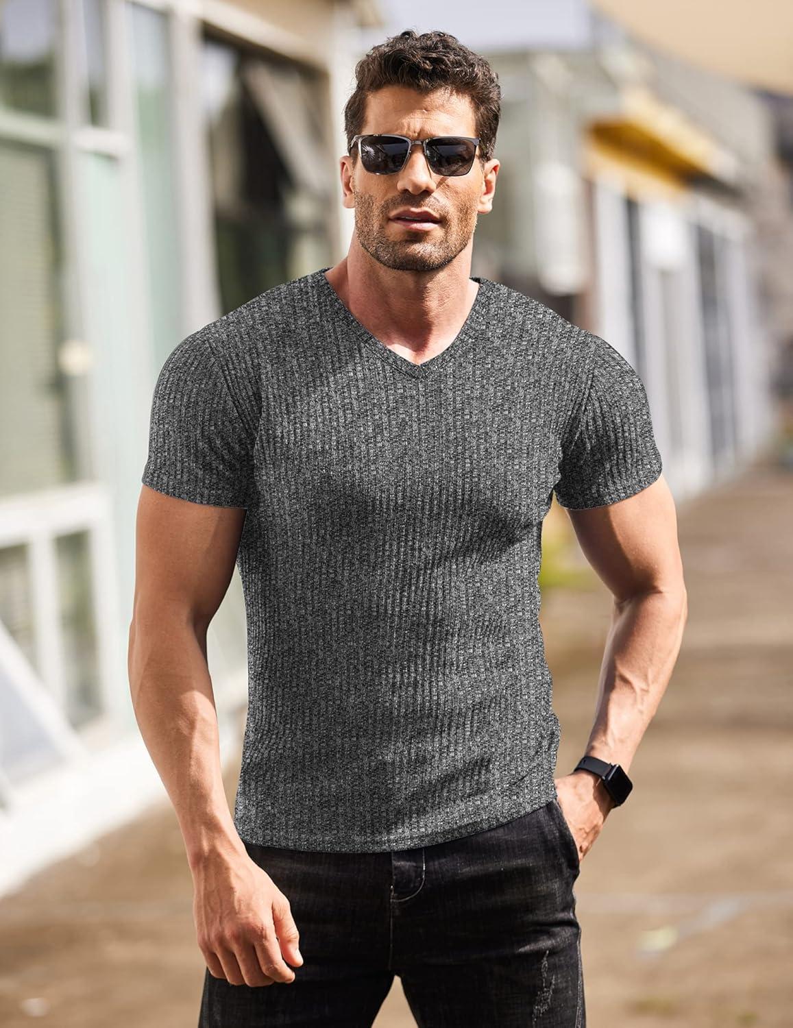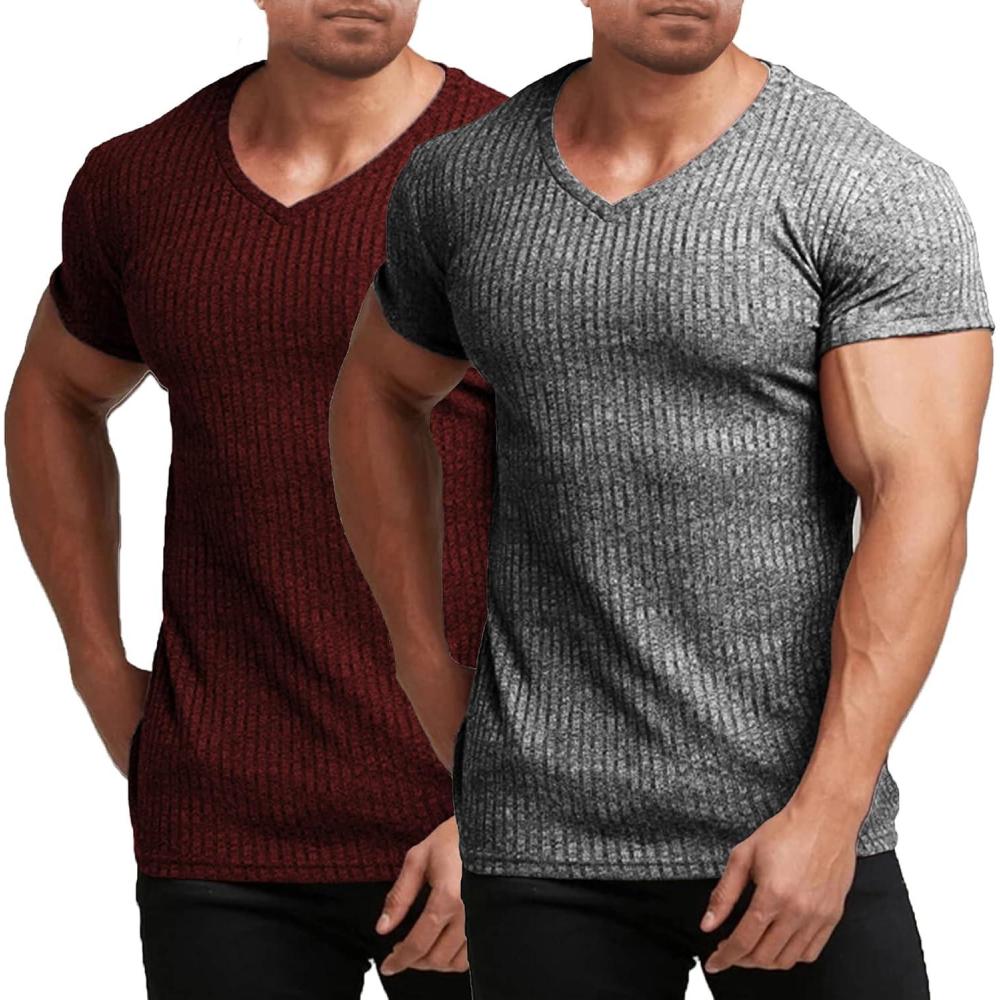 imageCOOFANDY Mens Muscle T Shirts Stretch Short Sleeve V Neck Bodybuilding Workout Tee Shirts Ribbed Knit ShirtWine RedDark Grey2 Pack