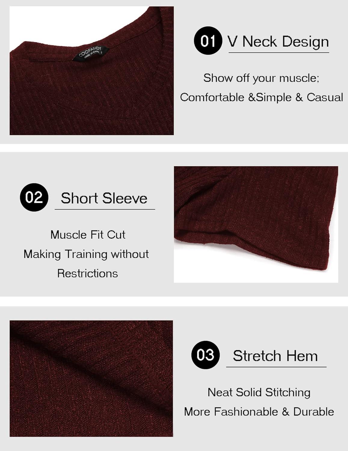 imageCOOFANDY Mens Muscle T Shirts Stretch Short Sleeve V Neck Bodybuilding Workout Tee Shirts Ribbed Knit ShirtWine Red